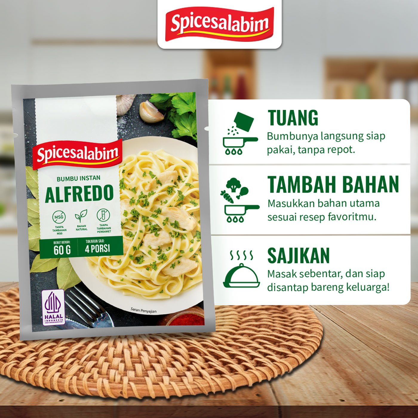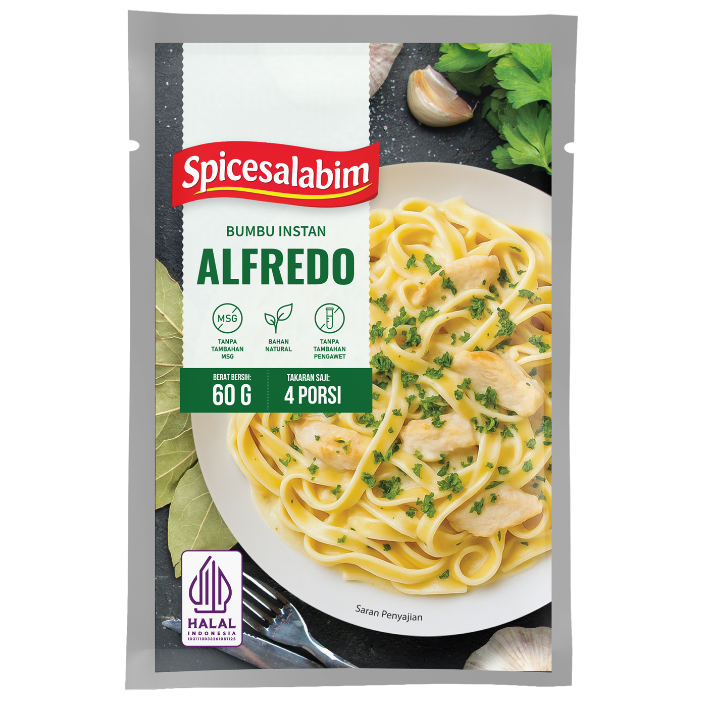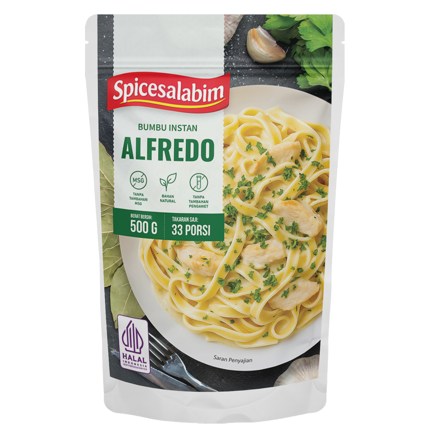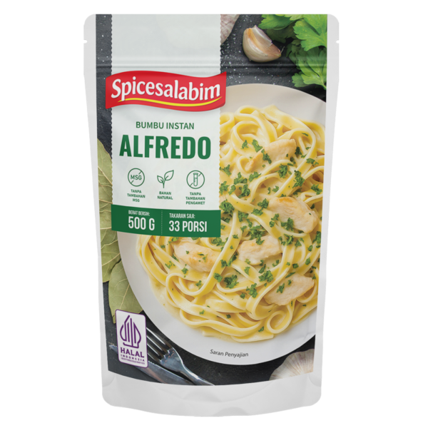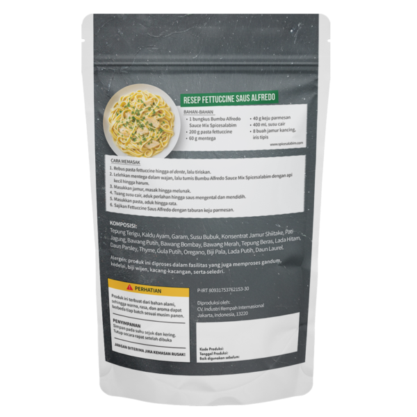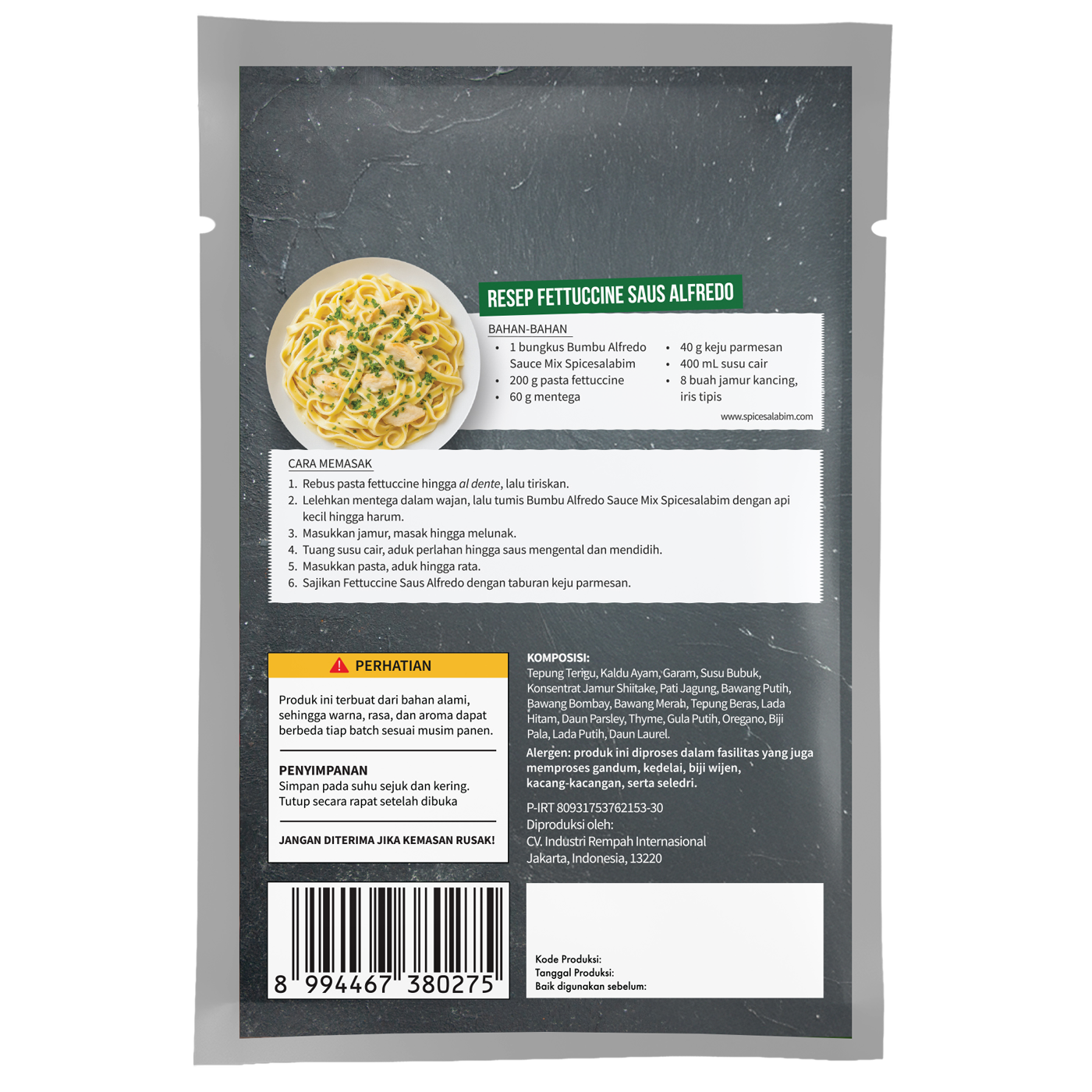– Komposisi Bumbu Alfredo Spicesalabim – Tepung Terigu, Kaldu Ayam, Garam, Susu Bubuk, Konsentrat Jamur Shiitake, Pati Jagung, Bawang Putih, Bawang Bombay, Bawang Merah, Tepung Beras, Lada Hitam, Daun Parsley, Thyme, Gula Putih, Oregano, Biji Pala, Lada Putih, Daun Laurel