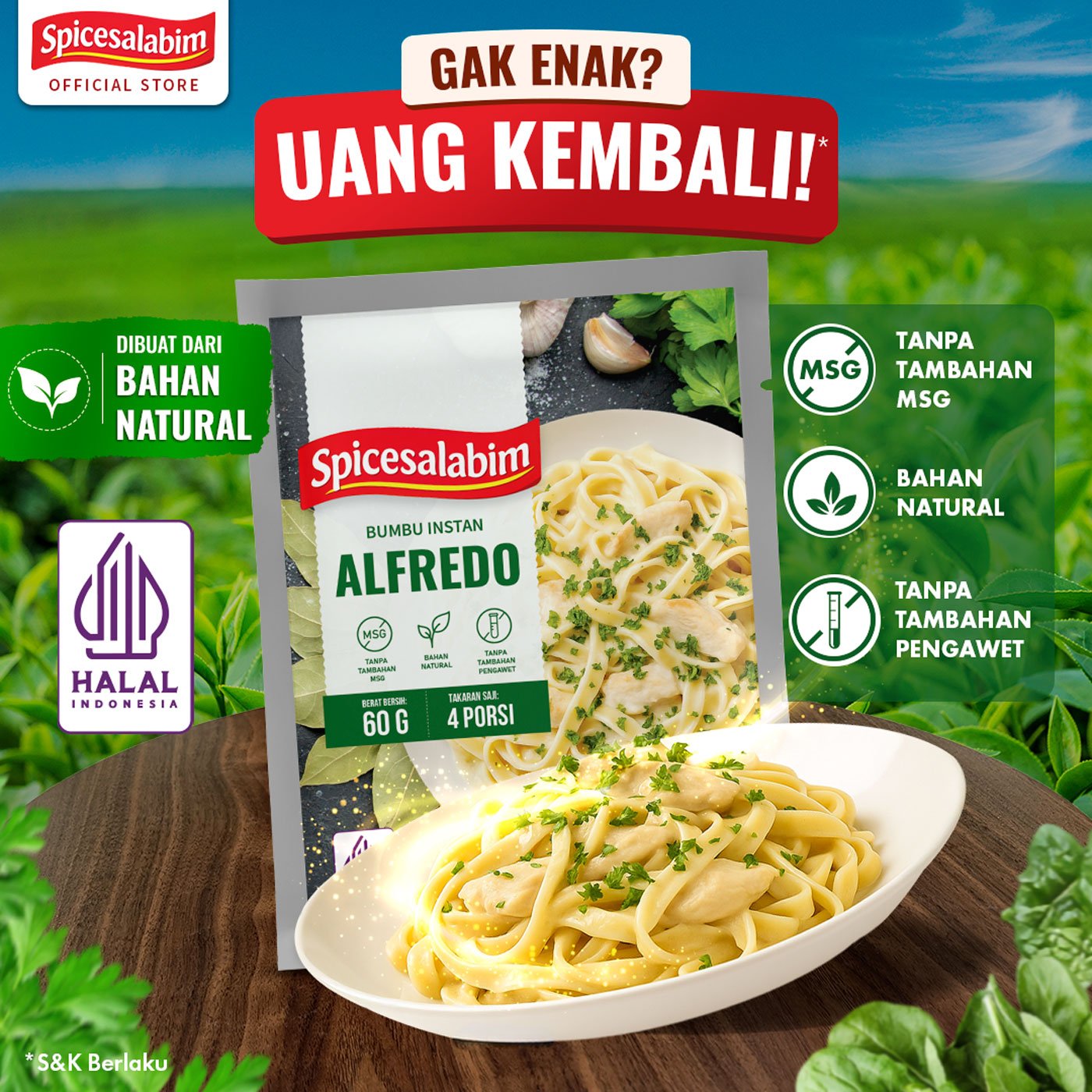 Bumbu Alfredo Spicesalabim, bumbu instan yang diracik khusus buat kamu yang mau masak praktis dengan rempah yang natural. Terbuat dari rempah asli, tanpa tambahan MSG, tanpa pengawet, dan tanpa bahan berbahaya. Cukup satu bumbu untuk bikin masakan gurih, enak, dan sehat.