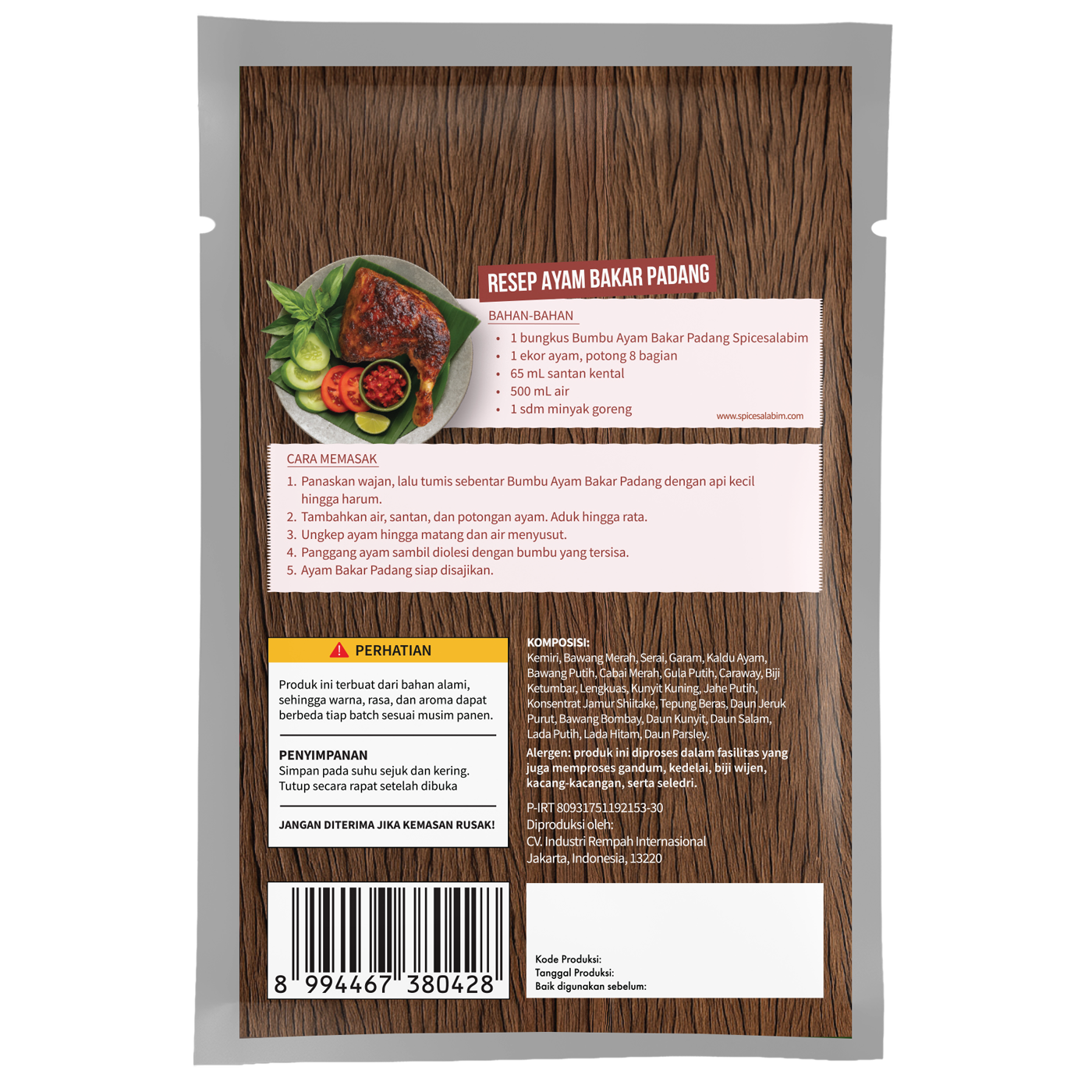 – Komposisi Bumbu Ayam Bakar Padang Spicesalabim – Kemiri, Bawang Merah, Serai, Garam, Kaldu Ayam, Bawang Putih, Cabai Merah, Gula Putih, Caraway, Biji Ketumbar, Lengkuas, Kunyit Kuning, Jahe Putih, Konsentrat Jamur Shiitake, Tepung Beras, Daun Jeruk Purut, Bawang Bombay, Daun Kunyit, Daun Salam, Lada Putih, Lada Hitam, Daun Parsley