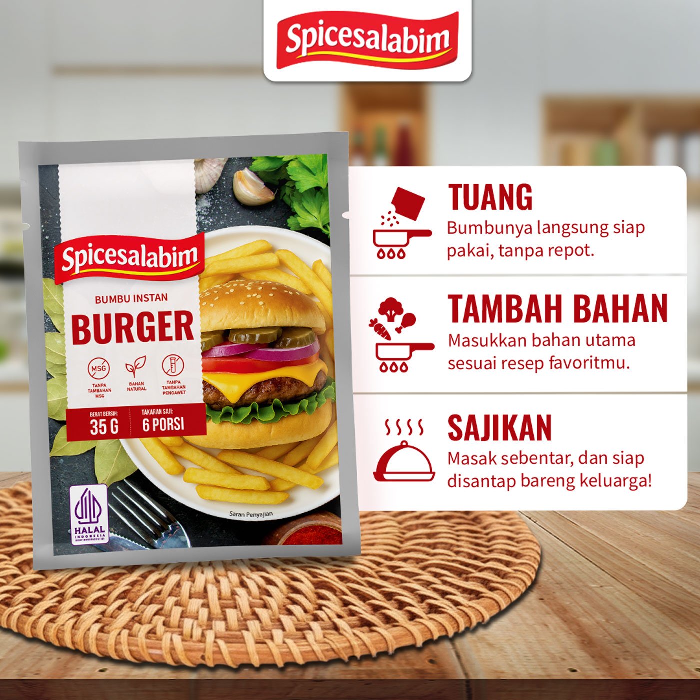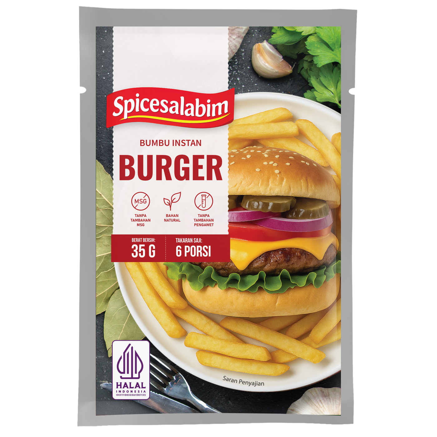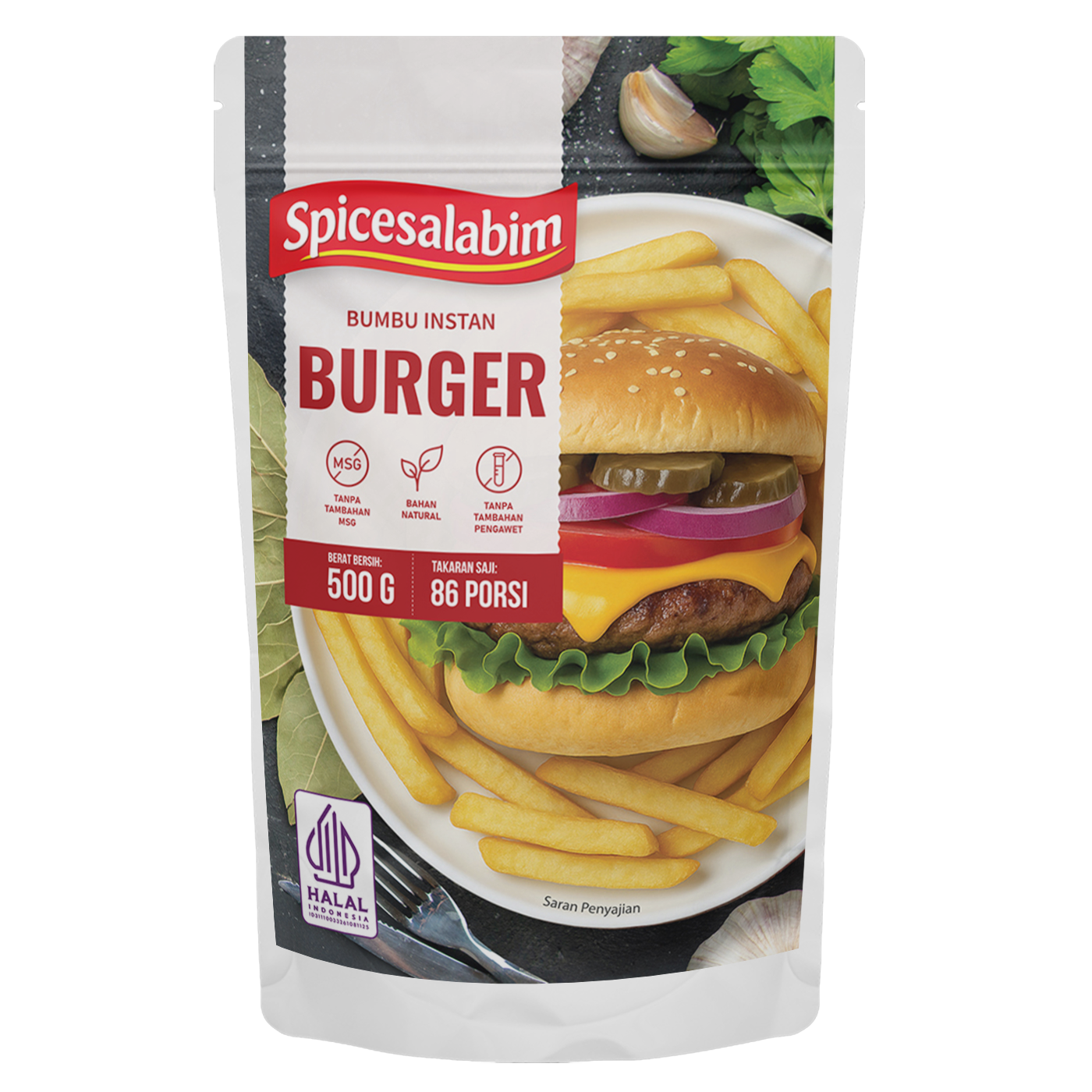 – Komposisi Bumbu Burger Spicesalabim – Garam, Paprika, Kaldu Sapi, Lada Hitam, Bawang Bombay, Bawang Putih, Gula, Cabai Merah, Konsentrat Jamur Shiitake, Tepung Beras, Cumin, Bawang Merah, Daun Laurel, Lada Putih, Biji Pala, Daun Parsley