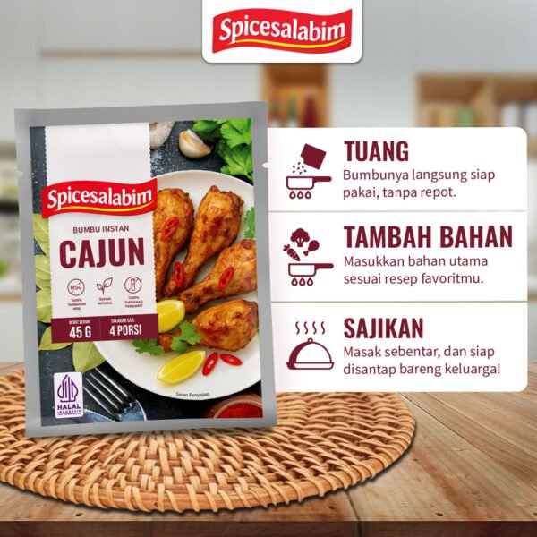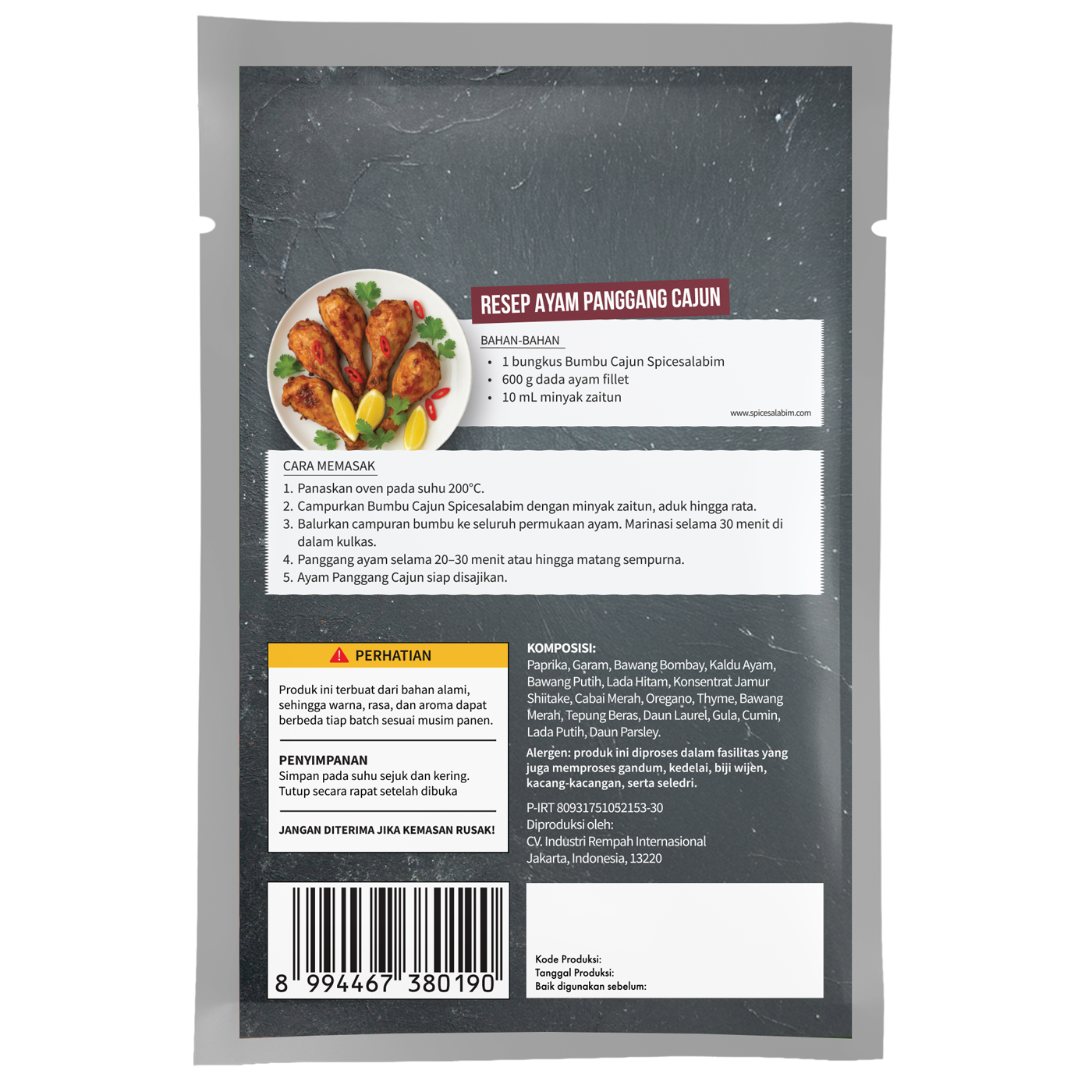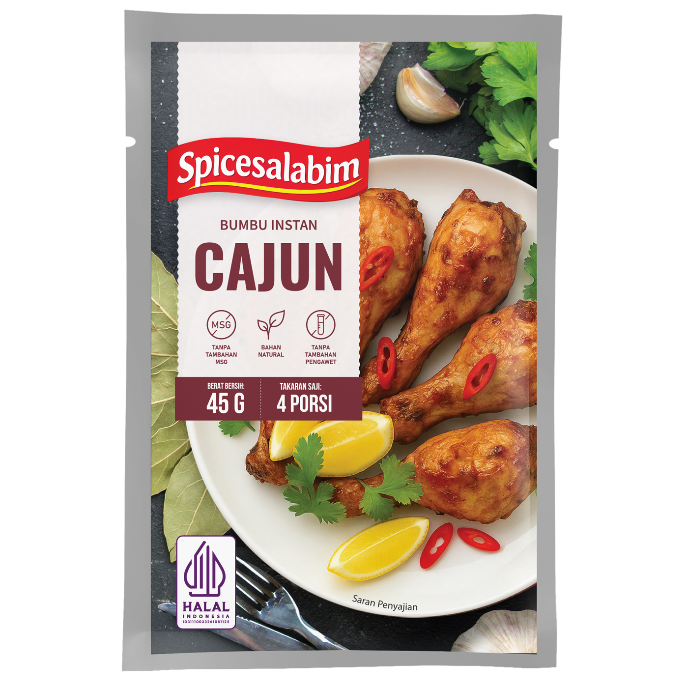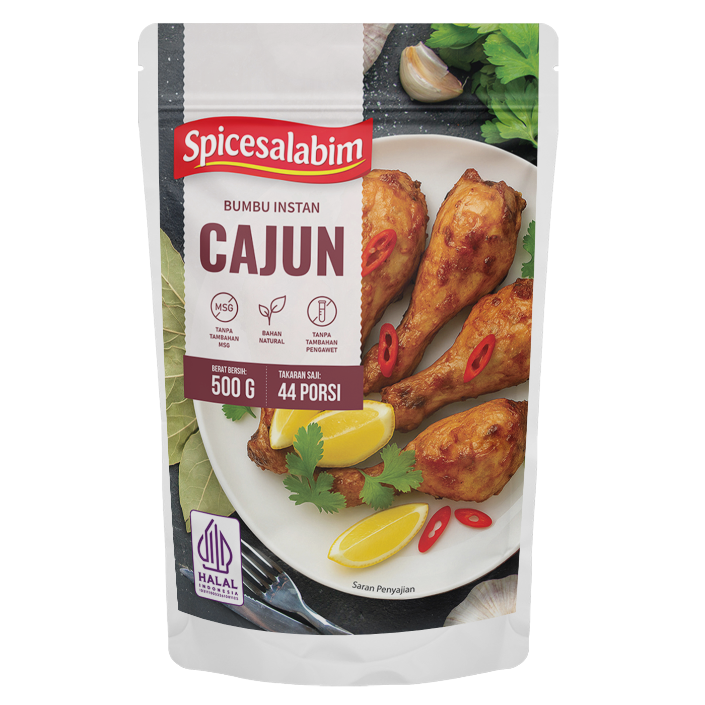– Komposisi Bumbu Cajun Spicesalabim – Paprika, Garam, Bawang Bombay, Kaldu Ayam, Bawang Putih, Lada Hitam, Konsentrat Jamur Shiitake, Cabai Merah, Oregano, Thyme, Bawang Merah, Tepung Beras, Daun Laurel, Gula, Cumin, Lada Putih, Daun Parsley
