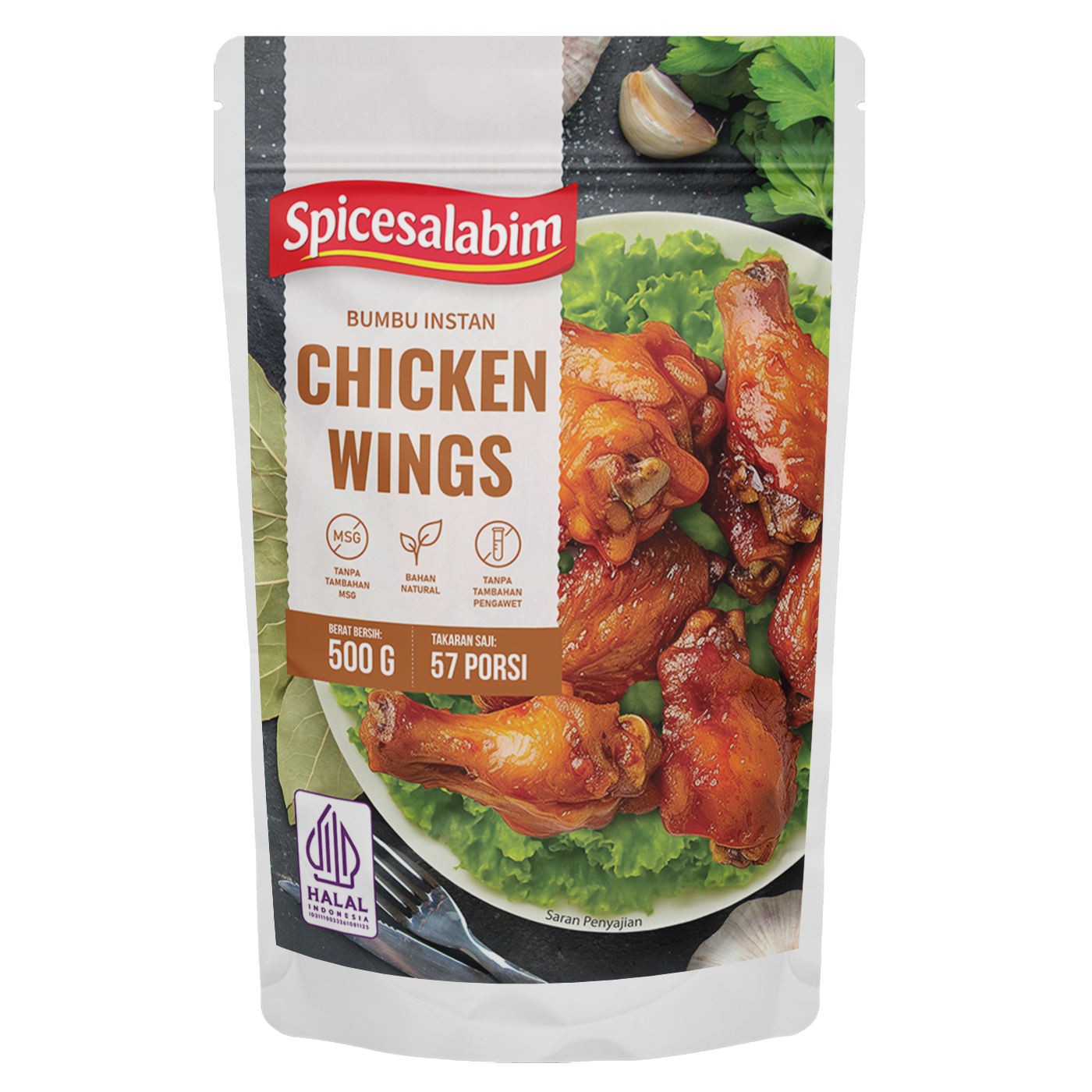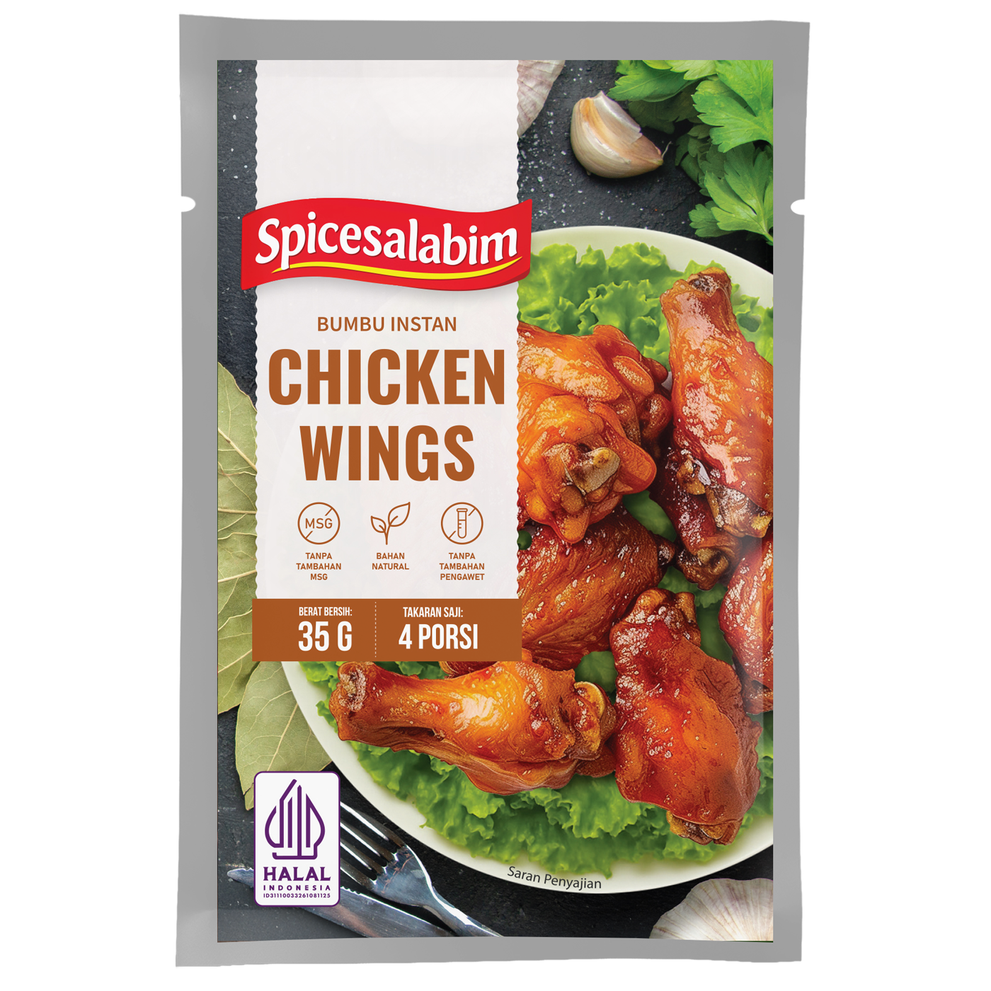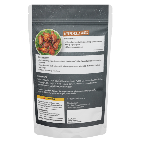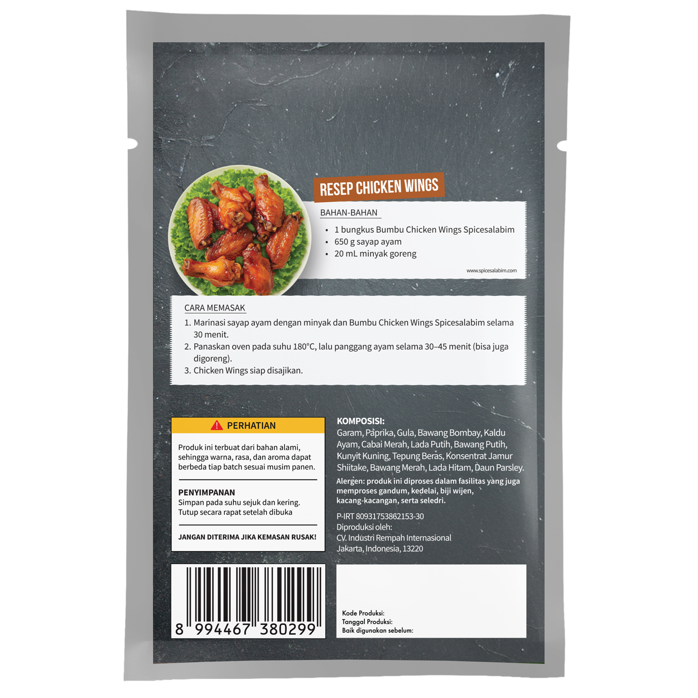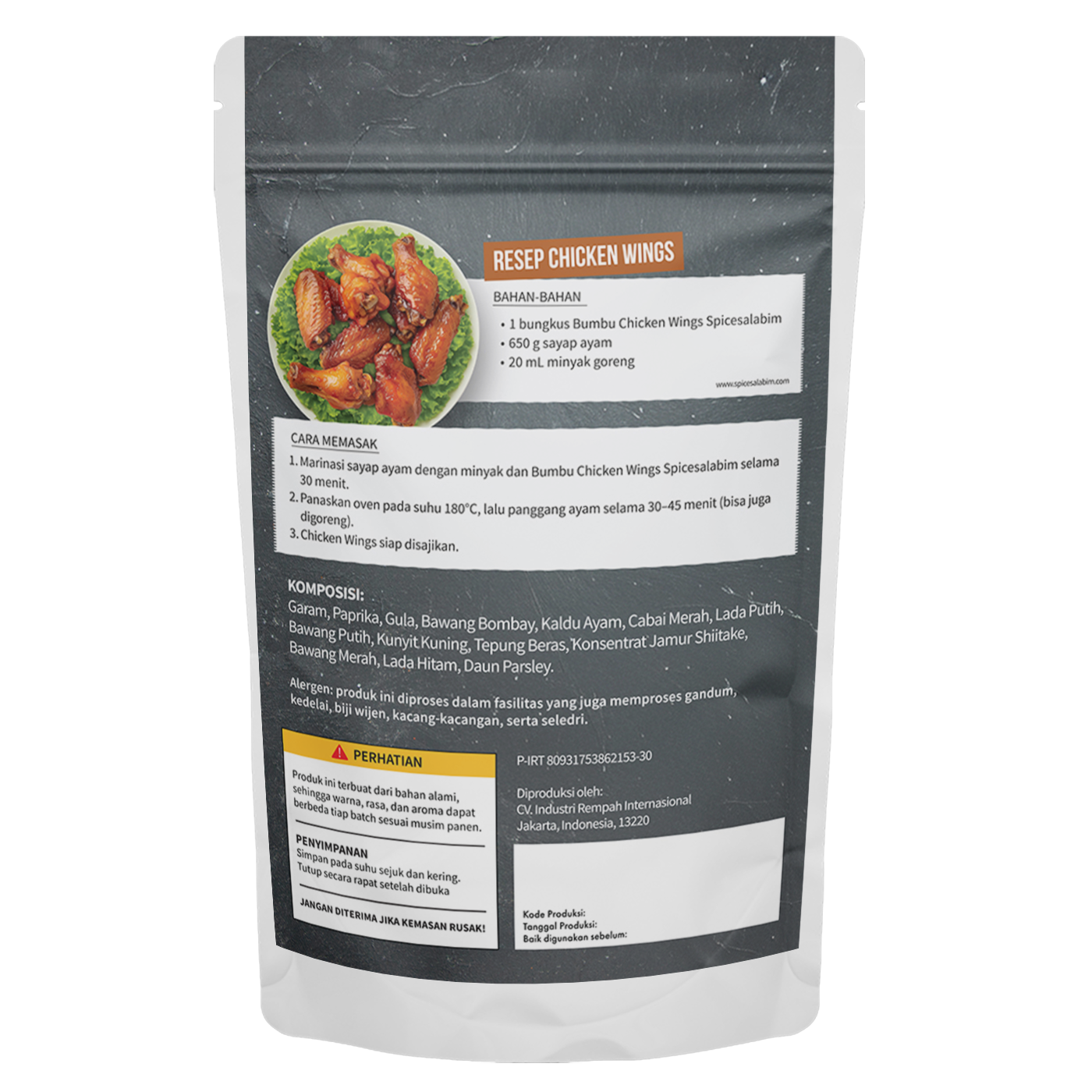 – Komposisi Bumbu Chicken Wings Spicesalabim – Garam, Paprika, Gula, Bawang Bombay, Kaldu Ayam, Cabai Merah, Lada Putih, Bawang Putih, Kunyit Kuning, Tepung Beras, Konsentrat Jamur Shiitake, Bawang Merah, Lada Hitam, Daun Parsley