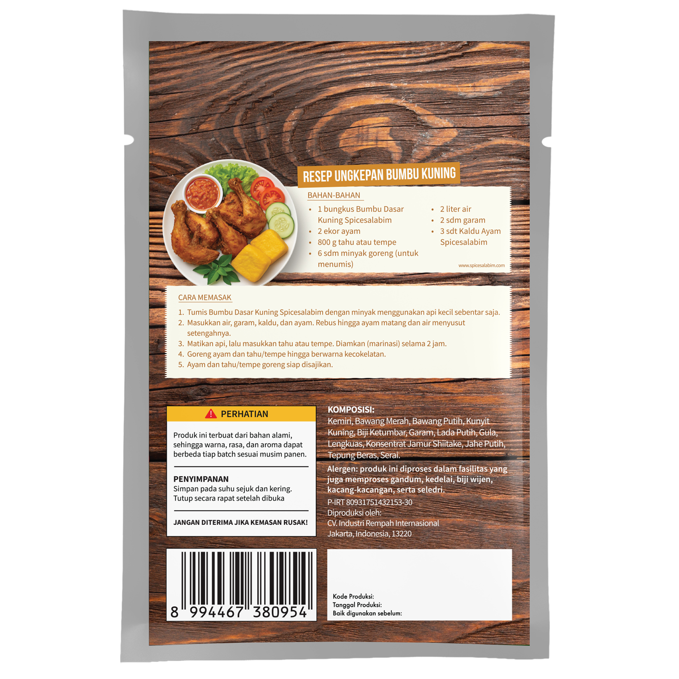 – Komposisi Bumbu Dasar Kuning Spicesalabim – Kemiri, Bawang Merah, Bawang Putih, Kunyit Kuning, Biji Ketumbar, Garam, Lada Putih, Gula, Lengkuas, Konsentrat Jamur Shiitake, Jahe Putih, Tepung Beras, Serai