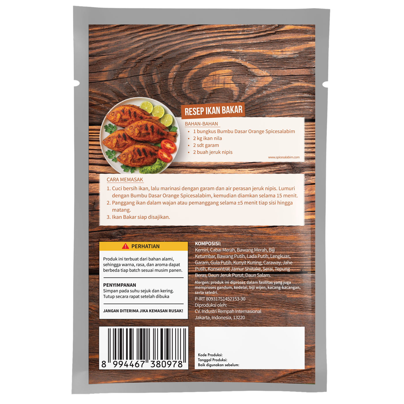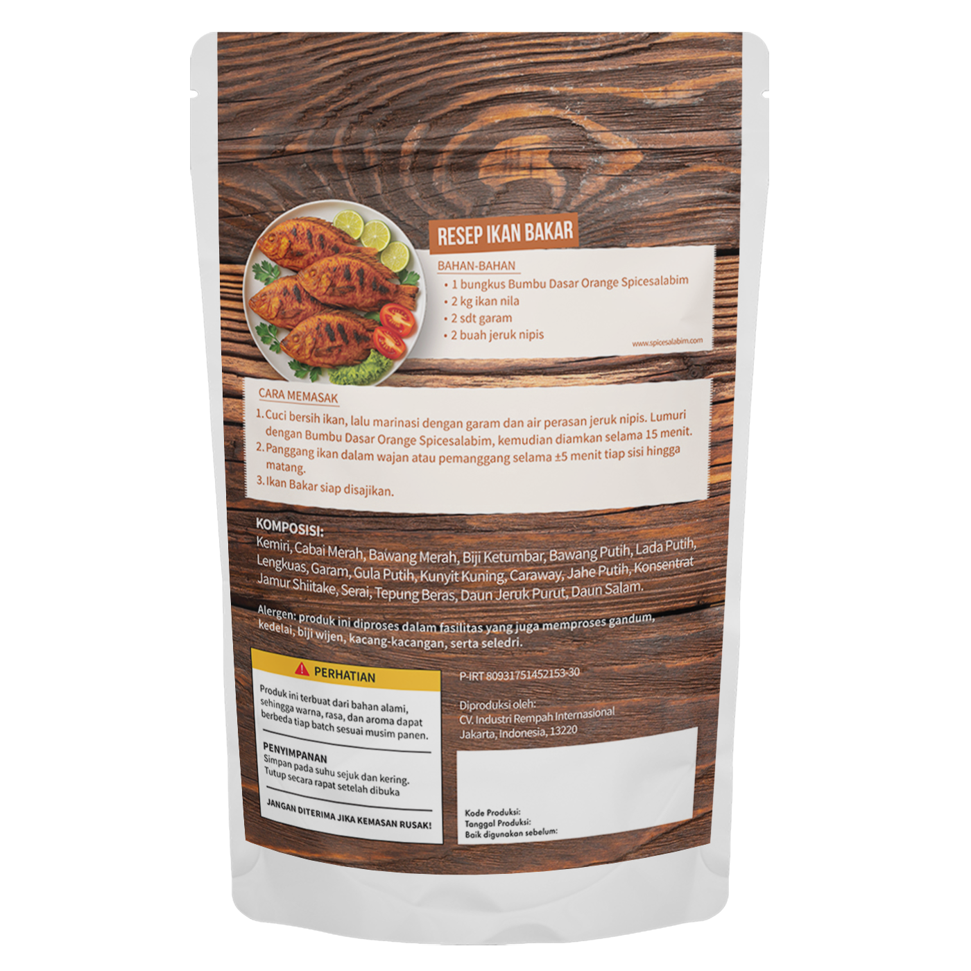 – Komposisi Bumbu Dasar Orange Spicesalabim – Kemiri, Cabai Merah, Bawang Merah, Biji Ketumbar, Bawang Putih, Lada Putih, Lengkuas, Garam, Gula Putih, Kunyit Kuning, Caraway, Jahe Putih, Konsentrat Jamur Shiitake, Serai, Tepung Beras, Daun Jeruk Purut, Daun Salam
