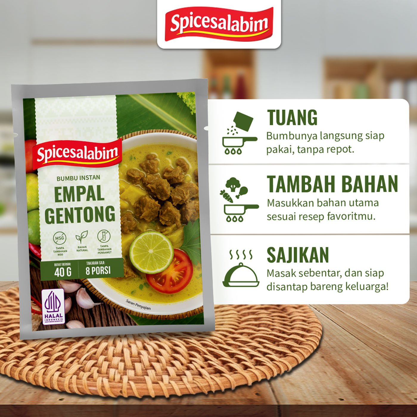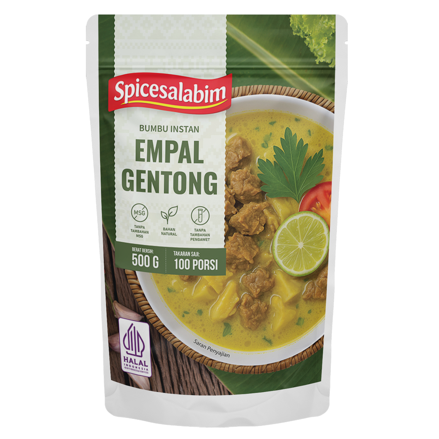 Bumbu Empal Gentong Spicesalabim, bumbu instan yang diracik khusus buat kamu yang mau masak praktis dengan rempah yang natural. Terbuat dari rempah asli, tanpa tambahan MSG, tanpa pengawet, dan tanpa bahan berbahaya. Cukup satu bumbu untuk bikin masakan gurih, enak, dan sehat.