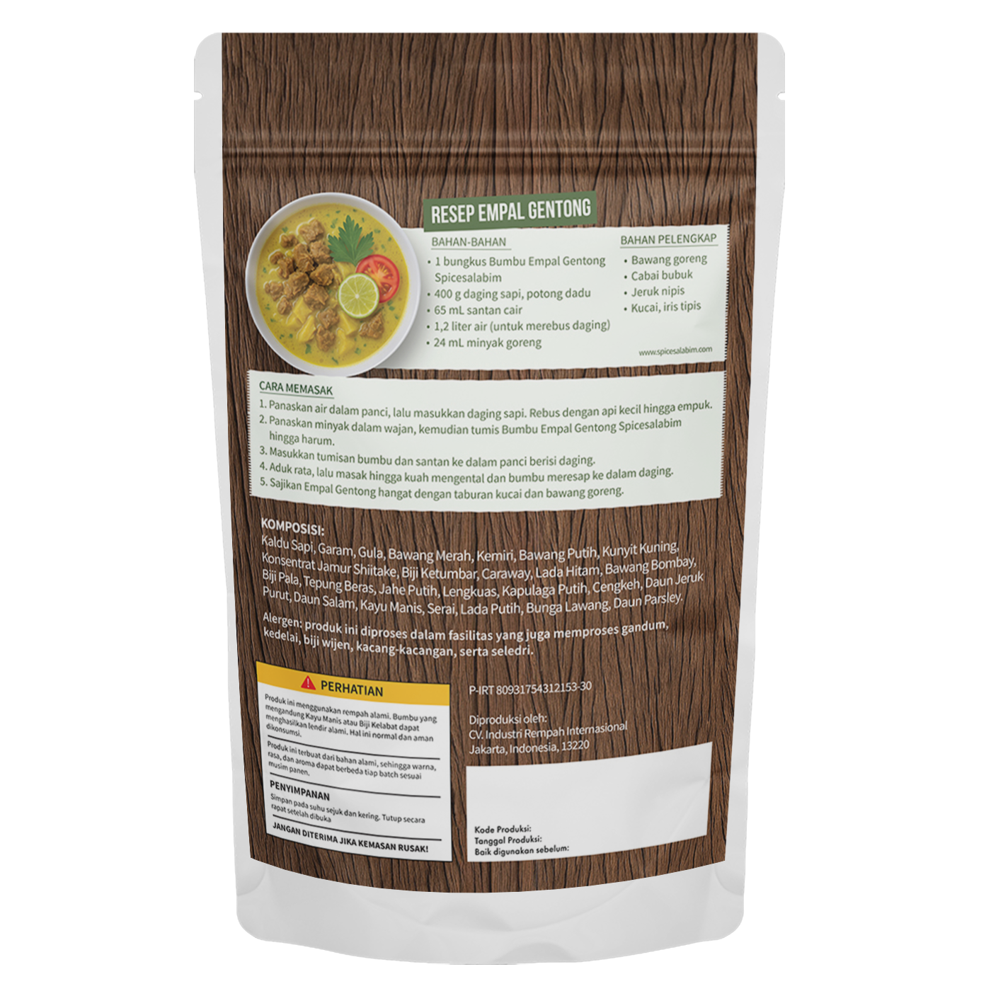 – Komposisi Bumbu Empal Gentong Spicesalabim – Kaldu Sapi, Garam, Gula, Bawang Merah, Kemiri, Bawang Putih, Kunyit Kuning, Konsentrat Jamur Shiitake, Biji Ketumbar, Caraway, Lada Hitam, Bawang Bombay, Biji Pala, Tepung Beras, Jahe Putih, Lengkuas, Kapulaga Putih, Cengkeh, Daun Jeruk Purut, Daun Salam, Kayu Manis, Serai, Lada Putih, Bunga Lawang, Daun Parsley