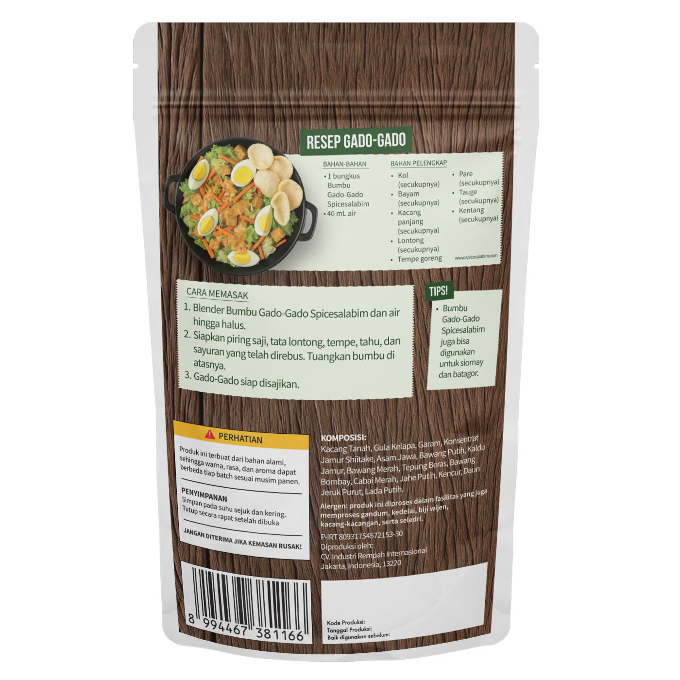 – Komposisi Bumbu Gado-gado Spicesalabim – Kacang Tanah, Gula Kelapa, Garam, Konsentrat Jamur Shiitake, Asam Jawa, Bawang Putih, Kaldu Jamur, Bawang Merah, Tepung Beras, Bawang Bombay, Cabai Merah, Jahe Putih, Kencur, Daun Jeruk Purut, Lada Putih