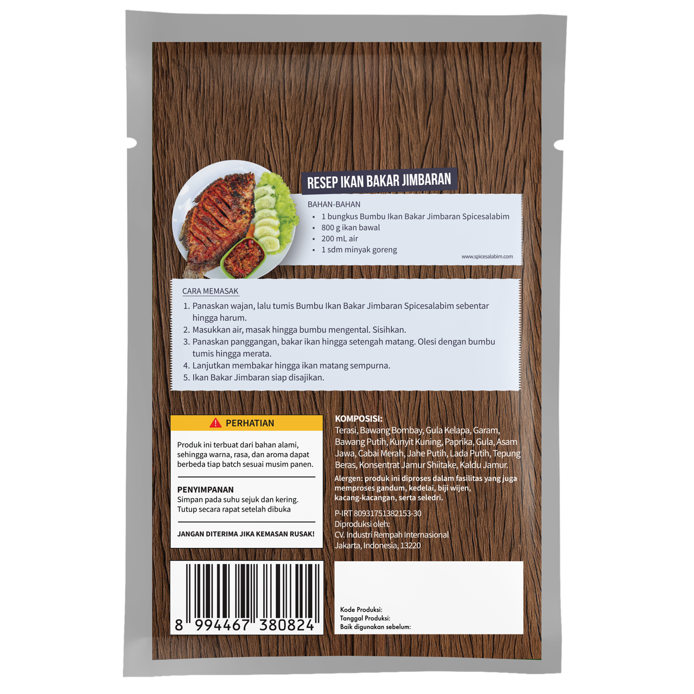 – Komposisi Bumbu Ikan Bakar Jimbaran Spicesalabim – Terasi, Bawang Bombay, Gula Kelapa, Garam, Bawang Putih, Kunyit Kuning, Paprika, Gula, Asam Jawa, Cabai Merah, Jahe Putih, Lada Putih, Tepung Beras, Konsentrat Jamur Shiitake, Kaldu Jamur