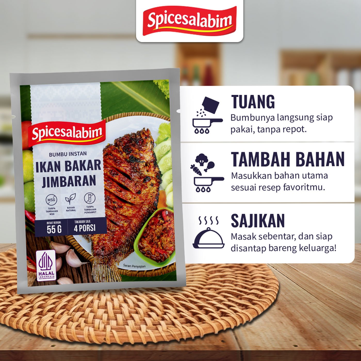 Bumbu Ikan Bakar Jimbaran Spicesalabim, bumbu instan yang diracik khusus buat kamu yang mau masak praktis dengan rempah yang natural. Terbuat dari rempah asli, tanpa tambahan MSG, tanpa pengawet, dan tanpa bahan berbahaya. Cukup satu bumbu untuk bikin masakan gurih, enak, dan sehat.