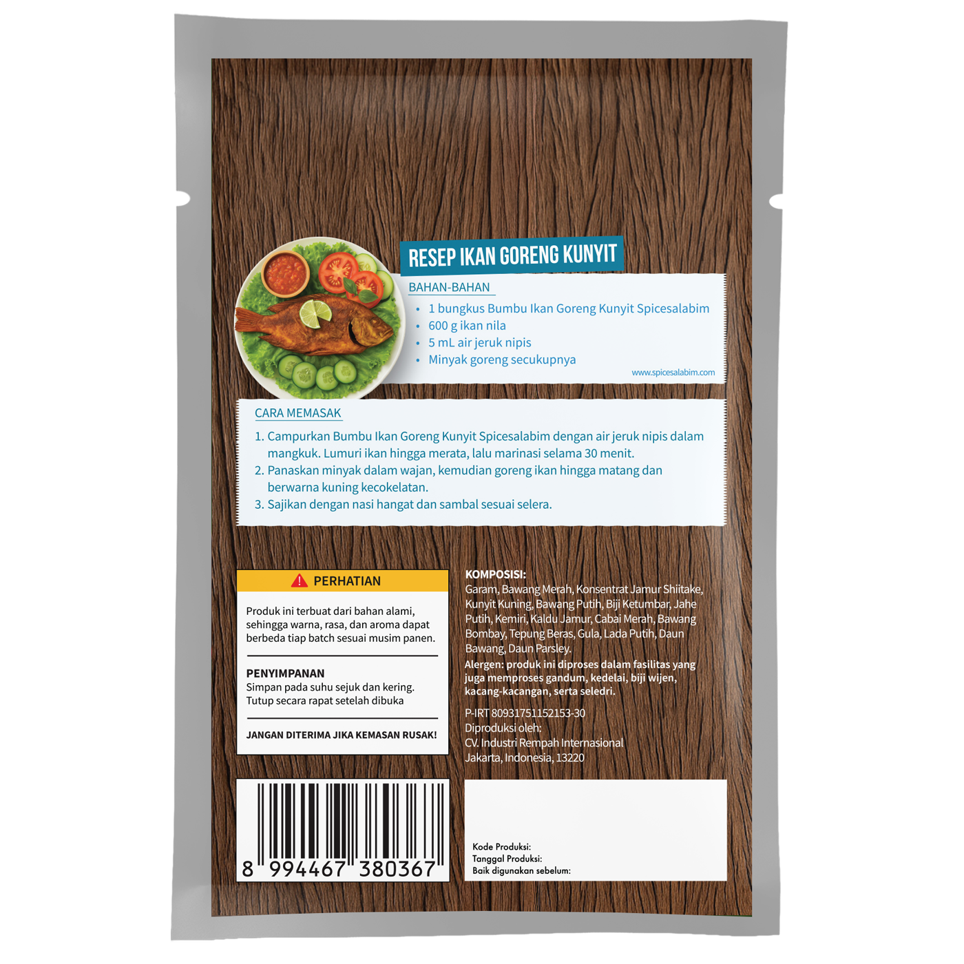 – Komposisi Bumbu Ikan Goreng Kunyit Spicesalabim – Garam, Bawang Merah, Konsentrat Jamur Shiitake, Kunyit Kuning, Bawang Putih, Biji Ketumbar, Jahe Putih, Kemiri, Kaldu Jamur, Cabai Merah, Bawang Bombay, Tepung Beras, Gula, Lada Putih, Daun Bawang, Daun Parsley