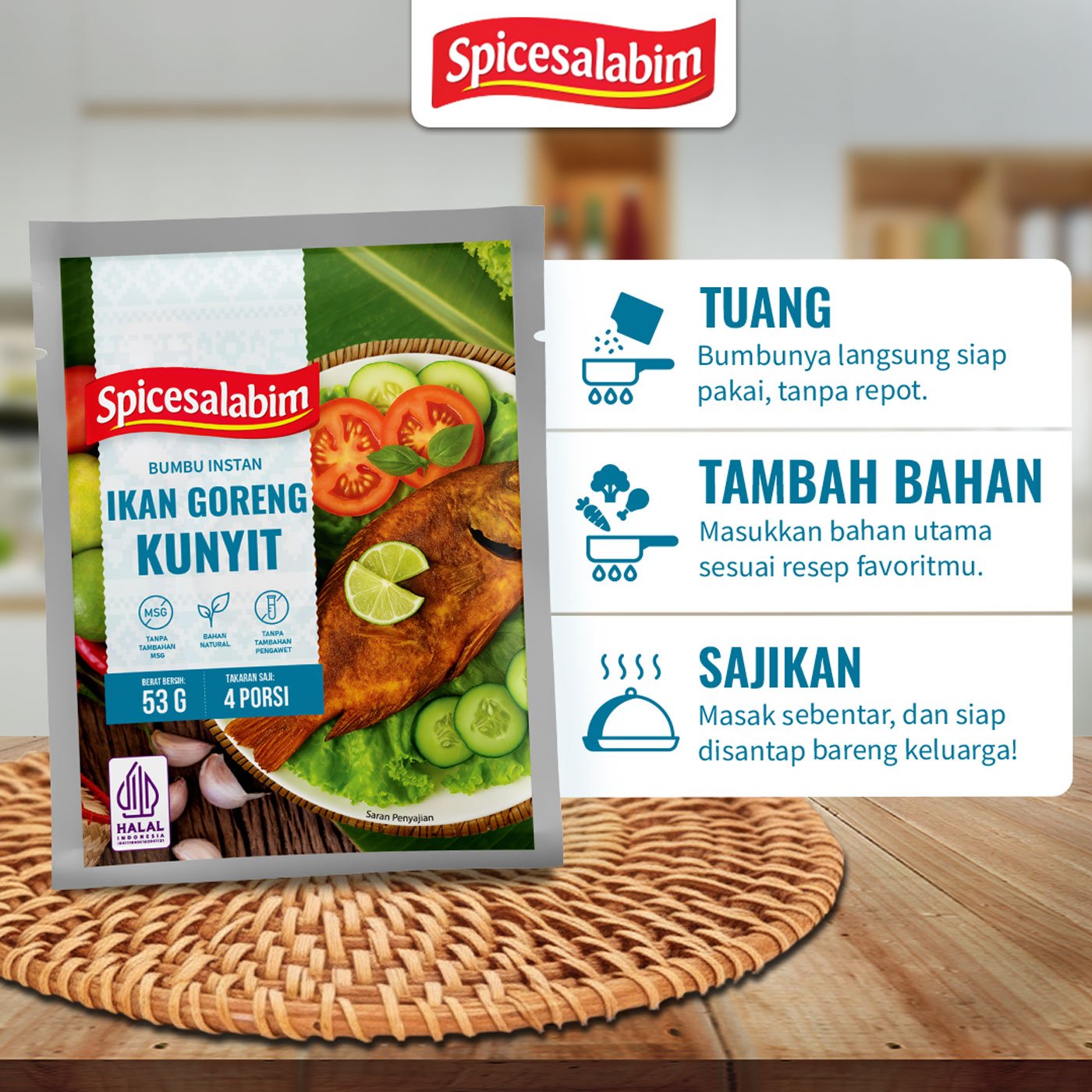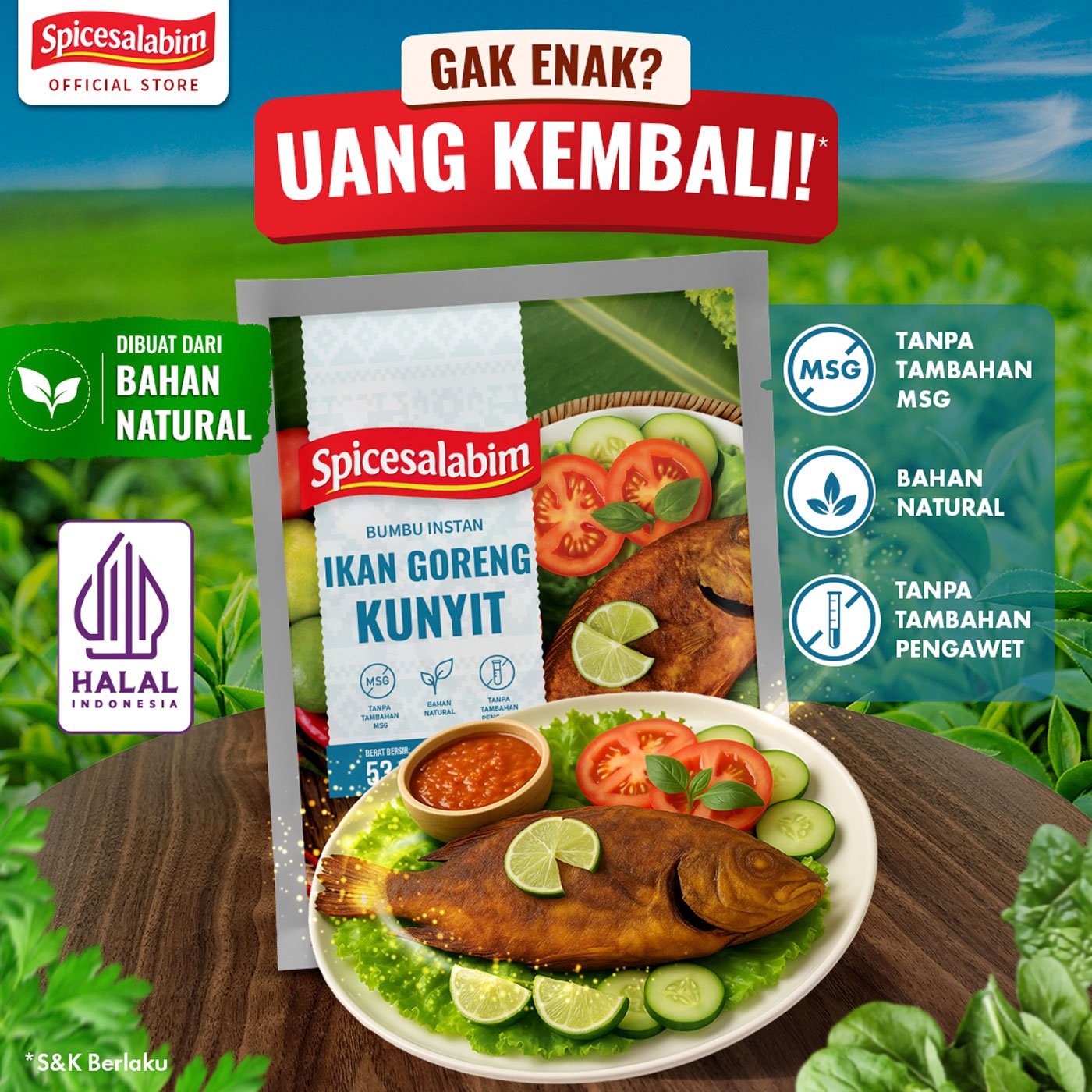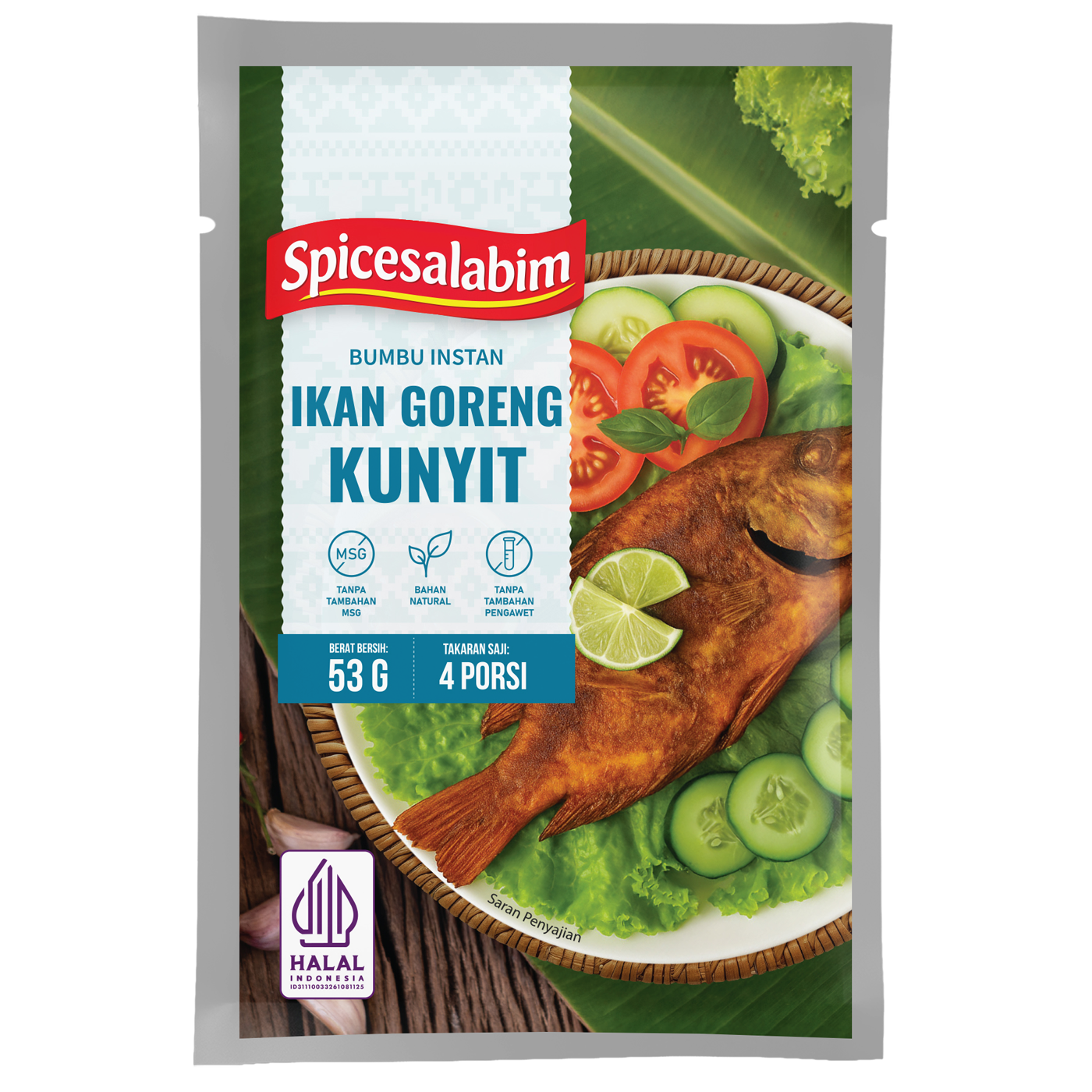 Bumbu Ikan Goreng Kunyit Spicesalabim, bumbu instan yang diracik khusus buat kamu yang mau masak praktis dengan rempah yang natural. Terbuat dari rempah asli, tanpa tambahan MSG, tanpa pengawet, dan tanpa bahan berbahaya. Cukup satu bumbu untuk bikin masakan gurih, enak, dan sehat.