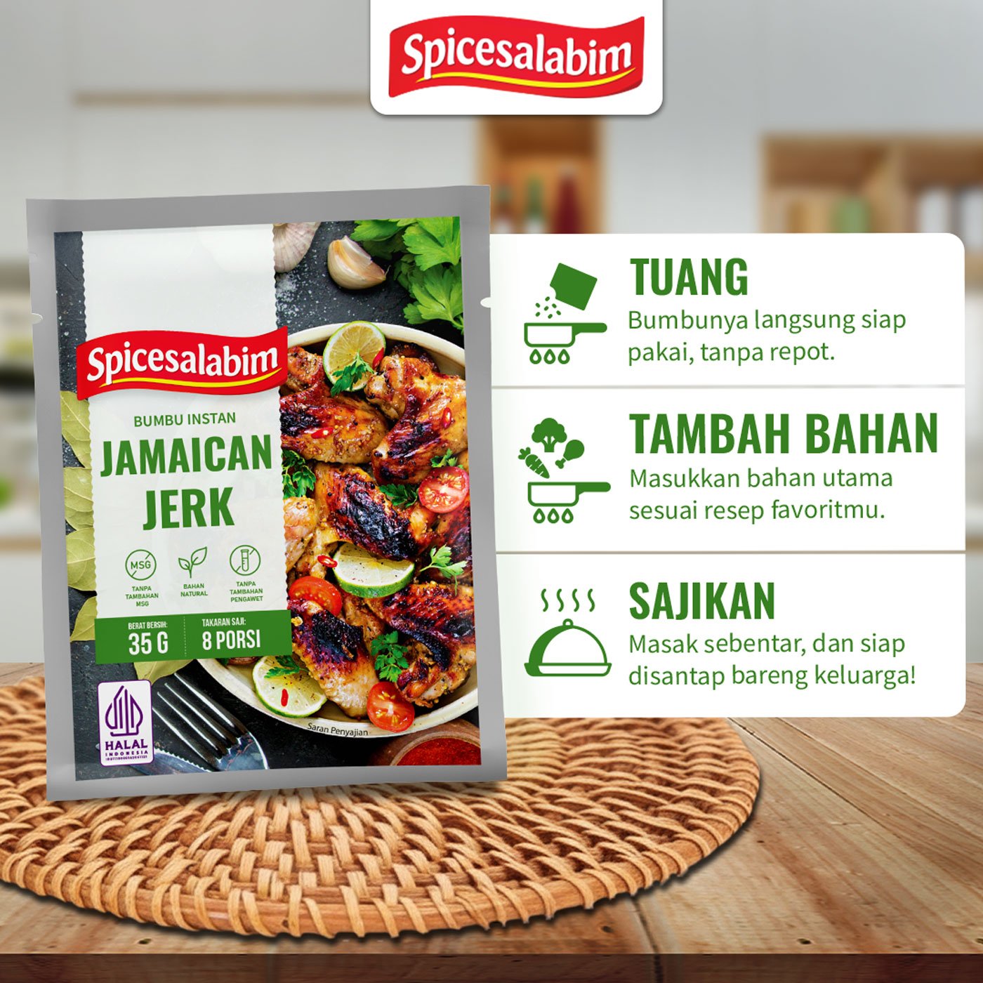 Bumbu Jamaican Jerk Spicesalabim, bumbu instan yang diracik khusus buat kamu yang mau masak praktis dengan rempah yang natural. Terbuat dari rempah asli, tanpa tambahan MSG, tanpa pengawet, dan tanpa bahan berbahaya. Cukup satu bumbu untuk bikin masakan gurih, enak, dan sehat.