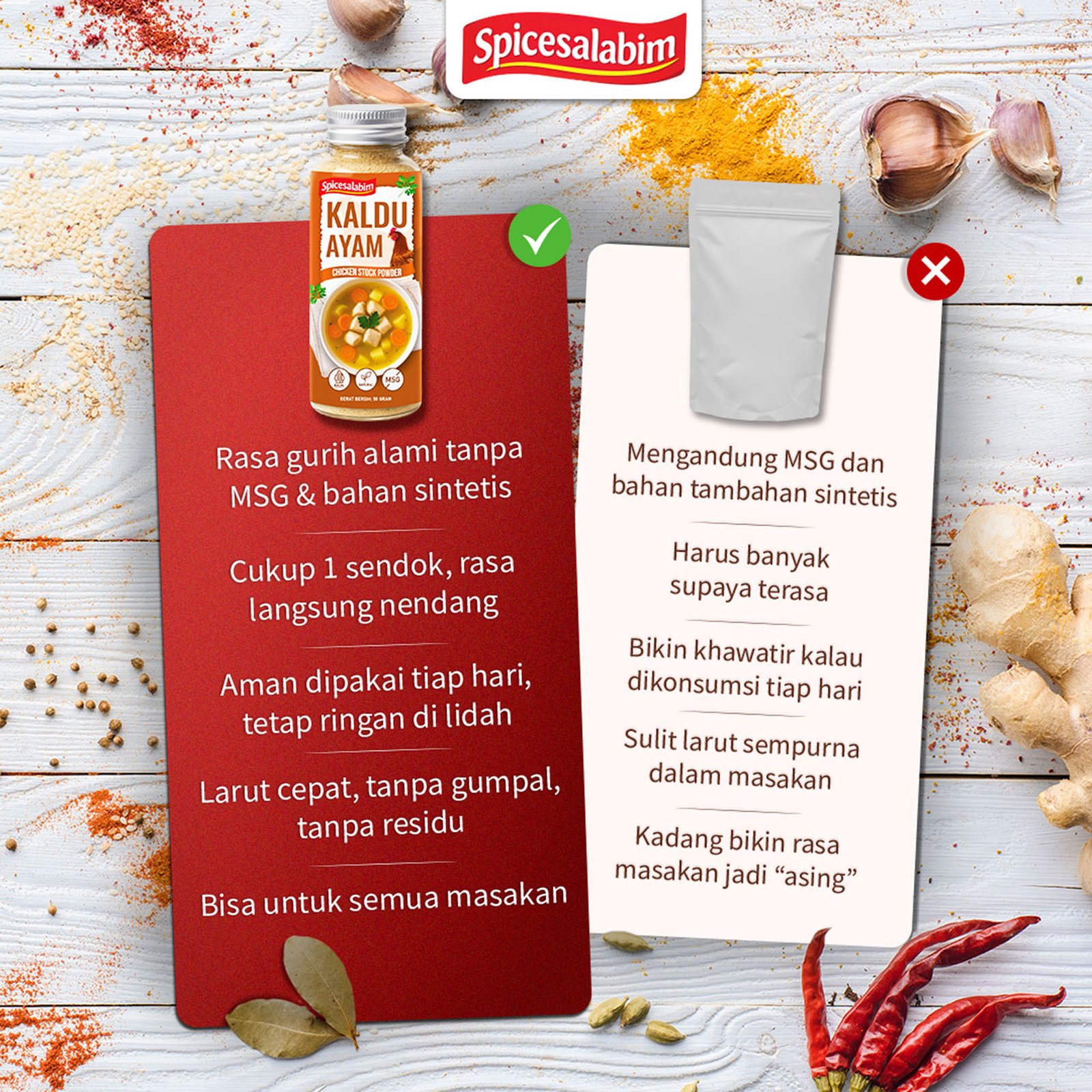 Bumbu Kaldu Ayam Spicesalabim, bumbu instan yang diracik khusus buat kamu yang mau masak praktis dengan rempah yang natural. Terbuat dari rempah asli, tanpa tambahan MSG, tanpa pengawet, dan tanpa bahan berbahaya. Cukup satu bumbu untuk bikin masakan gurih, enak, dan sehat.