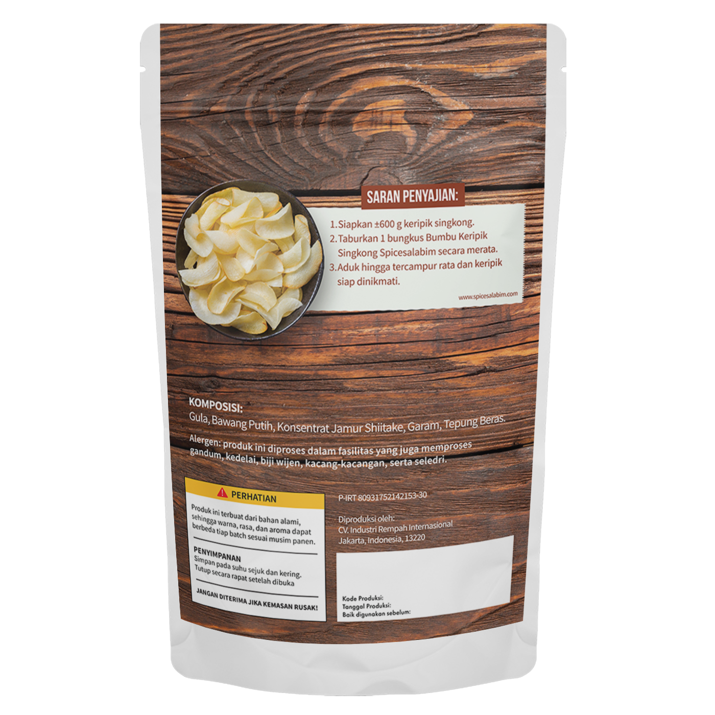 – Komposisi Bumbu Keripik Singkong Spicesalabim – Gula, Bawang Putih, Konsentrat Jamur Shiitake, Garam, Tepung Beras