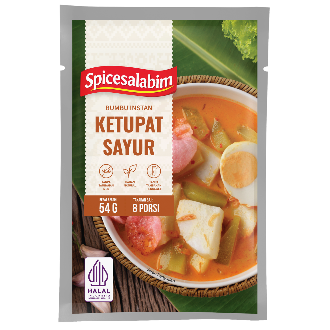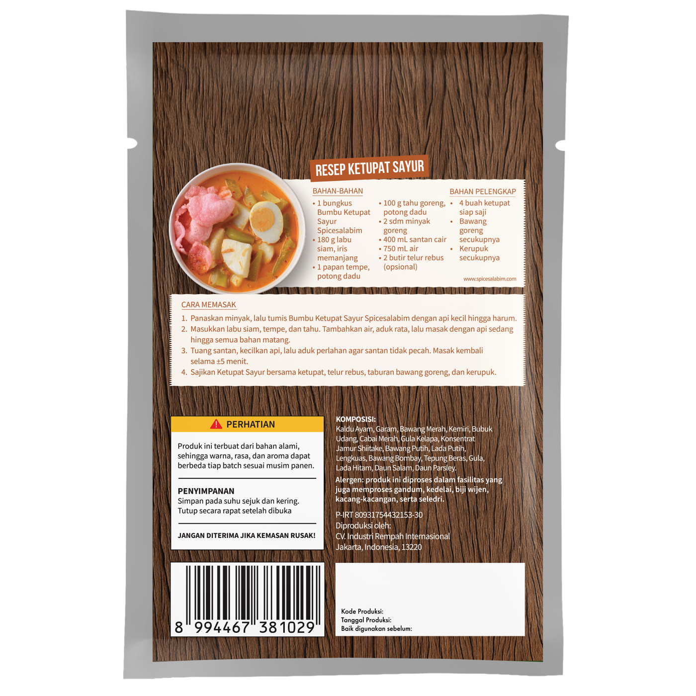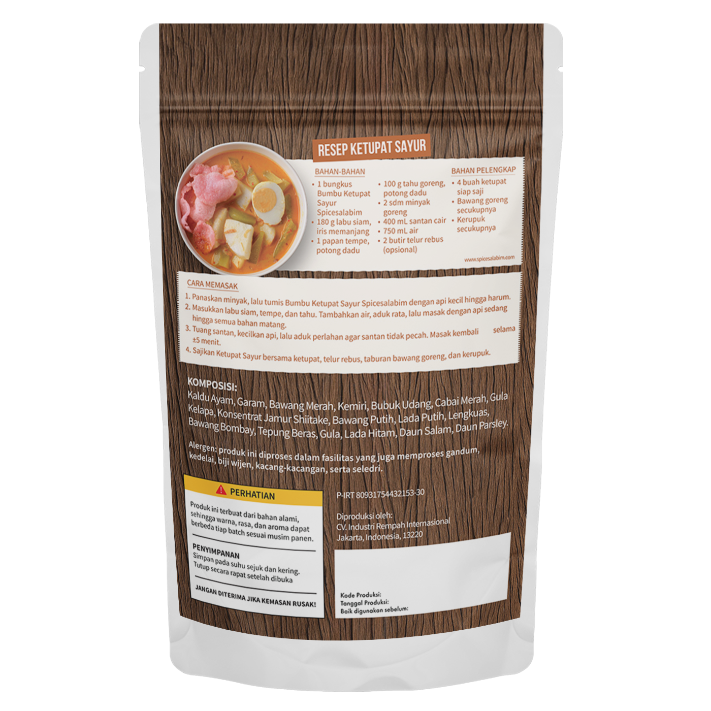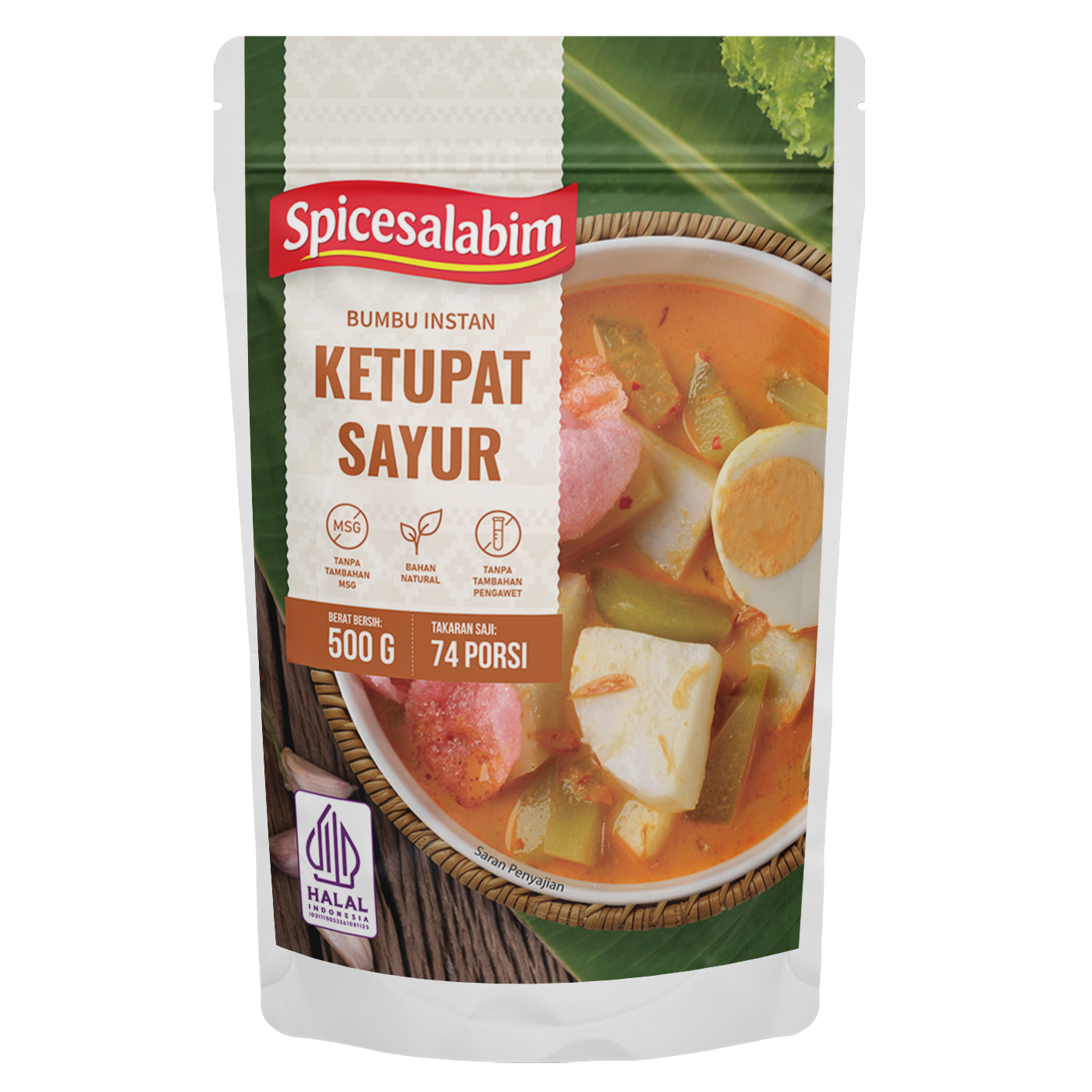 – Komposisi Bumbu Ketupat Sayur Spicesalabim – Kaldu Ayam, Garam, Bawang Merah, Kemiri, Bubuk Udang, Cabai Merah, Gula Kelapa, Konsentrat Jamur Shiitake, Bawang Putih, Lada Putih, Lengkuas, Bawang Bombay, Tepung Beras, Gula, Lada Hitam, Daun Salam, Daun Parsley