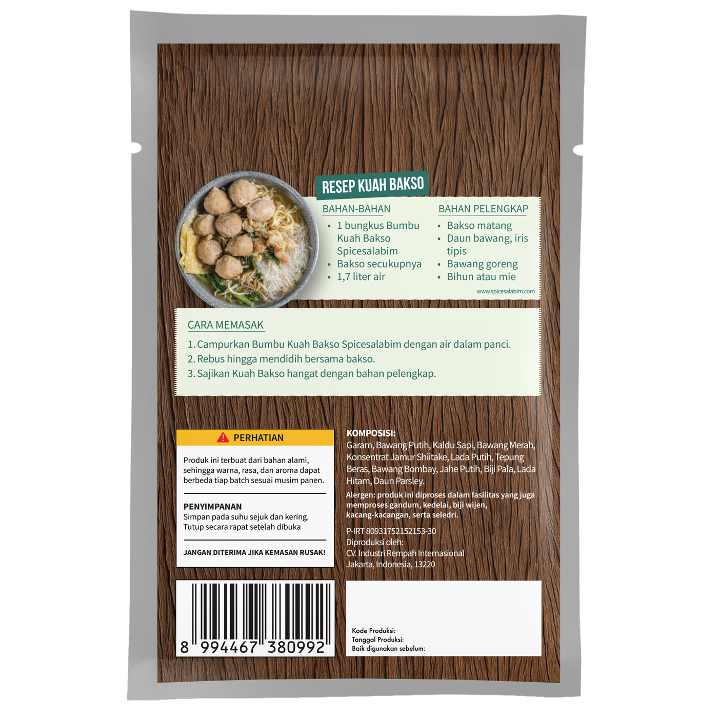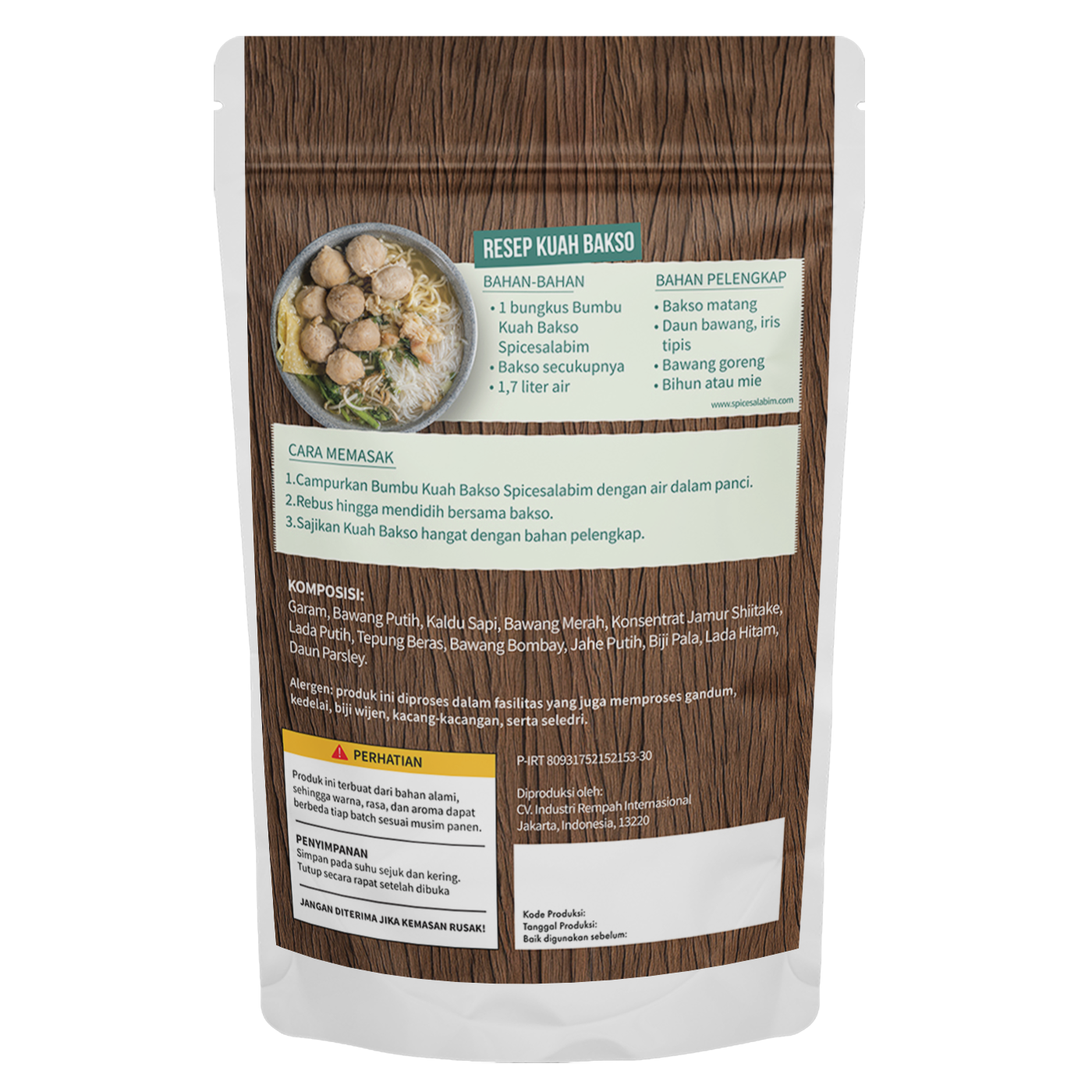 – Komposisi Bumbu Kuah Bakso Spicesalabim – Garam, Bawang Putih, Kaldu Sapi, Bawang Merah, Konsentrat Jamur Shiitake, Lada Putih, Tepung Beras, Bawang Bombay, Jahe Putih, Biji Pala, Lada Hitam, Daun Parsley