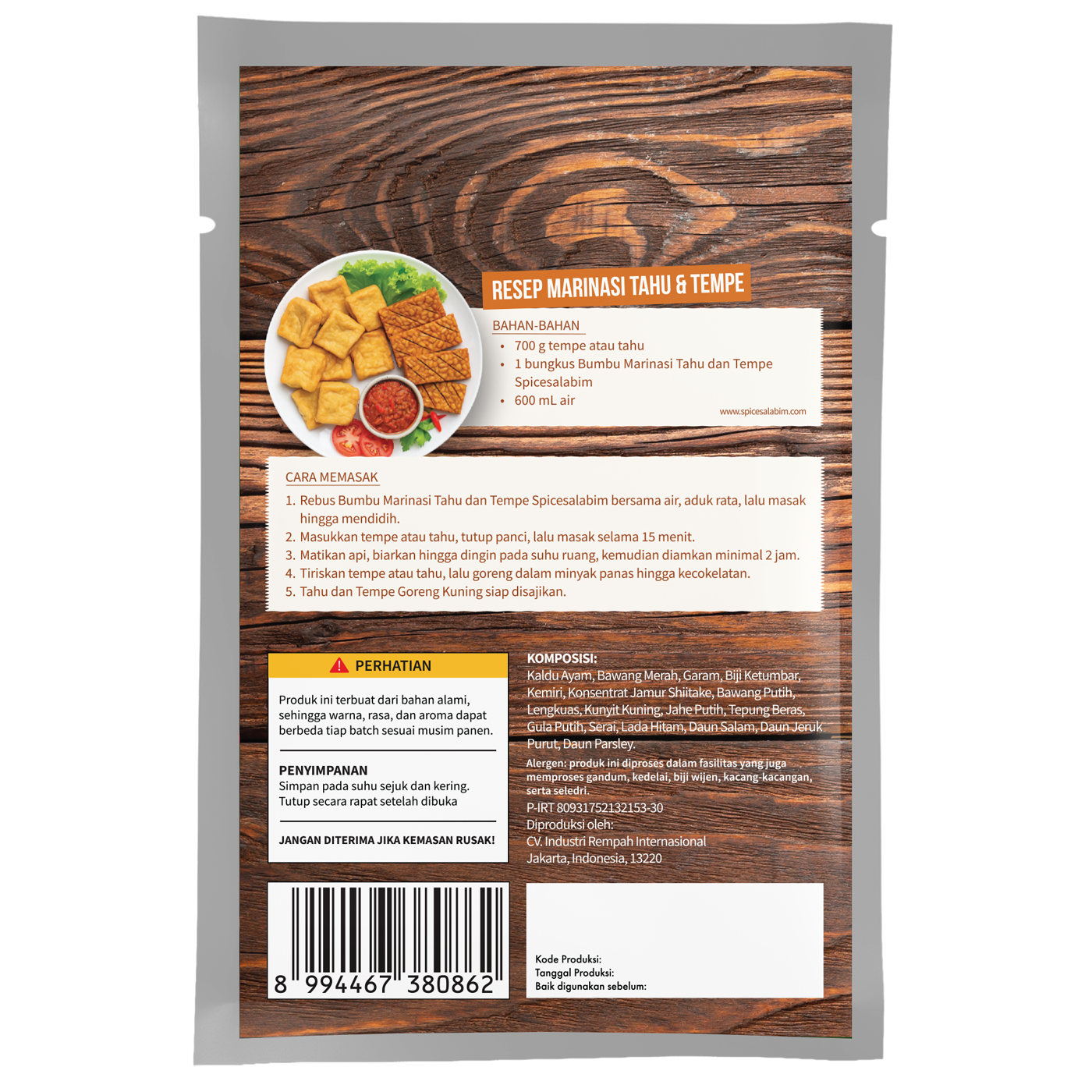 – Komposisi Bumbu Marinasi Tahu dan Tempe Spicesalabim – Kaldu Ayam, Bawang Merah, Garam, Biji Ketumbar, Kemiri, Konsentrat Jamur Shiitake, Bawang Putih, Lengkuas, Kunyit Kuning, Jahe Putih, Beras, Gula Putih, Serai, Lada Hitam, Daun Salam, Daun Jeruk Purut, Daun Parsley