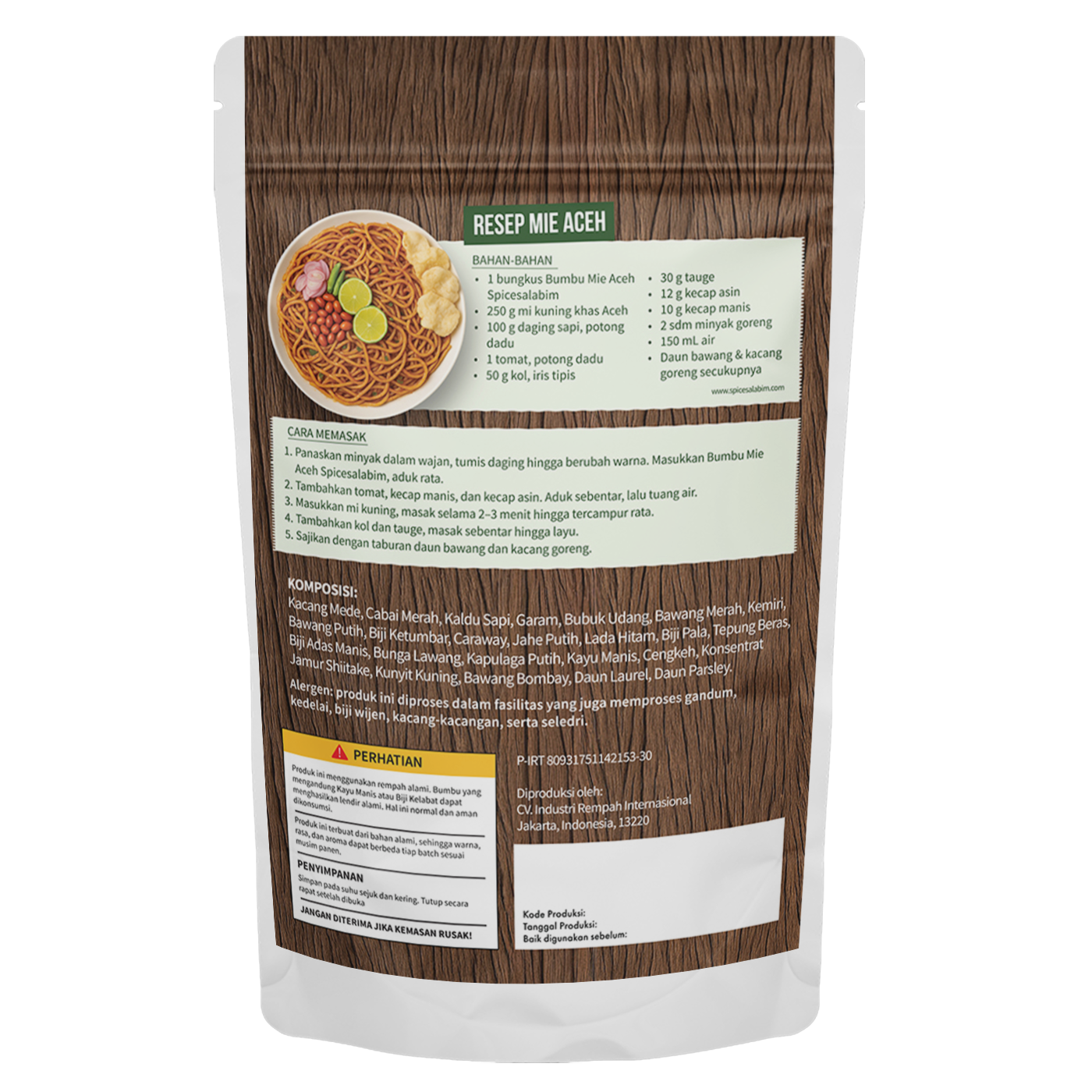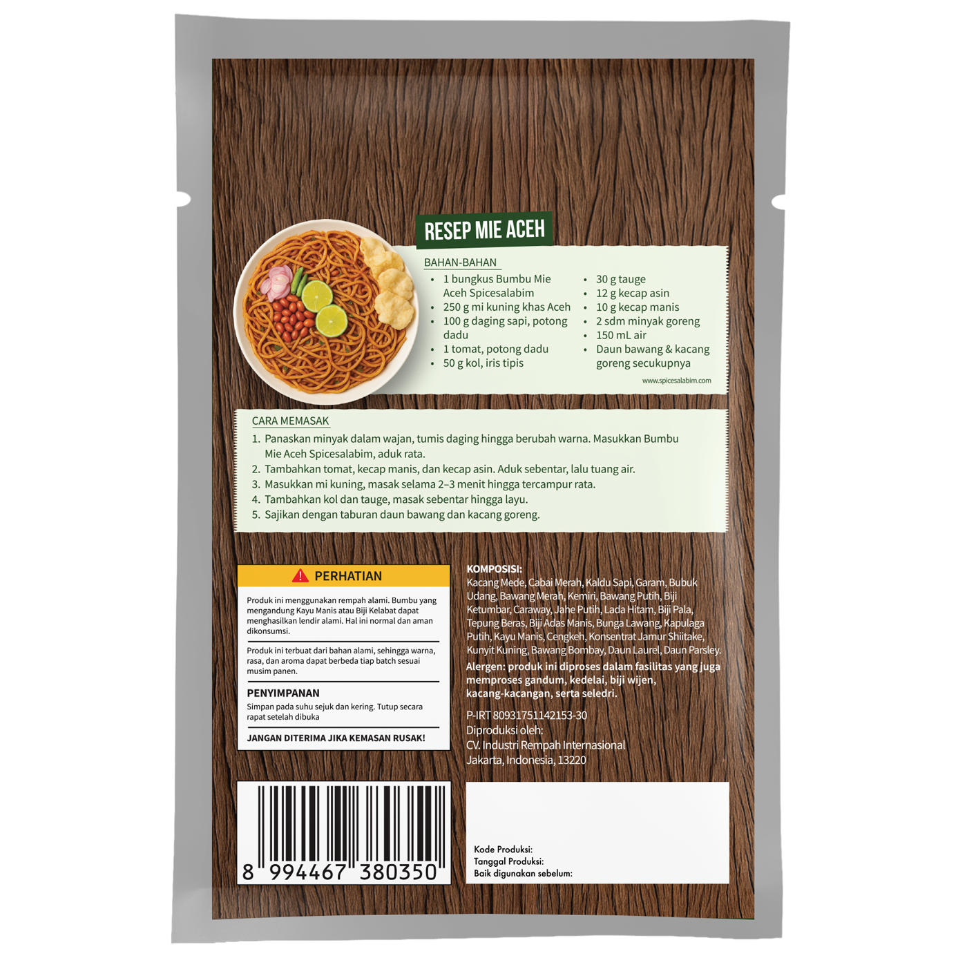 – Komposisi Bumbu Mie Aceh Spicesalabim – Kacang Mede, Cabai Merah, Kaldu Sapi, Garam, Bubuk Udang, Bawang Merah, Kemiri, Bawang Putih, Biji Ketumbar, Caraway, Jahe Putih, Lada Hitam, Biji Pala, Tepung Beras, Biji Adas Manis, Bunga Lawang, Kapulaga Putih, Kayu Manis, Cengkeh, Konsentrat Jamur Shiitake, Kunyit Kuning, Bawang Bombay, Daun Laurel, Daun Parsley