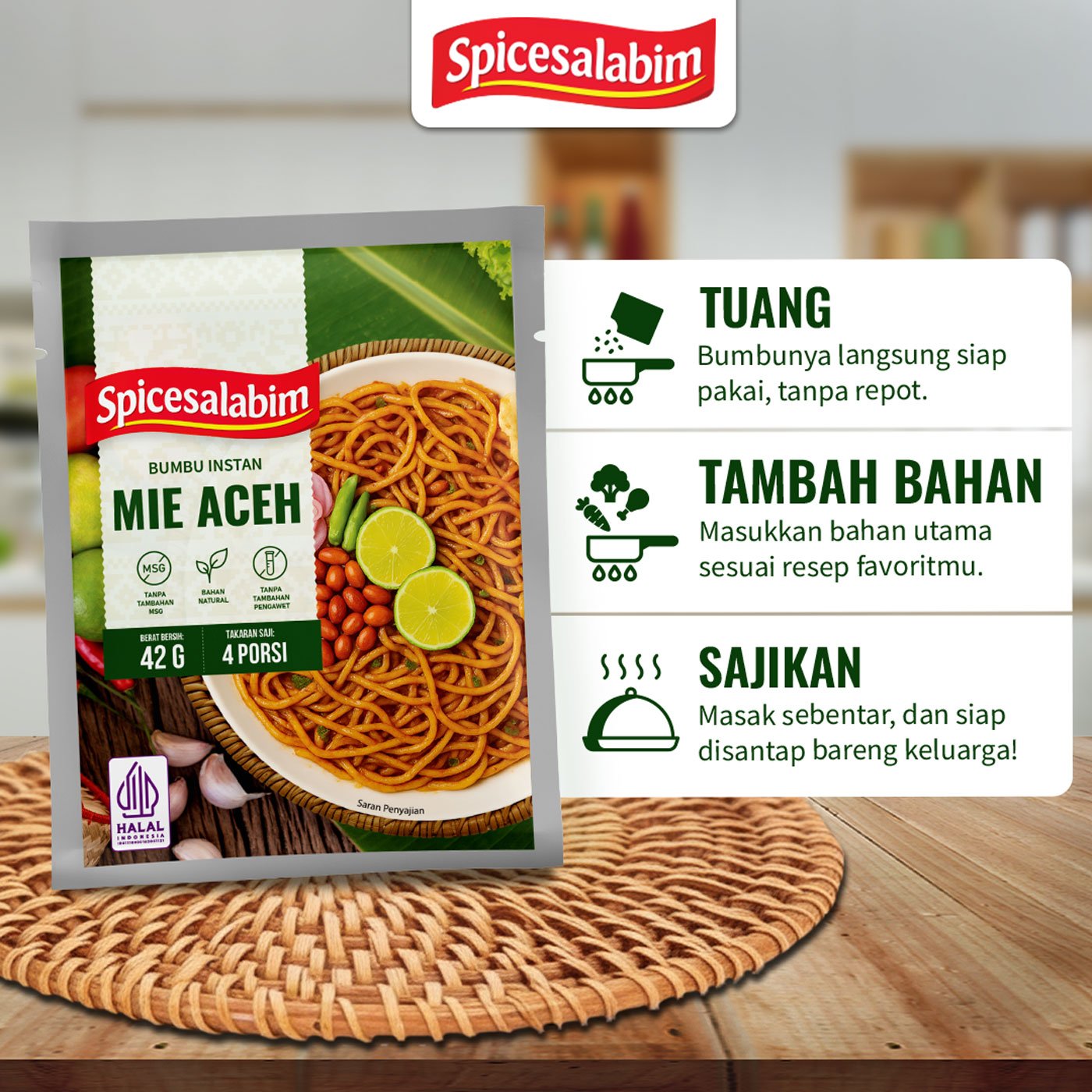 Bumbu Mie Aceh Spicesalabim, bumbu instan yang diracik khusus buat kamu yang mau masak praktis dengan rempah yang natural. Terbuat dari rempah asli, tanpa tambahan MSG, tanpa pengawet, dan tanpa bahan berbahaya. Cukup satu bumbu untuk bikin masakan gurih, enak, dan sehat.