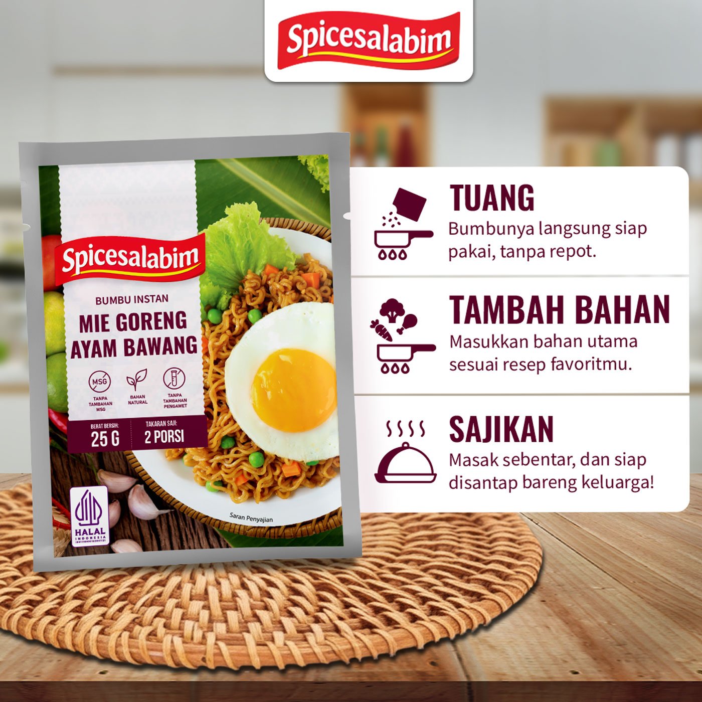– Komposisi Bumbu Mie Goreng Ayam Bawang Spicesalabim – Bawang Merah, Garam, Kaldu Ayam, Gula Putih, Bawang Bombay, Bawang Putih, Konsentrat Jamur Shiitake, Tepung Beras, Lada Putih, Lada Hitam, Daun Parsley