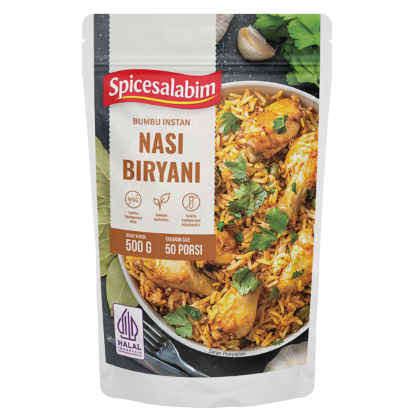 – Komposisi Bumbu Nasi Biryani Spicesalabim – Bawang Bombay, Garam, Kaldu Ayam, Susu Bubuk, Cumin, Biji Ketumbar, Konsentrat Jamur Shiitake, Biji Adas Manis, Asam Jawa, Bawang Putih, Biji Pala, Daun Mint, Paprika, Bawang Merah, Tepung Beras, Jahe Putih, Kapulaga Hijau, Kayu Manis, Cabai Merah, Biji Kelabat, Lada Hitam, Bunga Lawang, Daun Laurel, Cengkeh, Kunyit Kuning, Gula