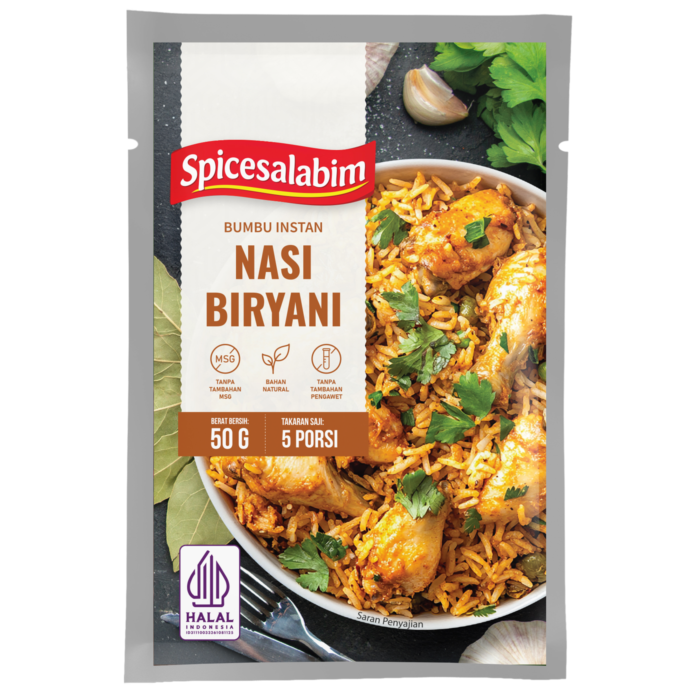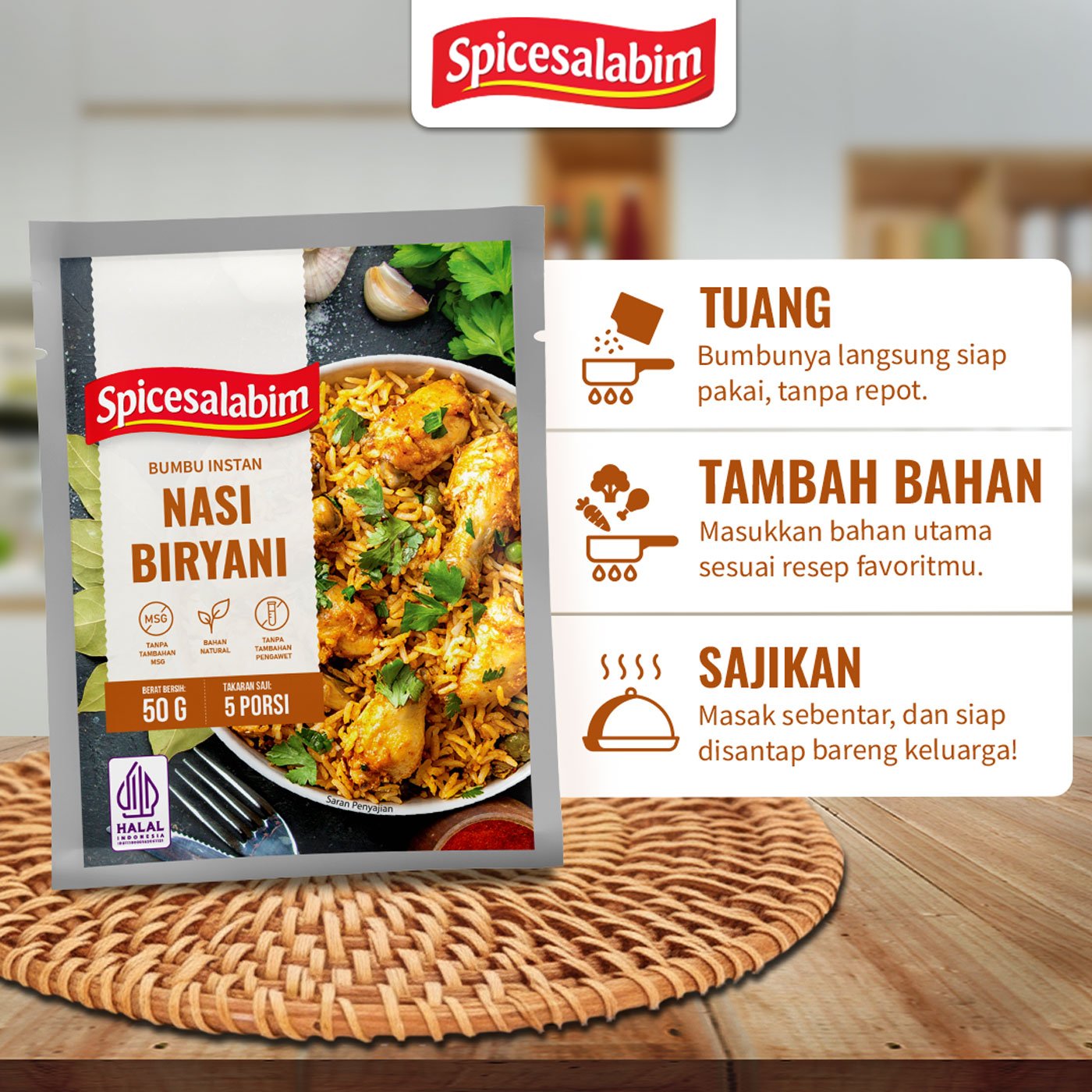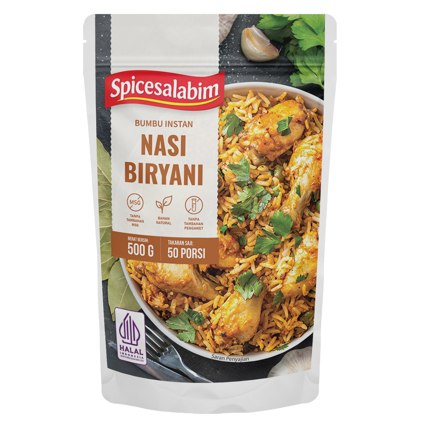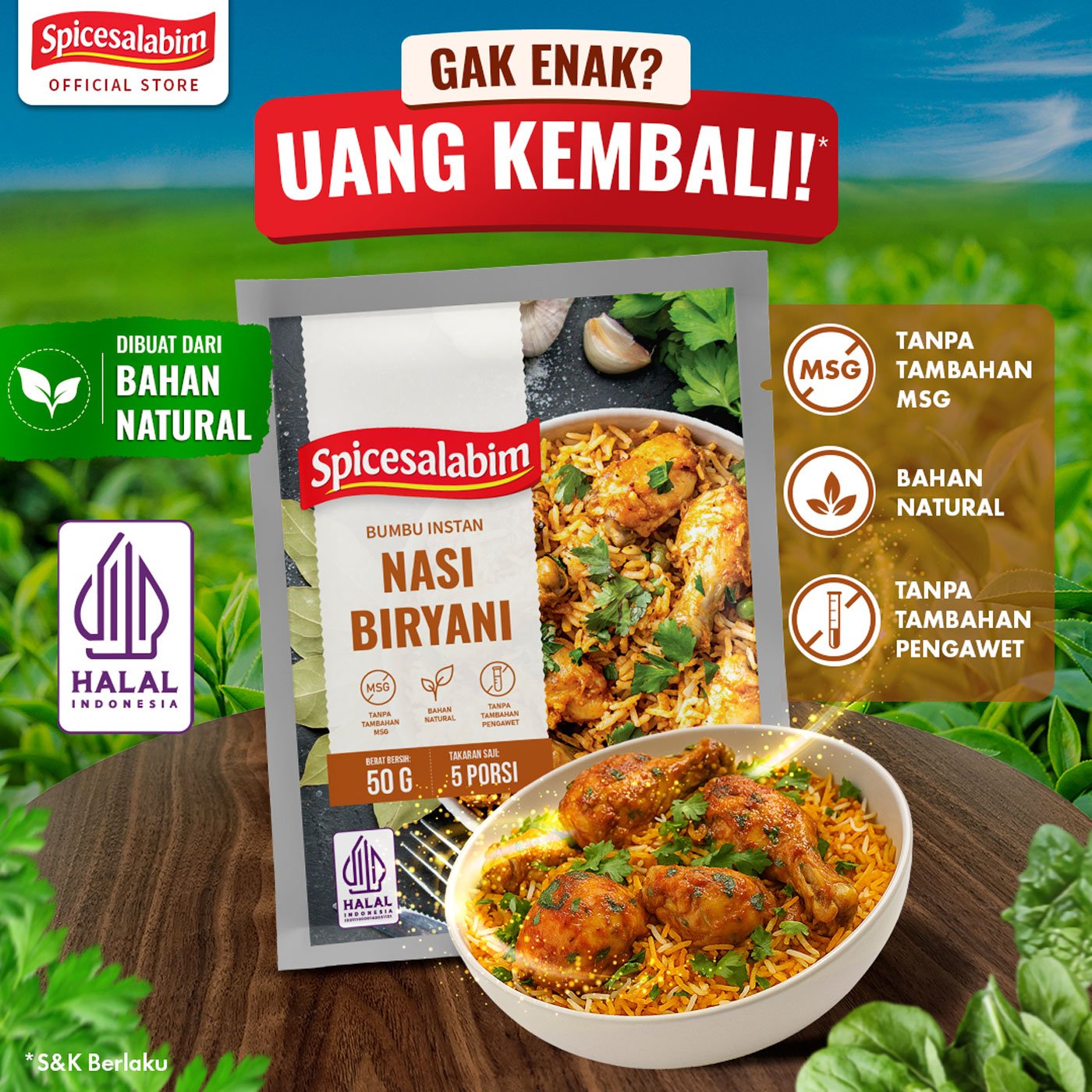 Bumbu Nasi Biryani Spicesalabim, bumbu instan yang diracik khusus buat kamu yang mau masak praktis dengan rempah yang natural. Terbuat dari rempah asli, tanpa tambahan MSG, tanpa pengawet, dan tanpa bahan berbahaya. Cukup satu bumbu untuk bikin masakan gurih, enak, dan sehat.