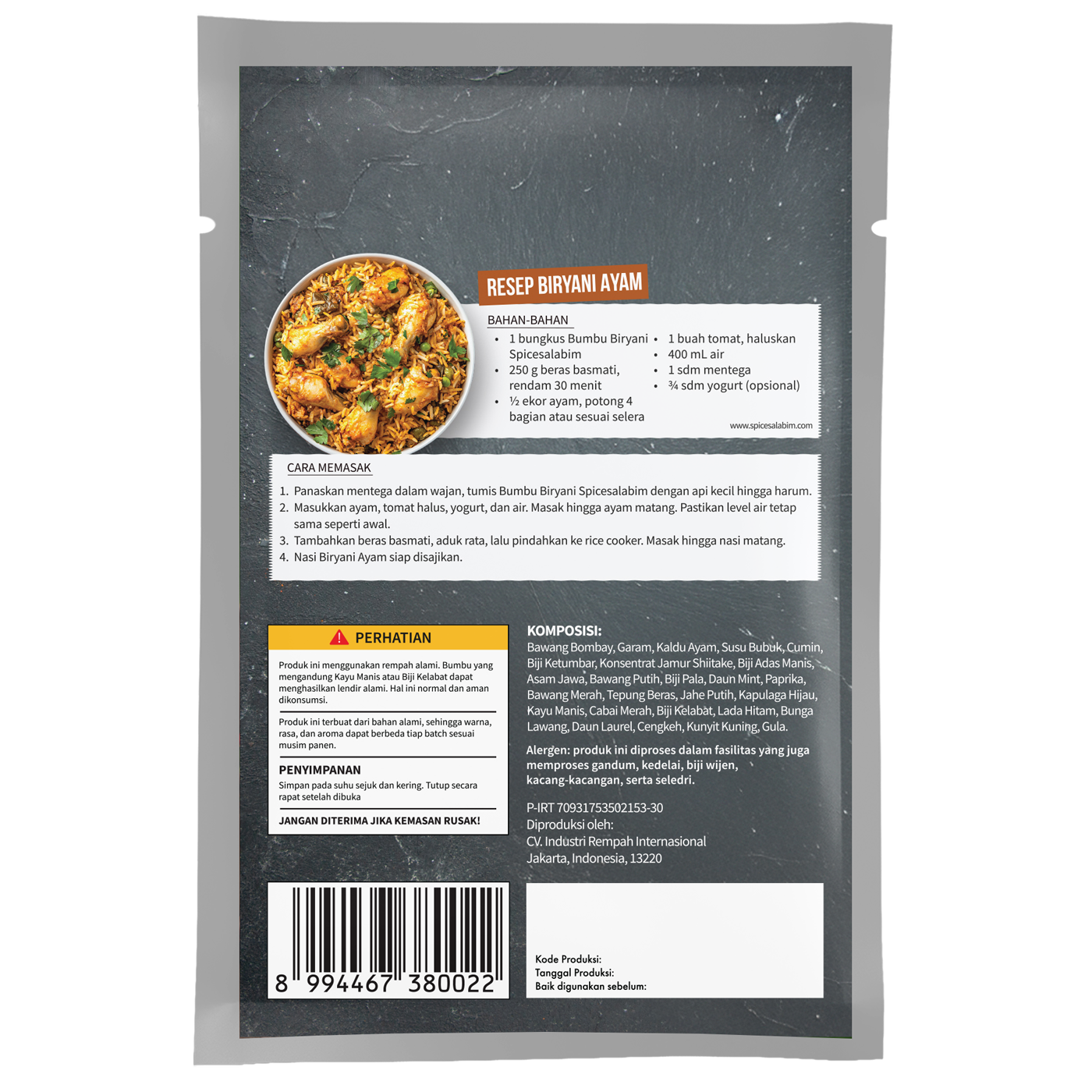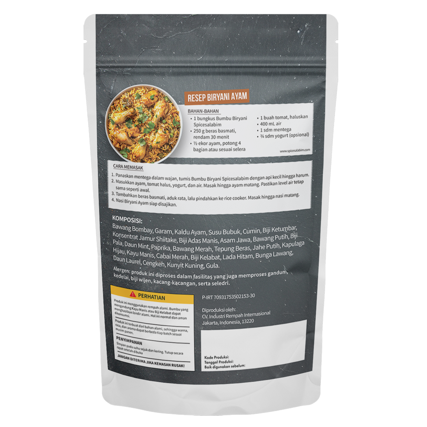 – Komposisi Bumbu Nasi Biryani Spicesalabim – Bawang Bombay, Garam, Kaldu Ayam, Susu Bubuk, Cumin, Biji Ketumbar, Konsentrat Jamur Shiitake, Biji Adas Manis, Asam Jawa, Bawang Putih, Biji Pala, Daun Mint, Paprika, Bawang Merah, Tepung Beras, Jahe Putih, Kapulaga Hijau, Kayu Manis, Cabai Merah, Biji Kelabat, Lada Hitam, Bunga Lawang, Daun Laurel, Cengkeh, Kunyit Kuning, Gula