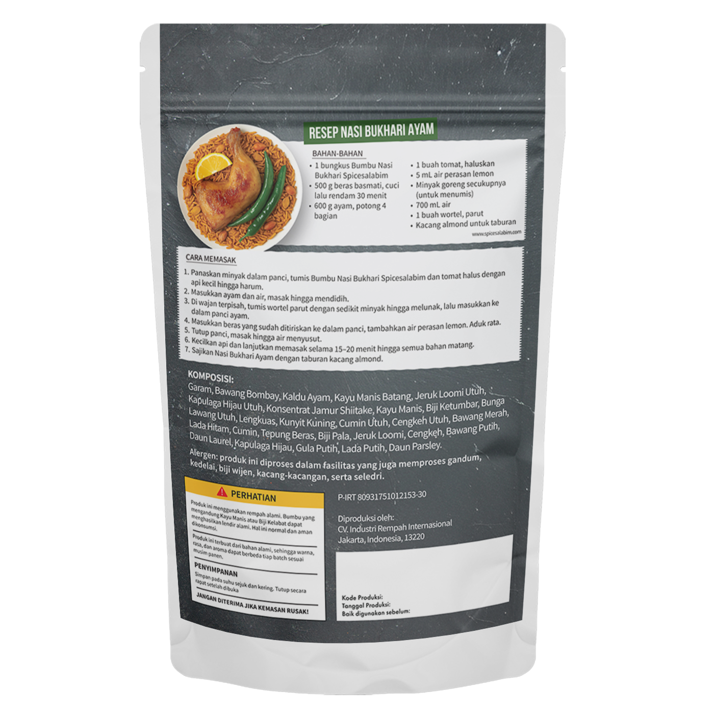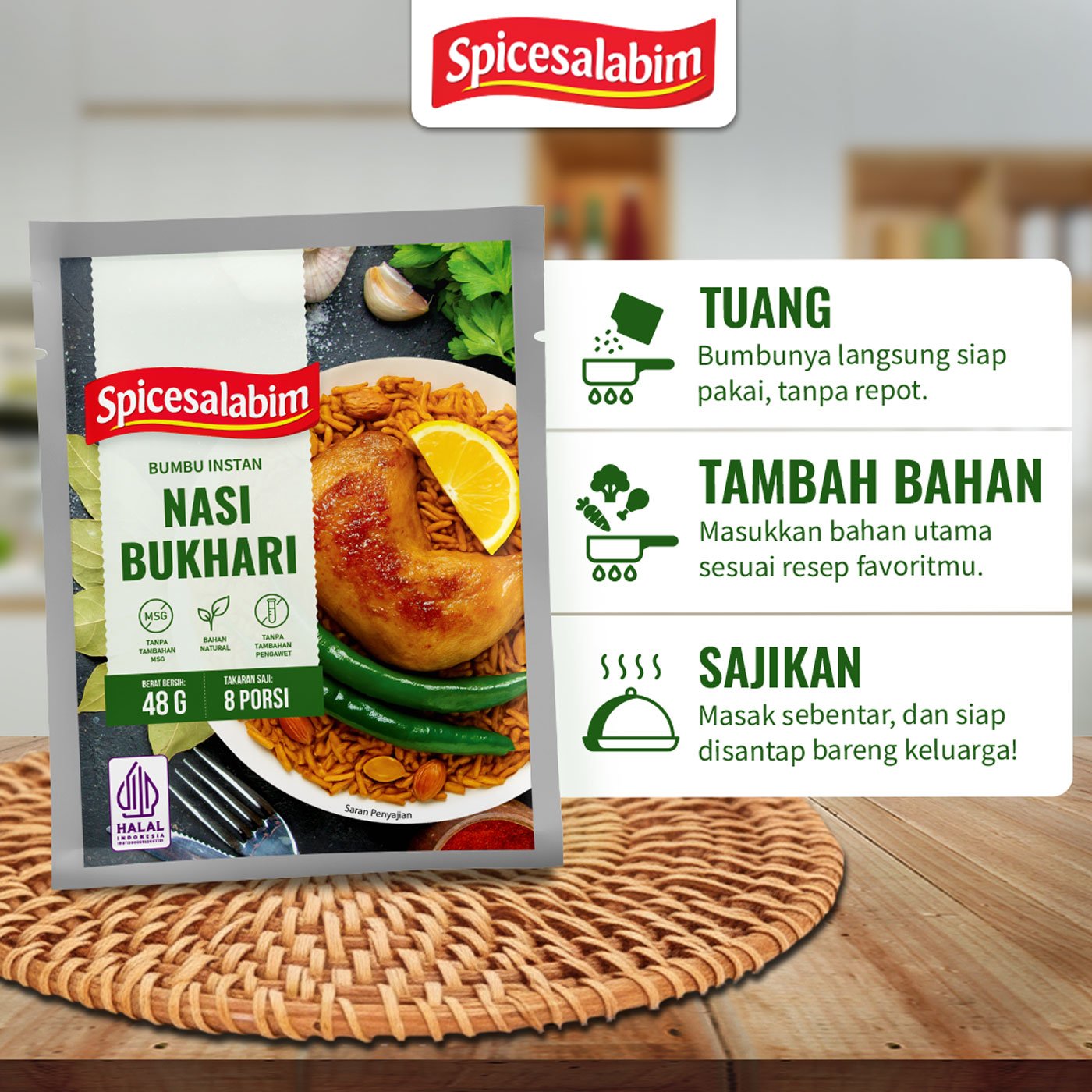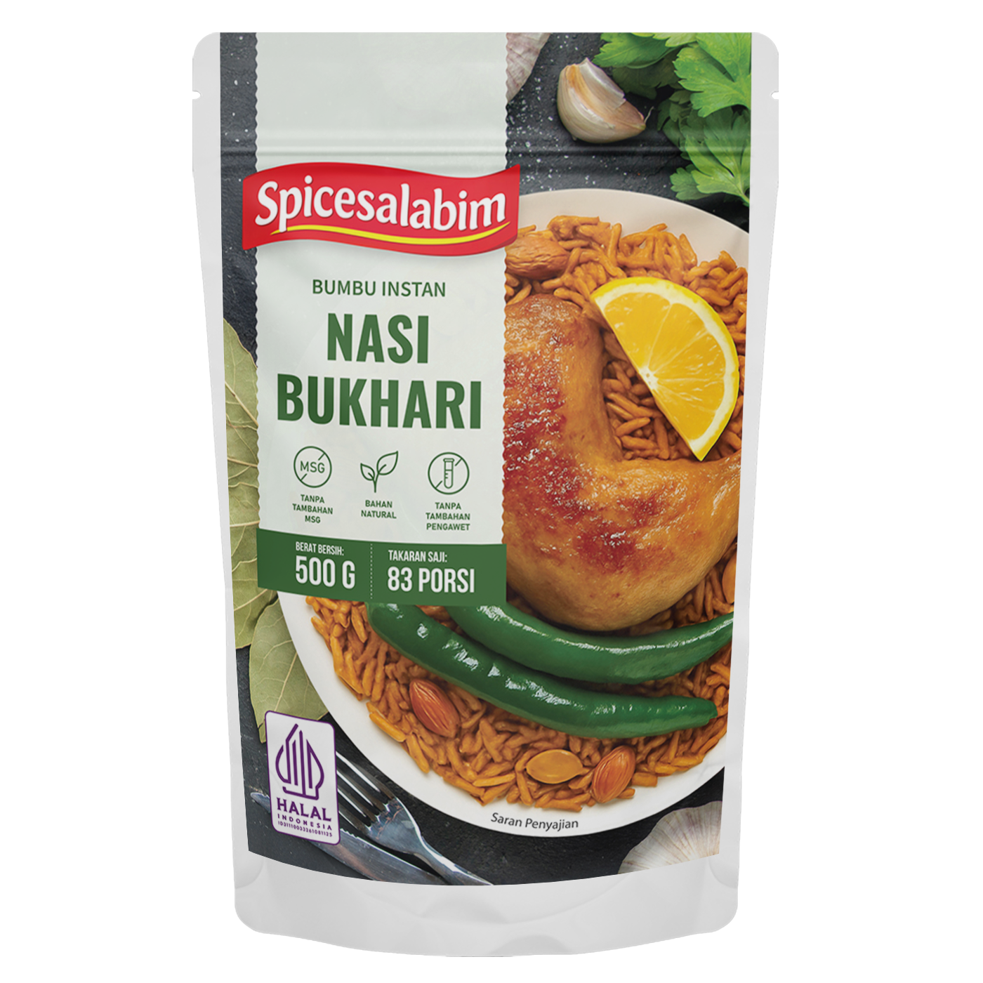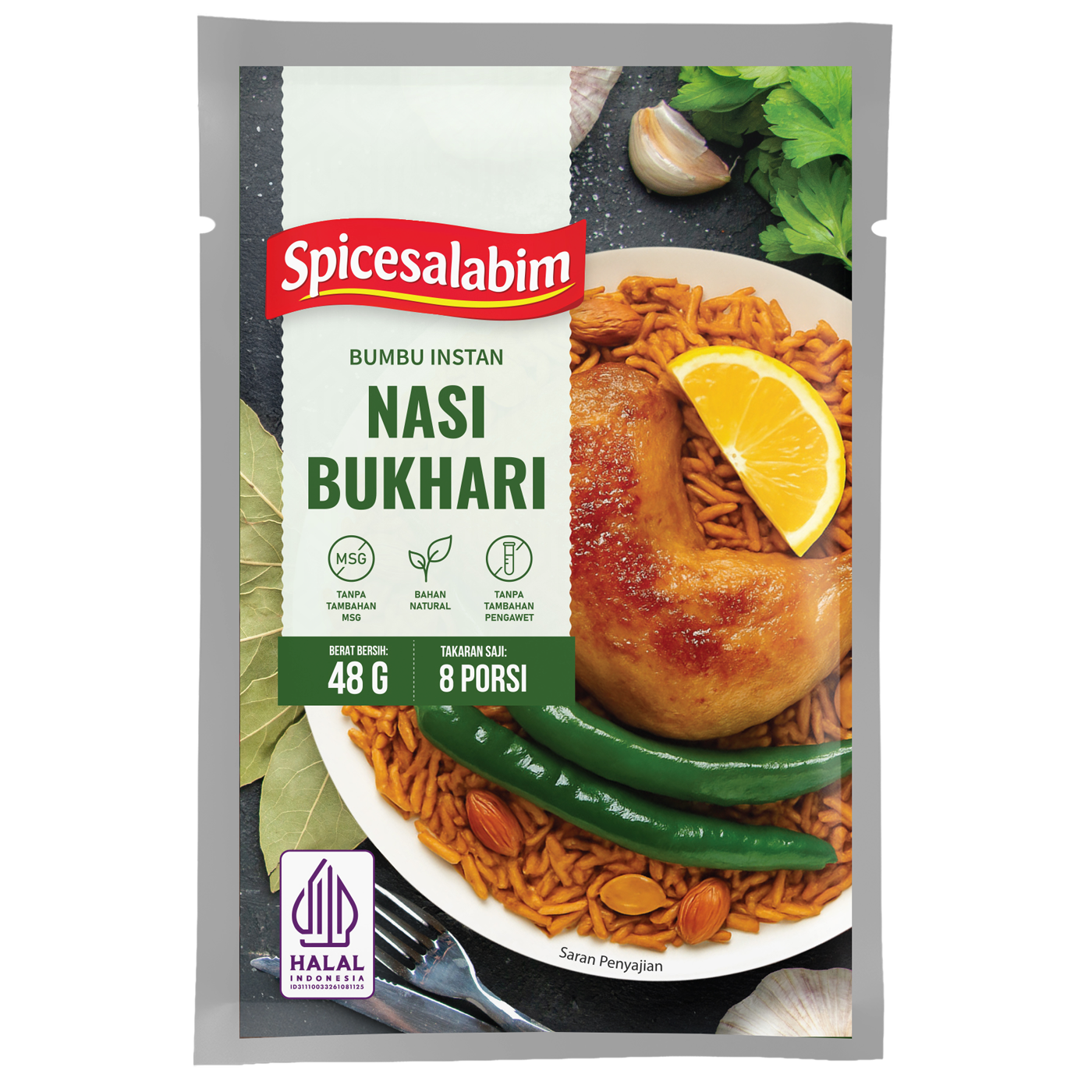Bumbu Nasi Bukhari Spicesalabim, bumbu instan yang diracik khusus buat kamu yang mau masak praktis dengan rempah yang natural. Terbuat dari rempah asli, tanpa tambahan MSG, tanpa pengawet, dan tanpa bahan berbahaya. Cukup satu bumbu untuk bikin masakan gurih, enak, dan sehat.