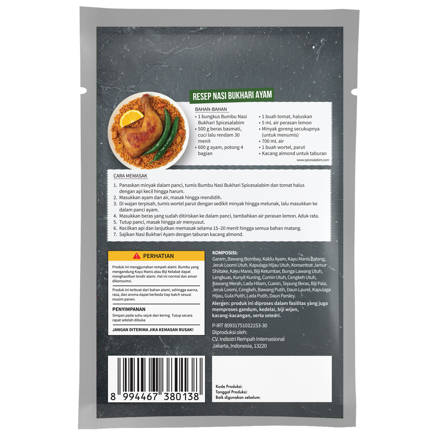 – Komposisi Bumbu Nasi Bukhari Spicesalabim – Garam, Bawang Bombay, Kaldu Ayam, Kayu Manis Batang, Jeruk Loomi Utuh, Kapulaga Hijau Utuh, Konsentrat Jamur Shiitake, Kayu Manis, Biji Ketumbar, Bunga Lawang Utuh, Lengkuas, Kunyit Kuning, Cumin Utuh, Cengkeh Utuh, Bawang Merah, Lada Hitam, Cumin, Tepung Beras, Biji Pala, Jeruk Loomi, Cengkeh, Bawang Putih, Daun Laurel, Kapulaga Hijau, Gula Putih, Lada Putih, Daun Parsley