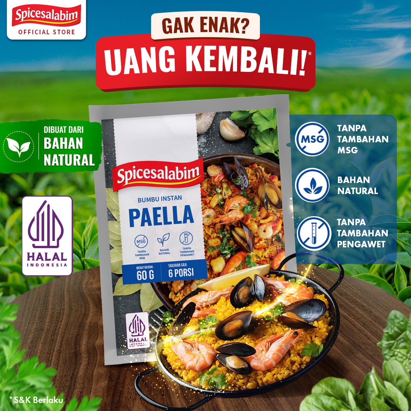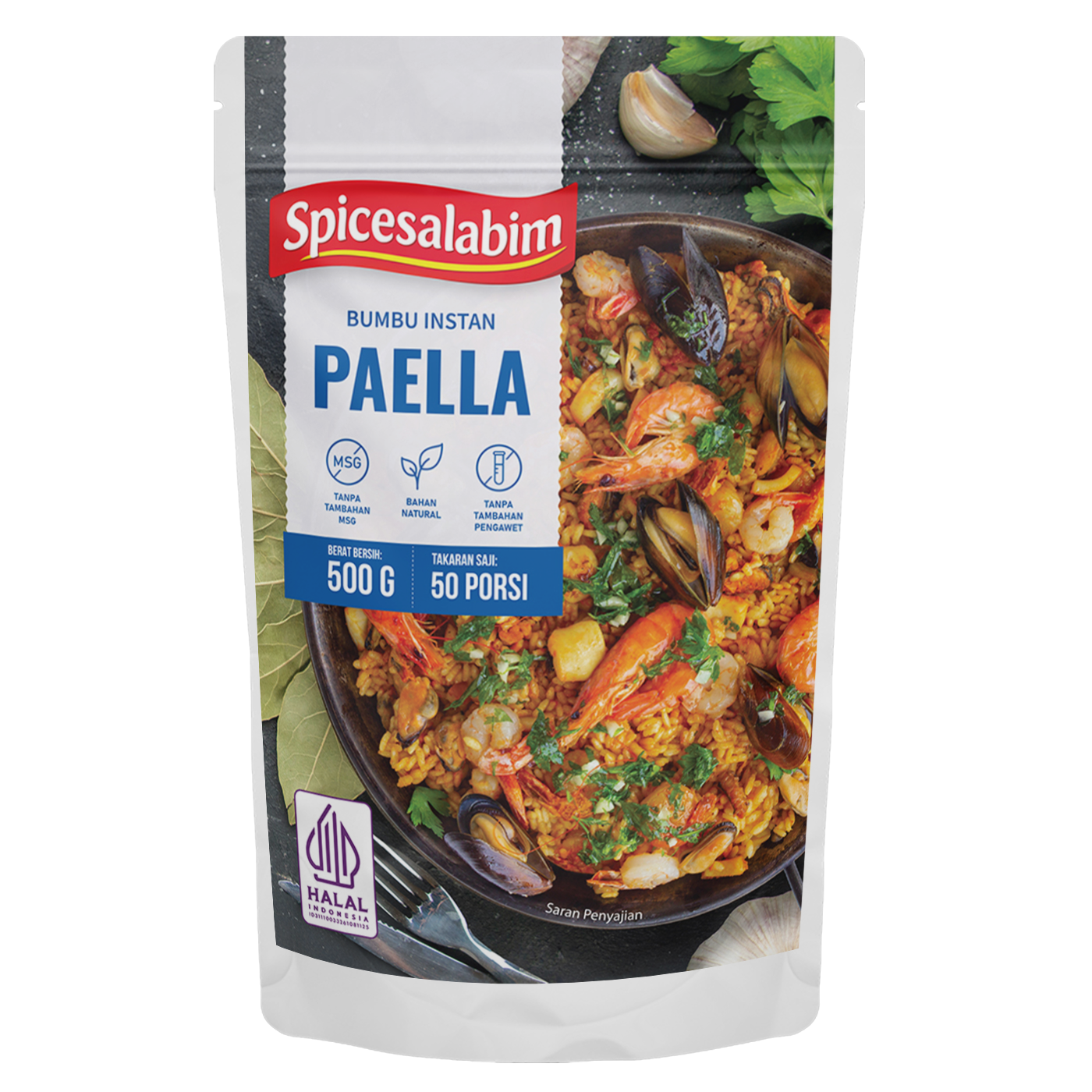Bumbu Paella Spicesalabim, bumbu instan yang diracik khusus buat kamu yang mau masak praktis dengan rempah yang natural. Terbuat dari rempah asli, tanpa tambahan MSG, tanpa pengawet, dan tanpa bahan berbahaya. Cukup satu bumbu untuk bikin masakan gurih, enak, dan sehat.