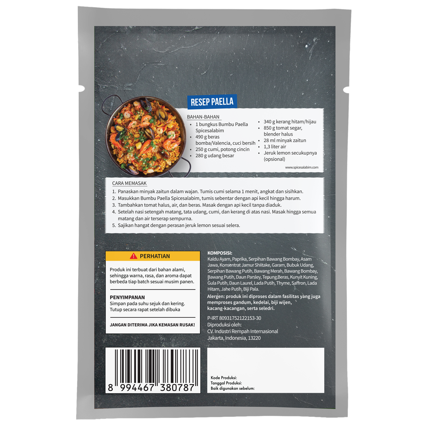 – Komposisi Bumbu Paella Spicesalabim – Kaldu Ayam, Paprika, Serpihan Bawang Bombay, Asam Jawa, Konsentrat Jamur Shiitake, Garam, Bubuk Udang, Serpihan Bawang Putih, Bawang Merah, Bawang Bombay, Bawang Putih, Daun Parsley, Tepung Beras, Kunyit Kuning, Gula Putih, Daun Laurel, Lada Putih, Thyme, Saffron, Lada Hitam, Jahe Putih, Biji Pala