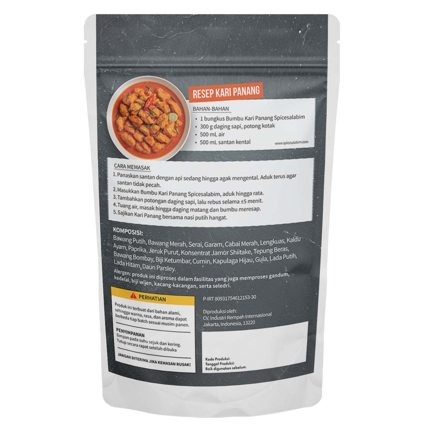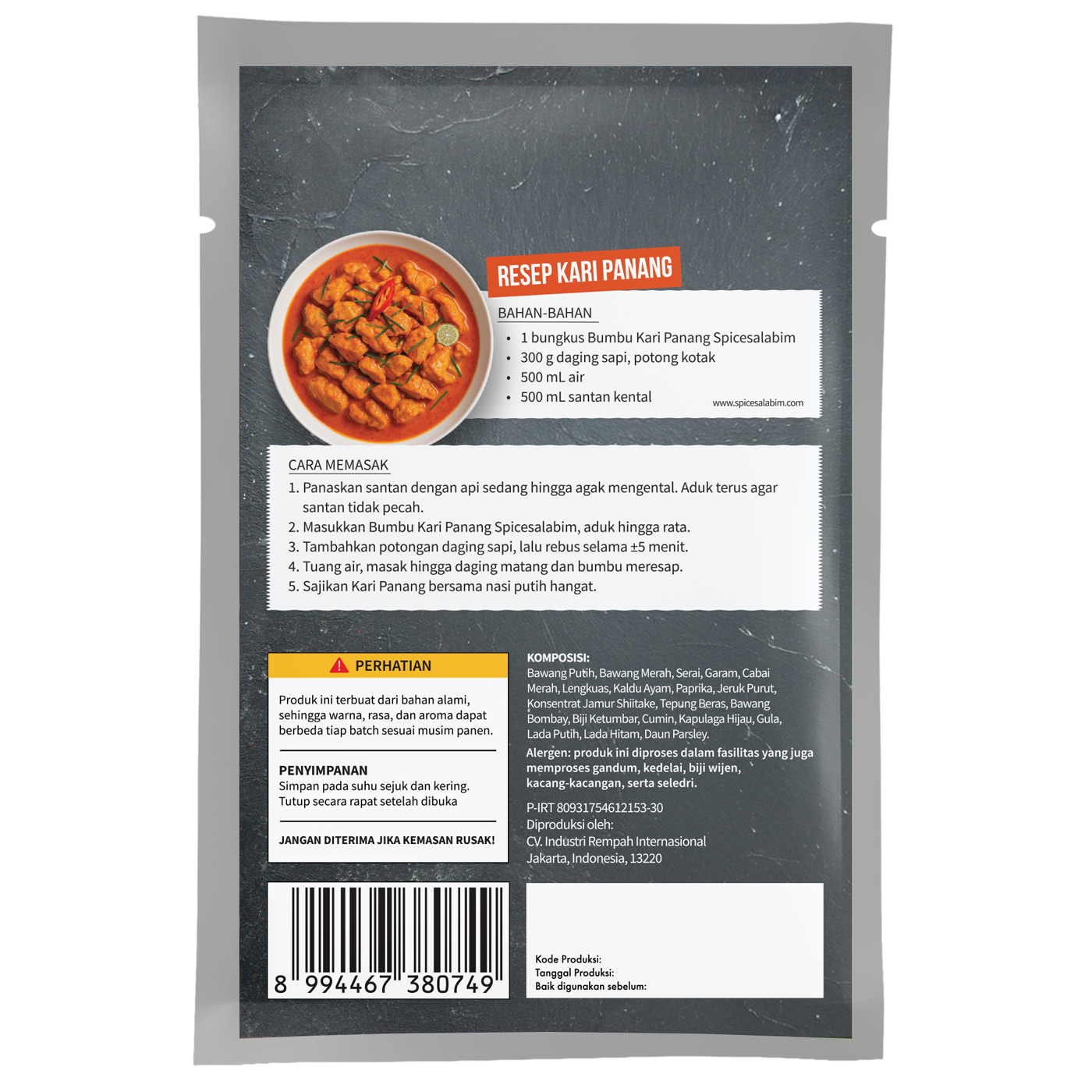 – Komposisi Bumbu Panang Curry Spicesalabim – Bawang Putih, Bawang Merah, Serai, Garam, Cabai Merah, Lengkuas, Kaldu Ayam, Paprika, Jeruk Purut, Konsentrat Jamur Shiitake, Tepung Beras, Bawang Bombay, Biji Ketumbar, Cumin, Kapulaga Hijau, Gula, Lada Putih, Lada Hitam, Daun Parsley