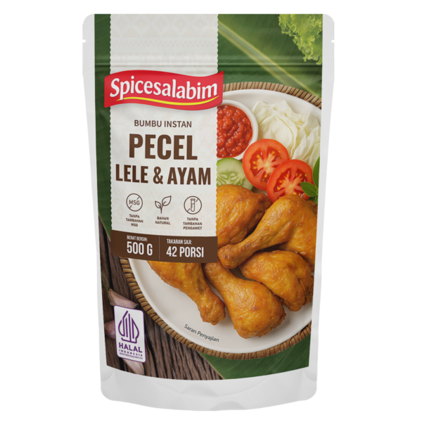 – Komposisi Bumbu Pecel Lele dan Ayam Spicesalabim – Biji Ketumbar, Garam, Kunyit Kuning, Kemiri, Bawang Merah, Jahe Putih, Konsentrat Jamur Shiitake, Bawang Putih, Lengkuas, Lada Putih, Tepung Beras, Serai