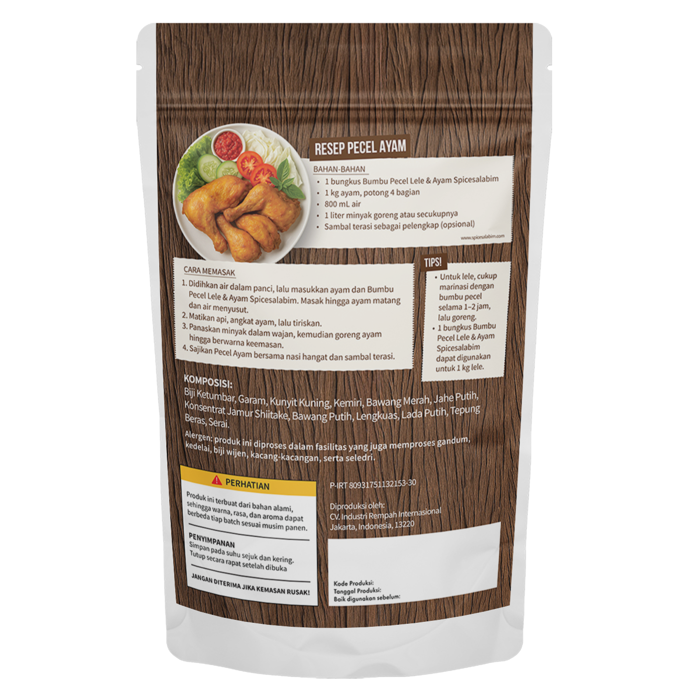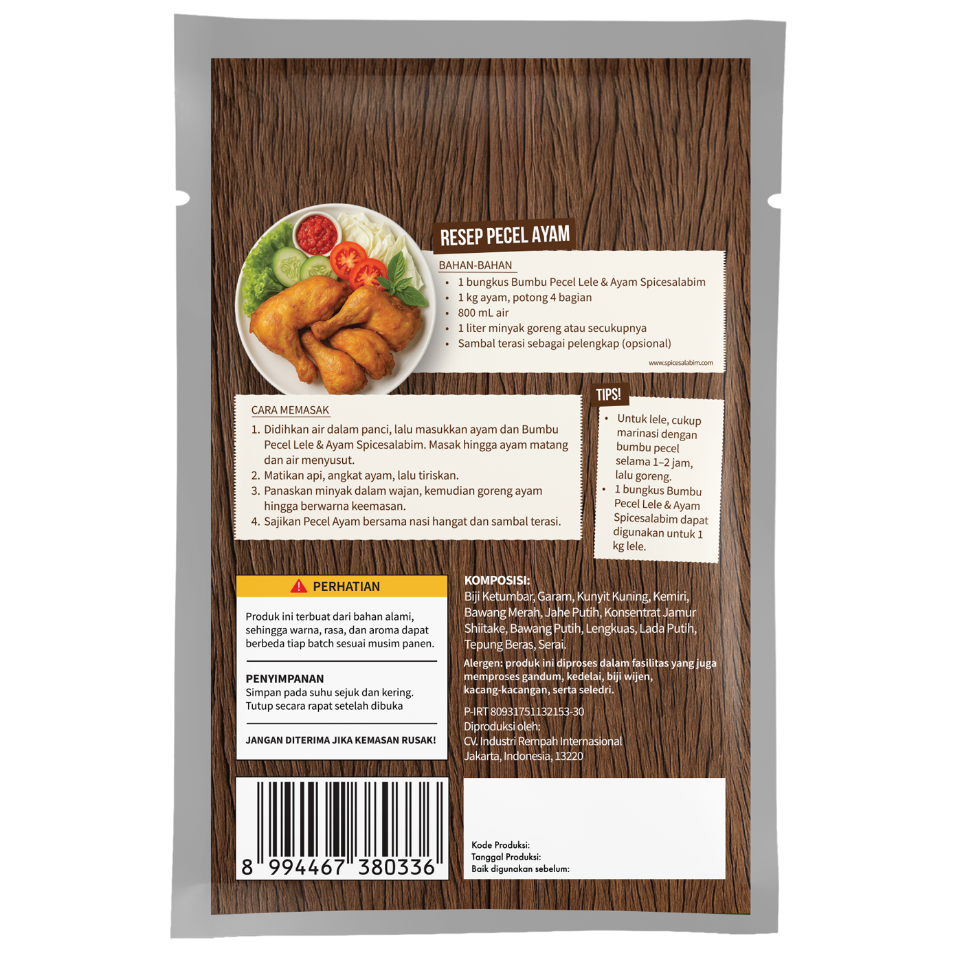 – Komposisi Bumbu Pecel Lele dan Ayam Spicesalabim – Biji Ketumbar, Garam, Kunyit Kuning, Kemiri, Bawang Merah, Jahe Putih, Konsentrat Jamur Shiitake, Bawang Putih, Lengkuas, Lada Putih, Tepung Beras, Serai