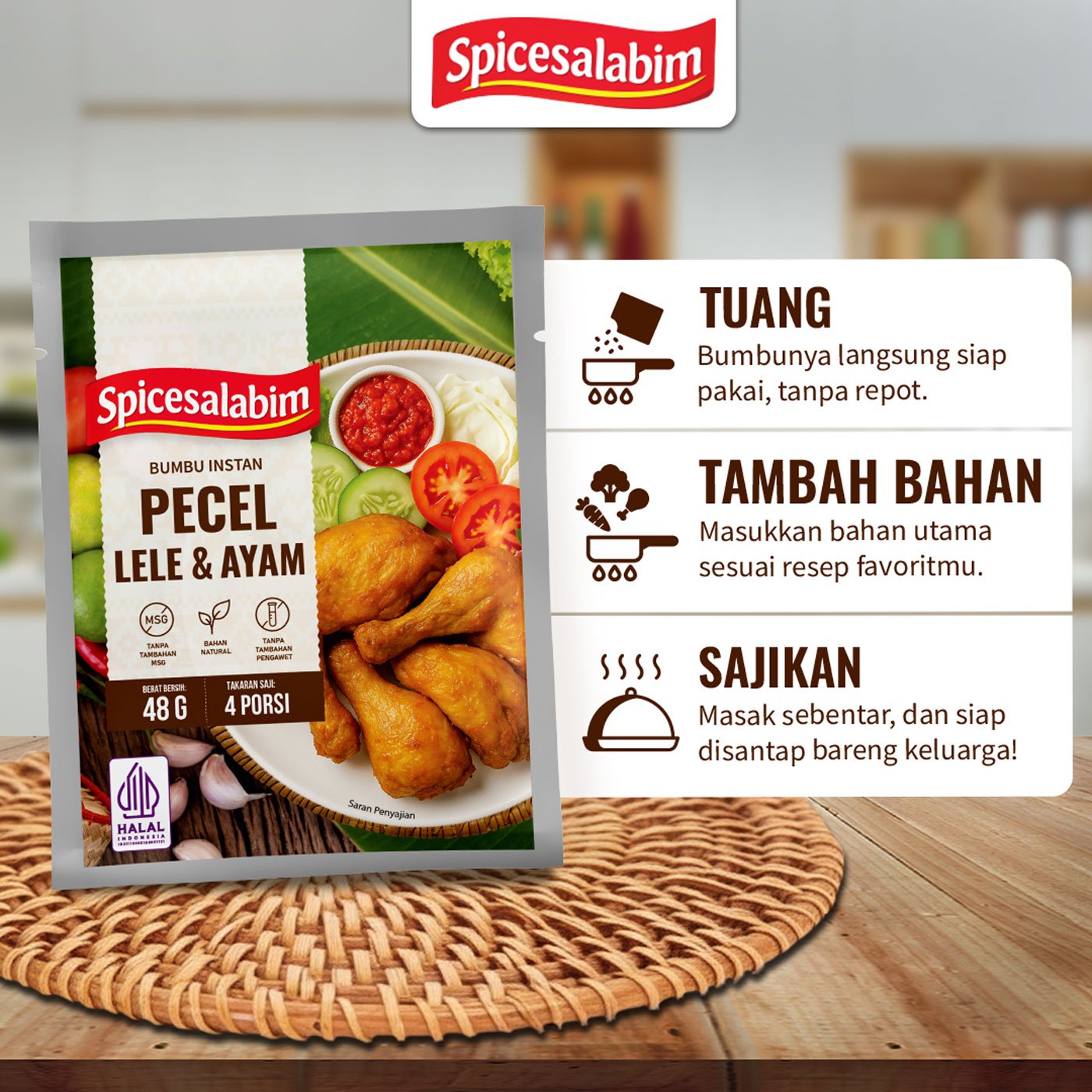 Bumbu Pecel Lele dan Ayam Spicesalabim, bumbu instan yang diracik khusus buat kamu yang mau masak praktis dengan rempah yang natural. Terbuat dari rempah asli, tanpa tambahan MSG, tanpa pengawet, dan tanpa bahan berbahaya. Cukup satu bumbu untuk bikin masakan gurih, enak, dan sehat.