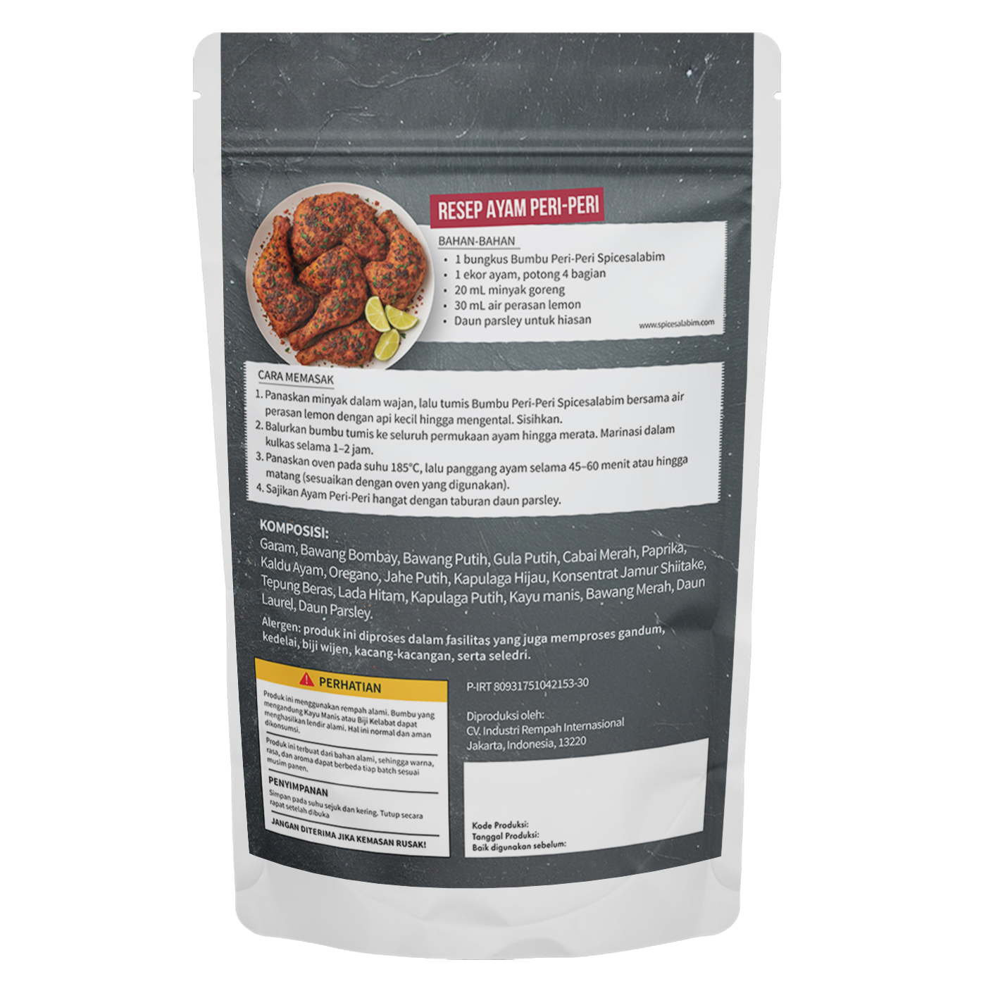 ✔ Komposisi Bumbu Peri Peri Spicesalabim – Garam, Bawang Bombay, Bawang Putih, Gula Putih, Cabai Merah, Paprika, Kaldu Ayam, Oregano, Jahe Putih, Kapulaga Hijau, Konsentrat Jamur Shiitake, Tepung Beras, Lada Hitam, Kapulaga Putih, Kayu manis, Bawang Merah, Daun Laurel, Daun Parsley