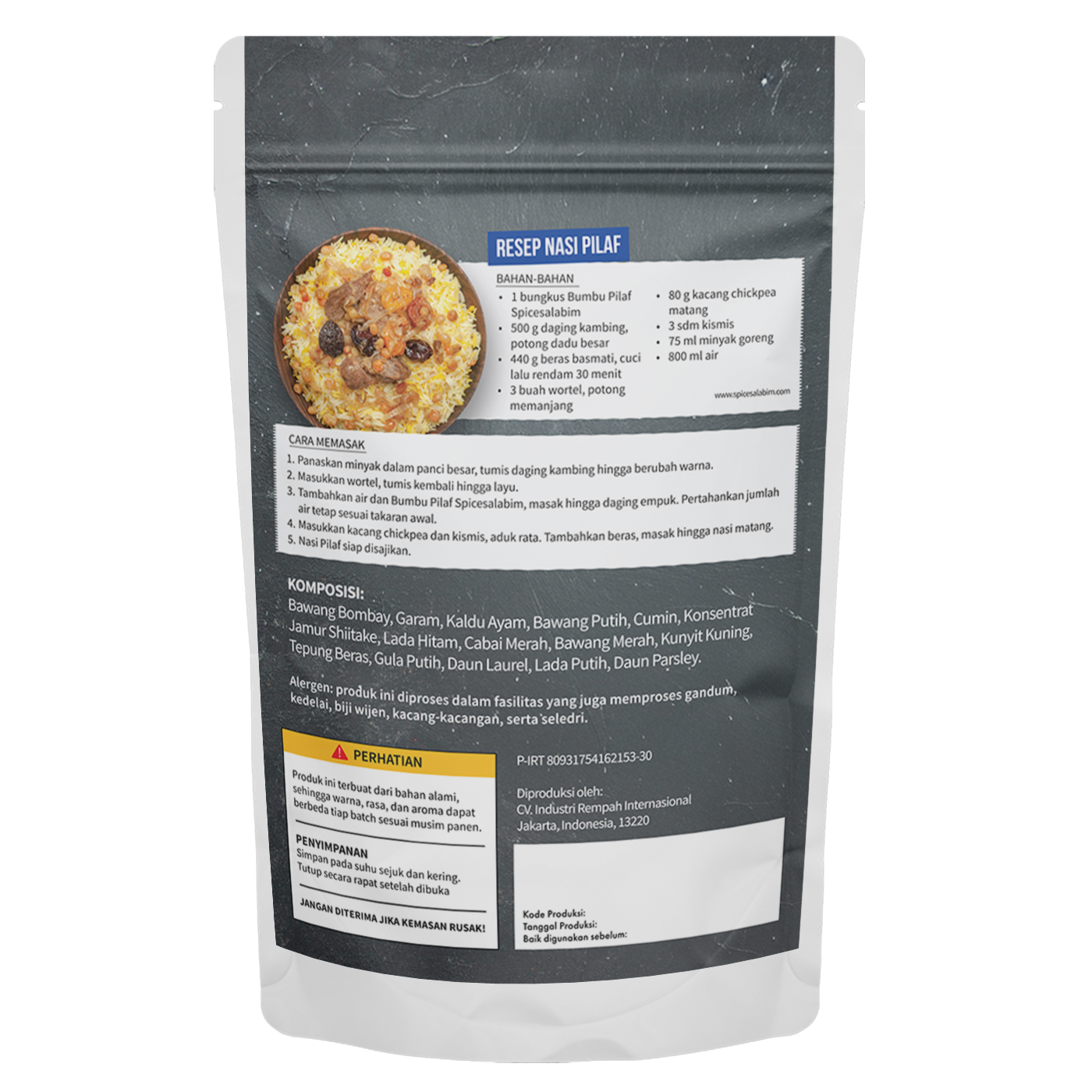 – Komposisi Bumbu Pilaf Spicesalabim – Bawang Bombay, Garam, Kaldu Ayam, Bawang Putih, Cumin, Konsentrat Jamur Shiitake, Lada Hitam, Cabai Merah, Bawang Merah, Kunyit Kuning, Tepung Beras, Gula Putih, Daun Laurel, Lada Putih, Daun Parsley