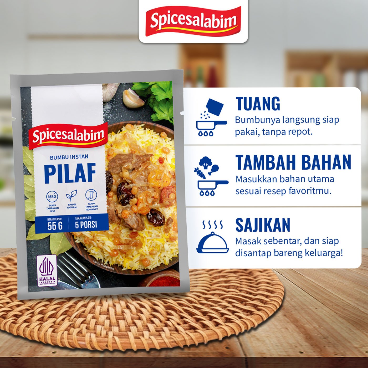 Bumbu Pilaf Spicesalabim, bumbu instan yang diracik khusus buat kamu yang mau masak praktis dengan rempah yang natural. Terbuat dari rempah asli, tanpa tambahan MSG, tanpa pengawet, dan tanpa bahan berbahaya. Cukup satu bumbu untuk bikin masakan gurih, enak, dan sehat.