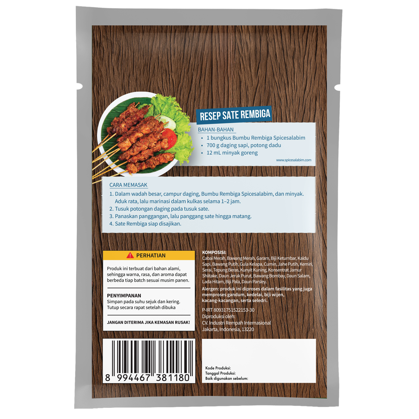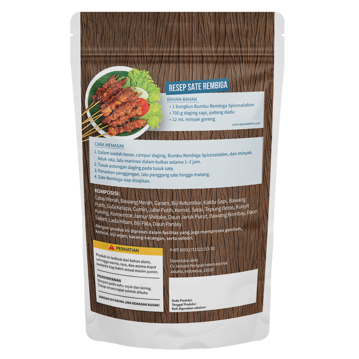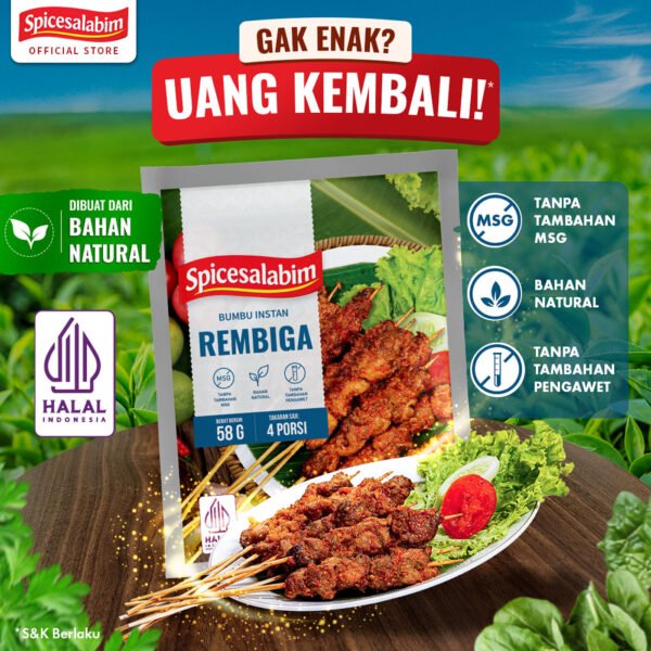 – Komposisi Bumbu Rembiga Spicesalabim – Cabai Merah, Bawang Merah, Garam, Biji Ketumbar, Kaldu Sapi, Bawang Putih, Gula Kelapa, Cumin, Jahe Putih, Kemiri, Serai, Tepung Beras, Kunyit Kuning, Konsentrat Jamur Shiitake, Daun Jeruk Purut, Bawang Bombay, Daun Salam, Lada Hitam, Biji Pala, Daun Parsley