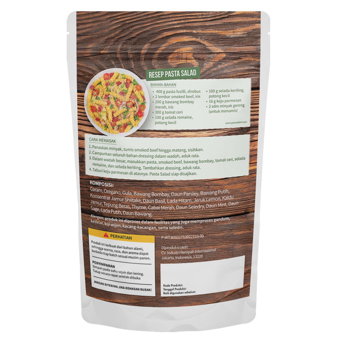 – Komposisi Bumbu Salad Dressing Spicesalabim – Garam, Oregano, Gula, Bawang Bombay, Daun Parsley, Bawang Putih, Konsentrat Jamur Shiitake, Daun Basil, Lada Hitam, Jeruk Lemon, Kaldu Jamur, Tepung Beras, Thyme, Cabai Merah, Daun Seledry, Daun Mint, Daun Sage, Lada Putih, Daun Bawang