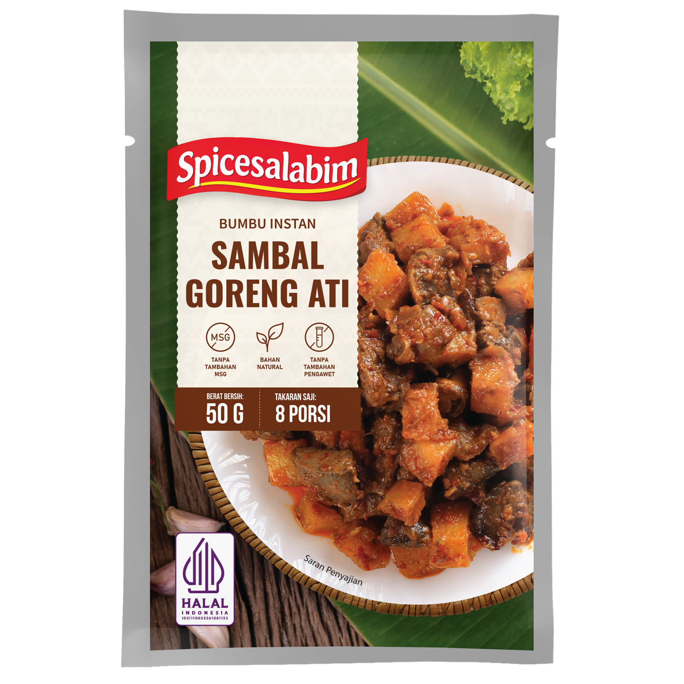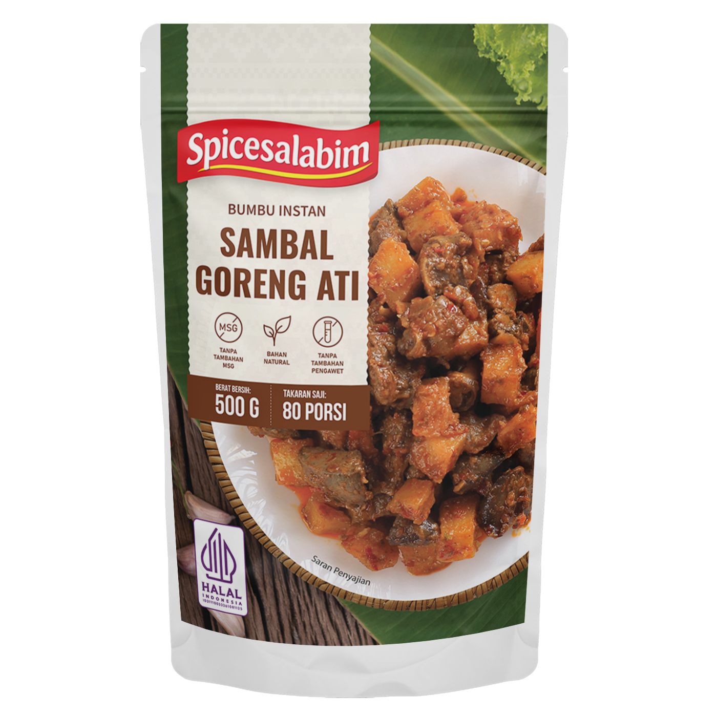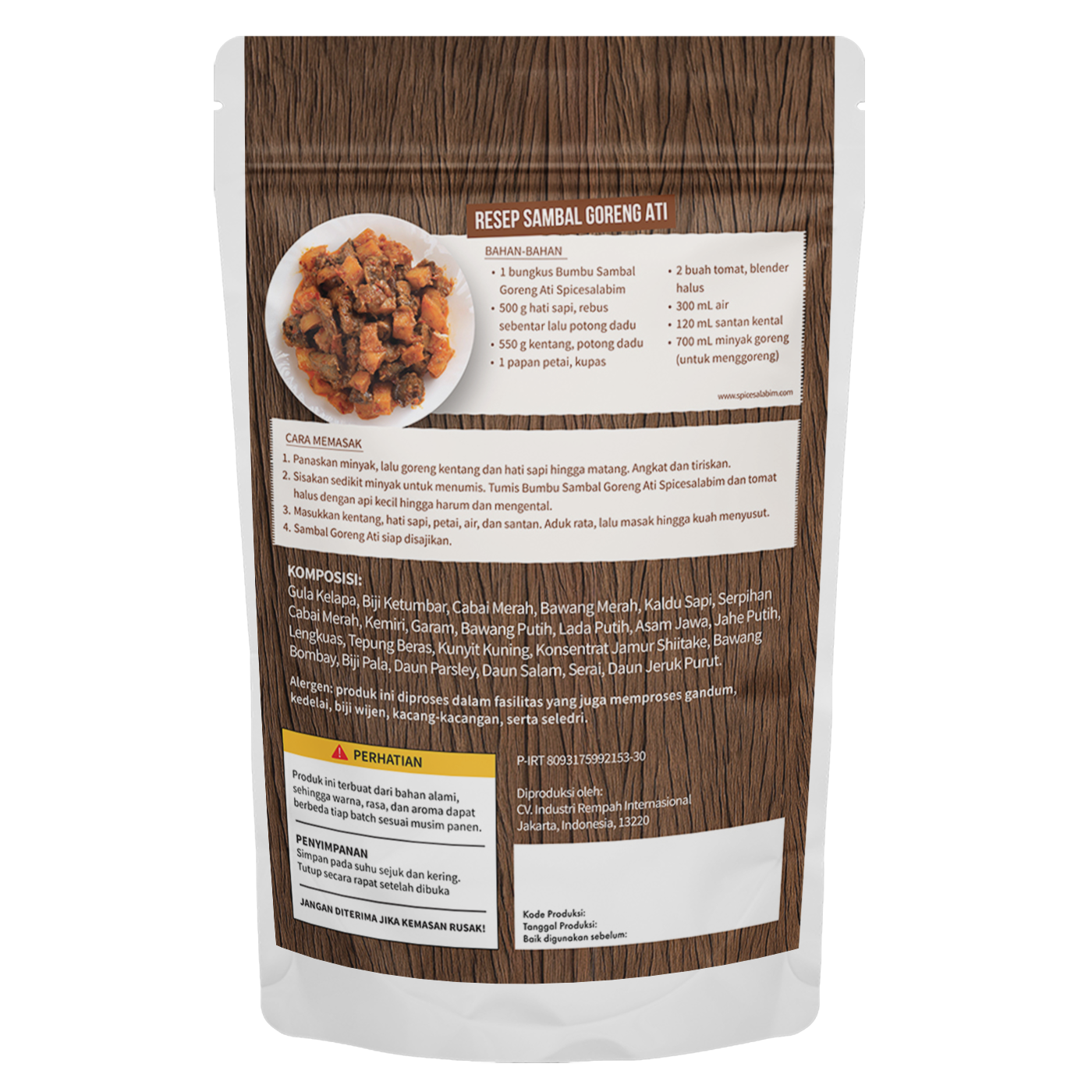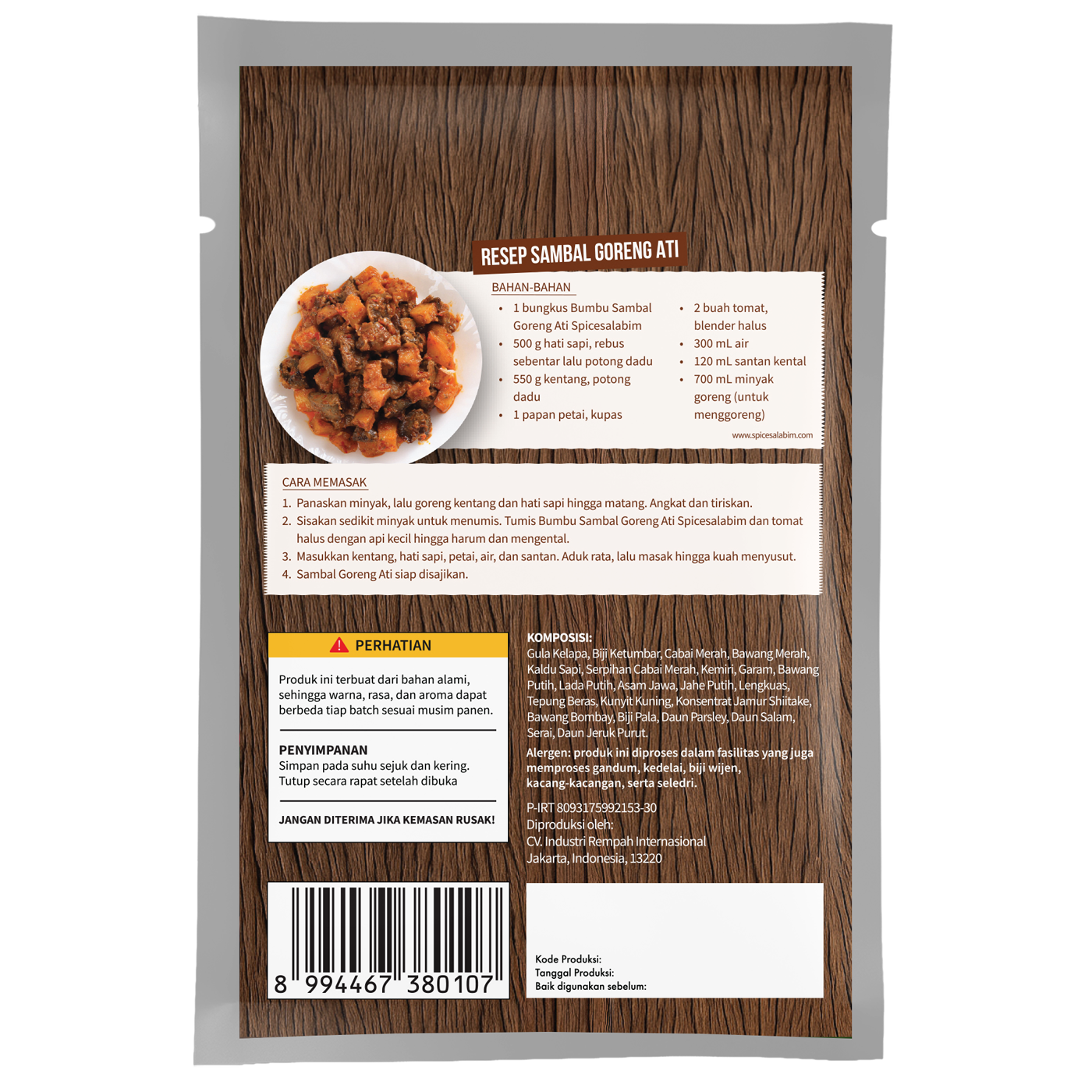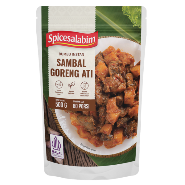 – Komposisi Bumbu Sambal Goreng Ati Spicesalabim – Gula Gula Kelapa, Biji Ketumbar, Cabai Merah, Bawang Merah, Kaldu Sapi, Serpihan Cabai Merah, Kemiri, Garam, Bawang Putih, Lada Putih, Asam Jawa, Jahe Putih, Lengkuas, Tepung Beras, Kunyit Kuning, Konsentrat Jamur Shiitake, Bawang Bombay, Biji Pala, Daun Parsley, Daun Salam, Serai, Daun Jeruk Purut