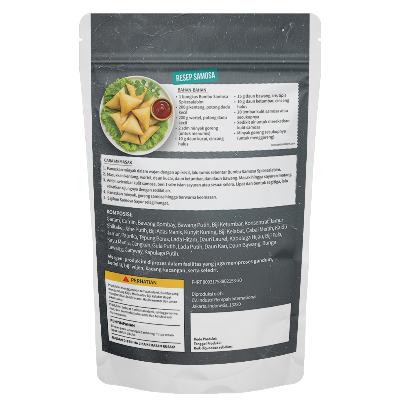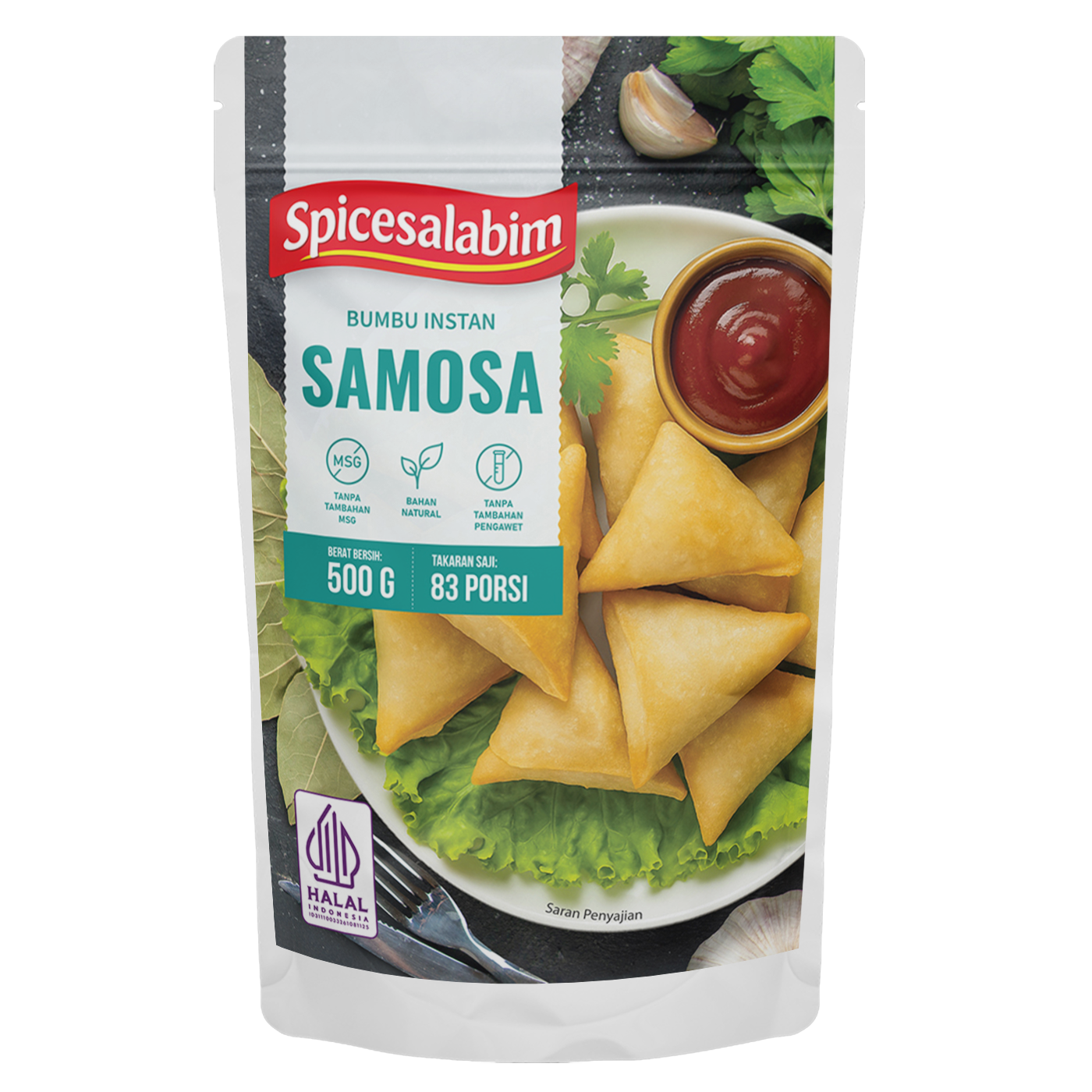 – Komposisi Bumbu Samosa Spicesalabim – Garam, Cumin, Bawang Bombay, Bawang Putih, Biji Ketumbar, Konsentrat Jamur Shiitake, Jahe Putih, Biji Adas Manis, Kunyit Kuning, Biji Kelabat, Cabai Merah, Kaldu Jamur, Paprika, Tepung Beras, Lada Hitam, Daun Laurel, Kapulaga Hijau, Biji Pala, Kayu Manis, Cengkeh, Gula Putih, Lada Putih, Daun Kari, Daun Bawang, Bunga Lawang, Caraway, Kapulaga Putih