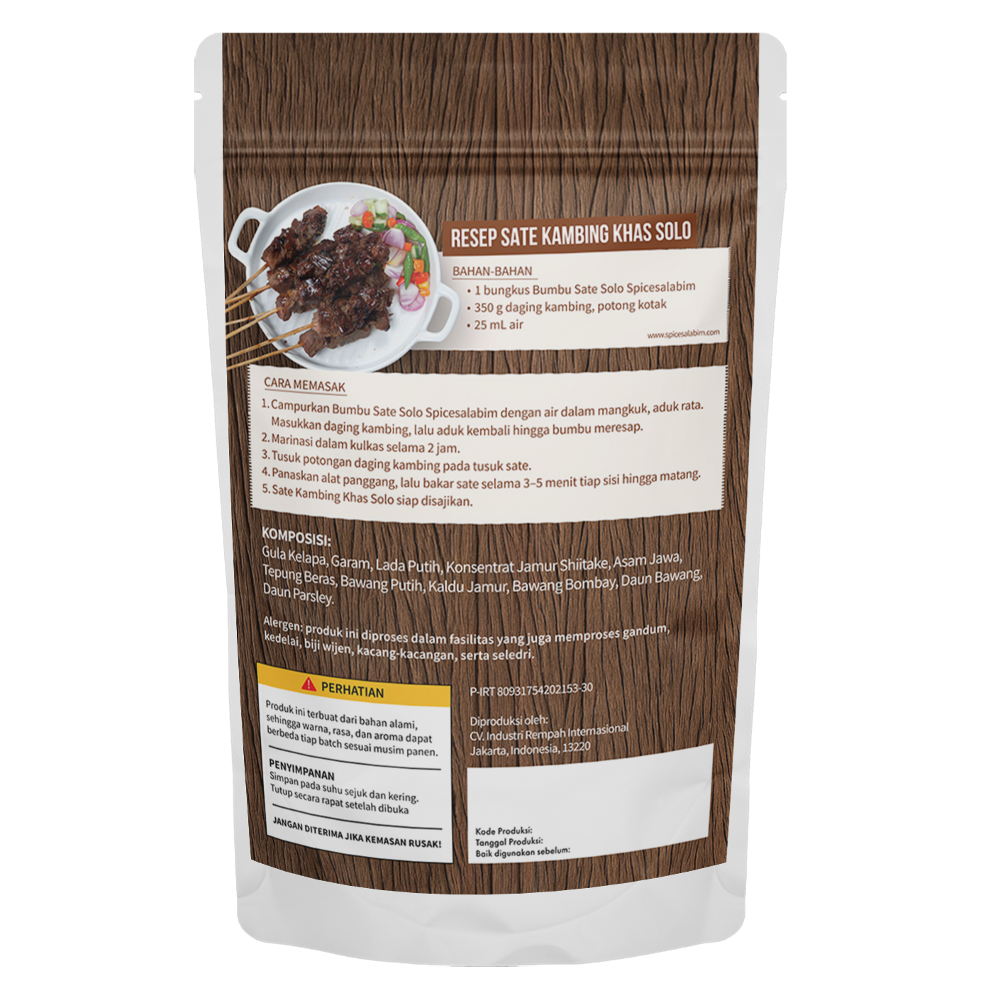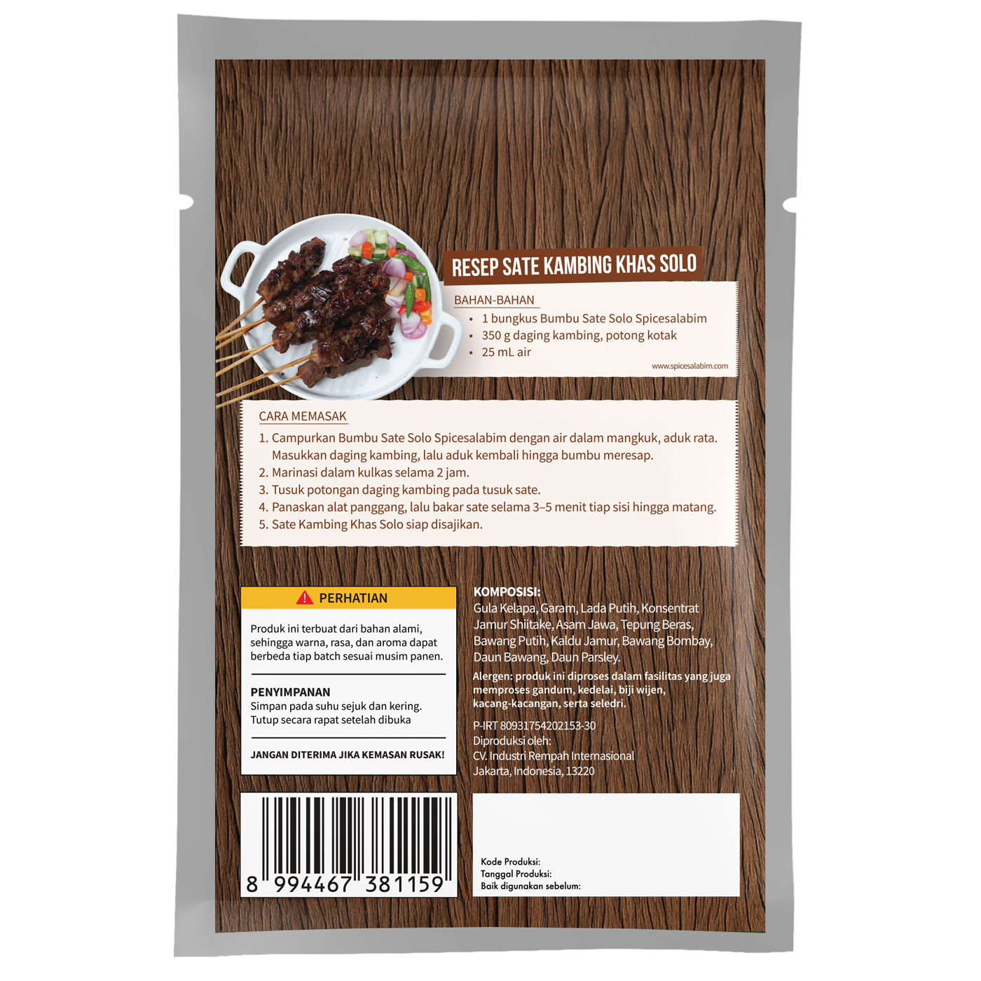 – Komposisi Bumbu Sate Solo Spicesalabim – Gula Kelapa, Garam, Lada Putih, Konsentrat Jamur Shiitake, Asam Jawa, Tepung Beras, Bawang Putih, Kaldu Jamur, Bawang Bombay, Daun Bawang, Daun Parsley