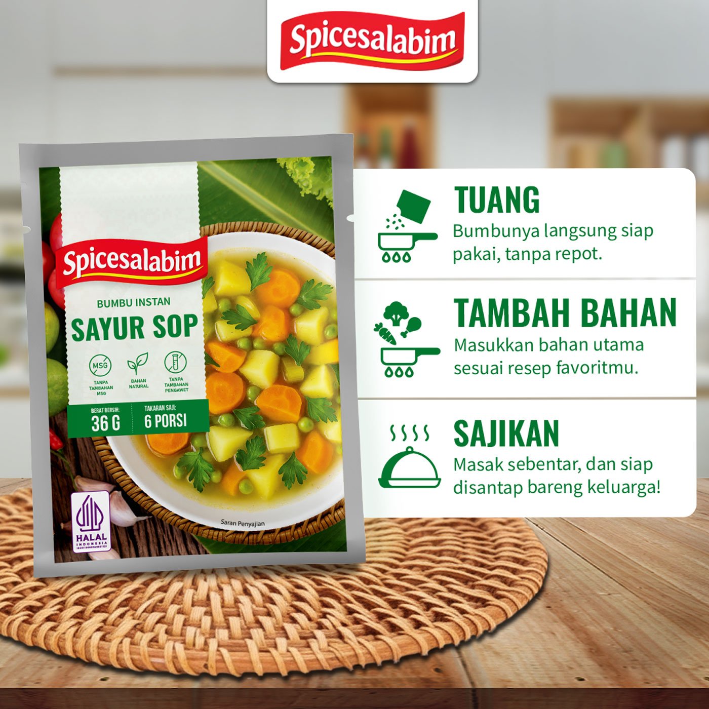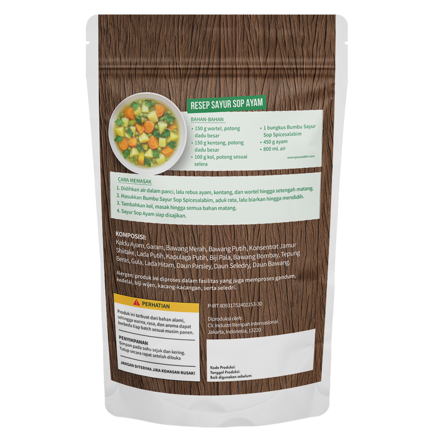 – Komposisi Bumbu Sayur Sop Spicesalabim – Kaldu Ayam, Garam, Bawang Merah, Bawang Putih, Konsentrat Jamur Shiitake, Lada Putih, Kapulaga Putih, Biji Pala, Bawang Bombay, Tepung Beras, Gula, Lada Hitam, Daun Parsley, Daun Seledry, Daun Bawang