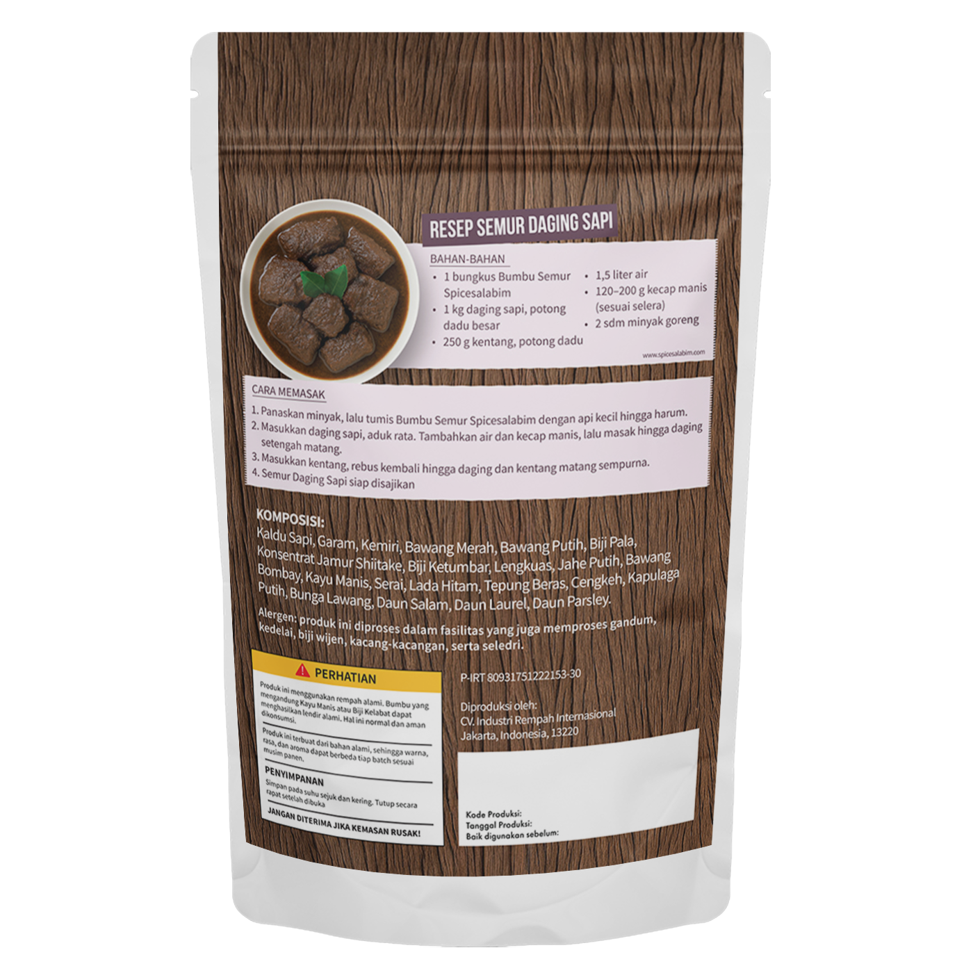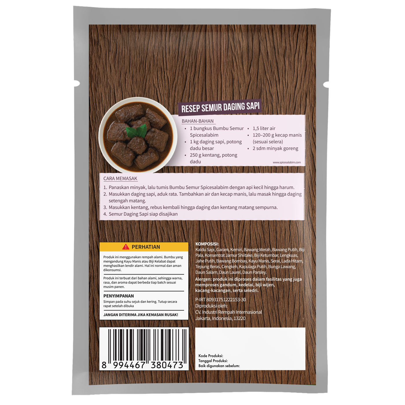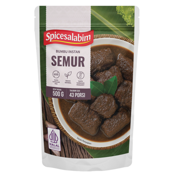 – Komposisi Bumbu Semur Spicesalabim – Kaldu Sapi, Garam, Kemiri, Bawang Merah, Bawang Putih, Biji Pala, Konsentrat Jamur Shiitake, Biji Ketumbar, Lengkuas, Jahe Putih, Bawang Bombay, Kayu Manis, Serai, Lada Hitam, Tepung Beras, Cengkeh, Kapulaga Putih, Bunga Lawang, Daun Salam, Daun Laurel, Daun Parsley