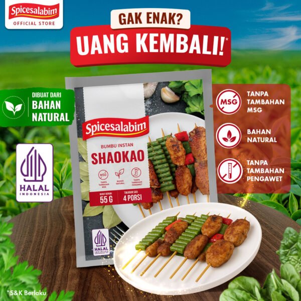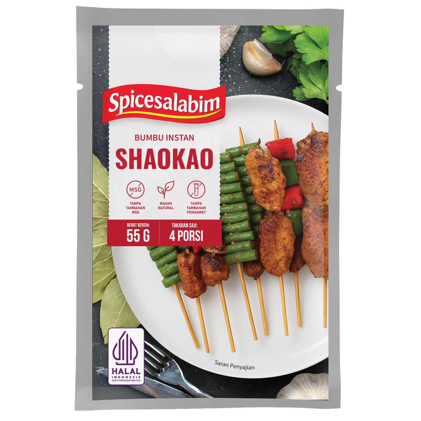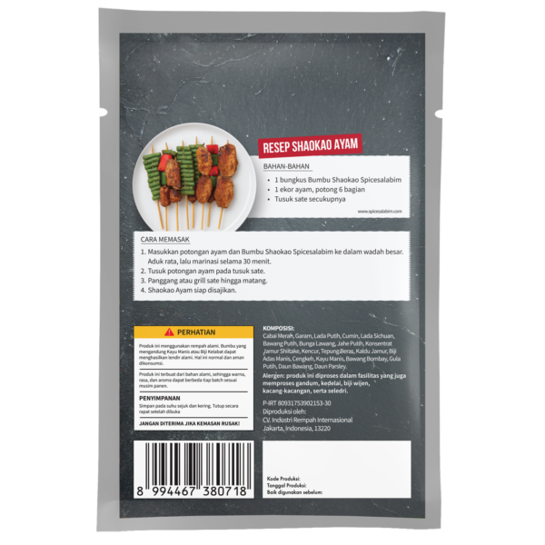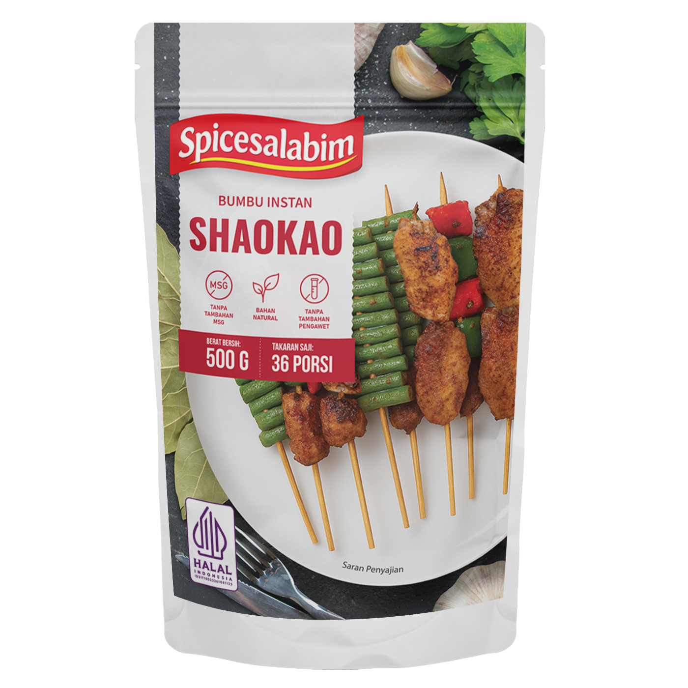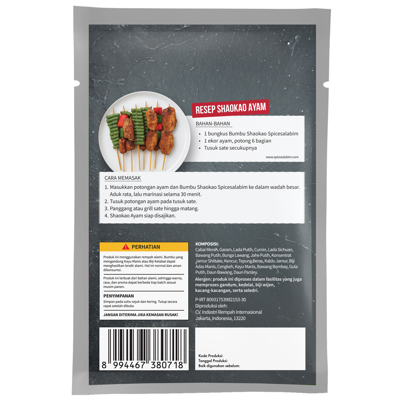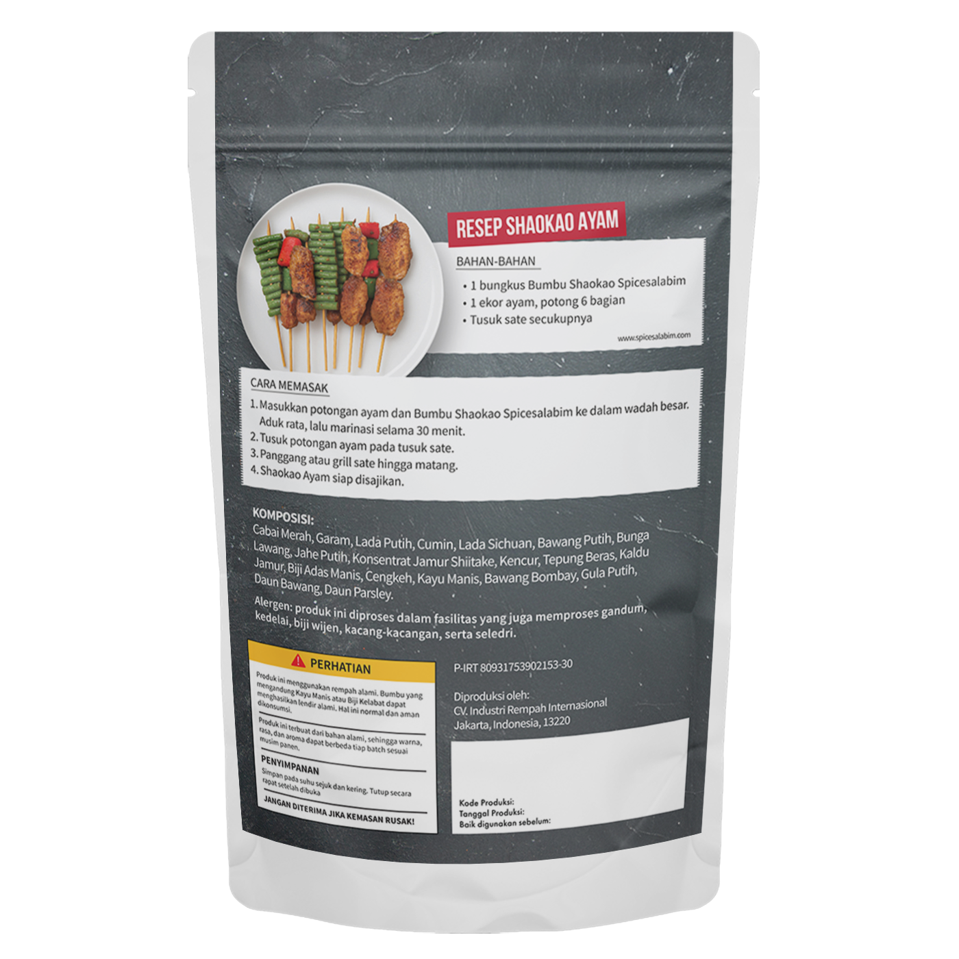 – Komposisi Bumbu Shaokao Spicesalabim – Cabai Merah, Garam, Lada Putih, Cumin, Lada Sichuan, Bawang Putih, Bunga Lawang, Jahe Putih, Konsentrat Jamur Shiitake, Kencur, Tepung Beras, Kaldu Jamur, Biji Adas Manis, Cengkeh, Kayu Manis, Bawang Bombay, Gula Putih, Daun Bawang, Daun Parsley