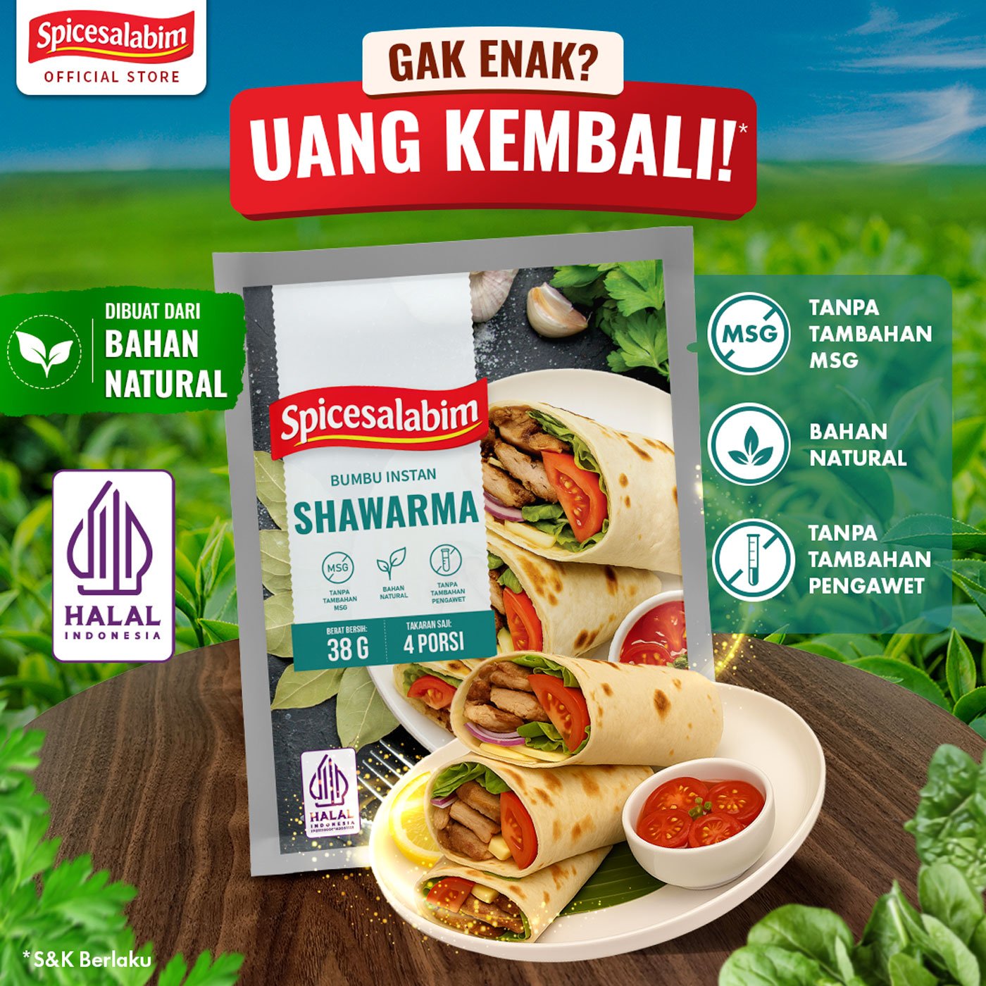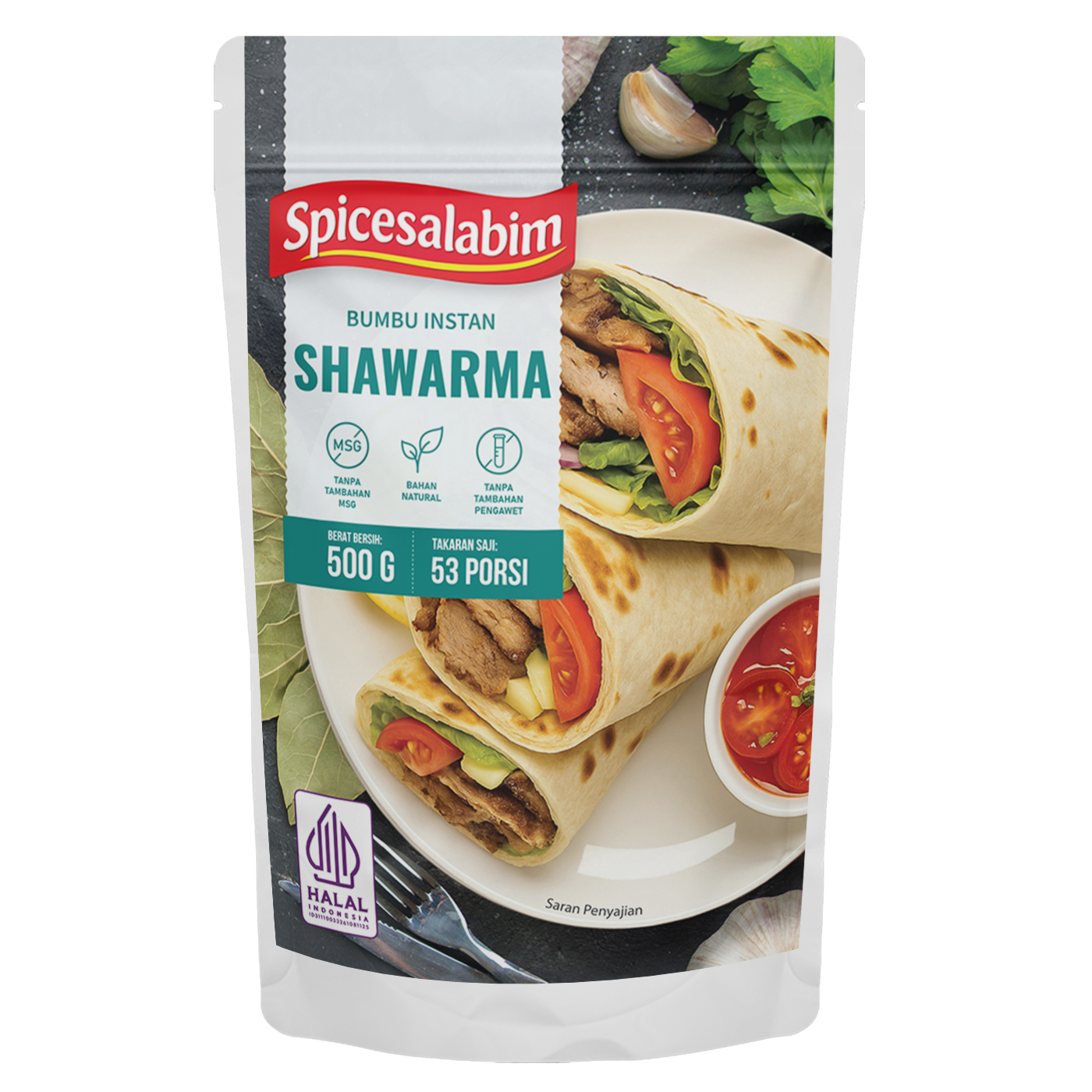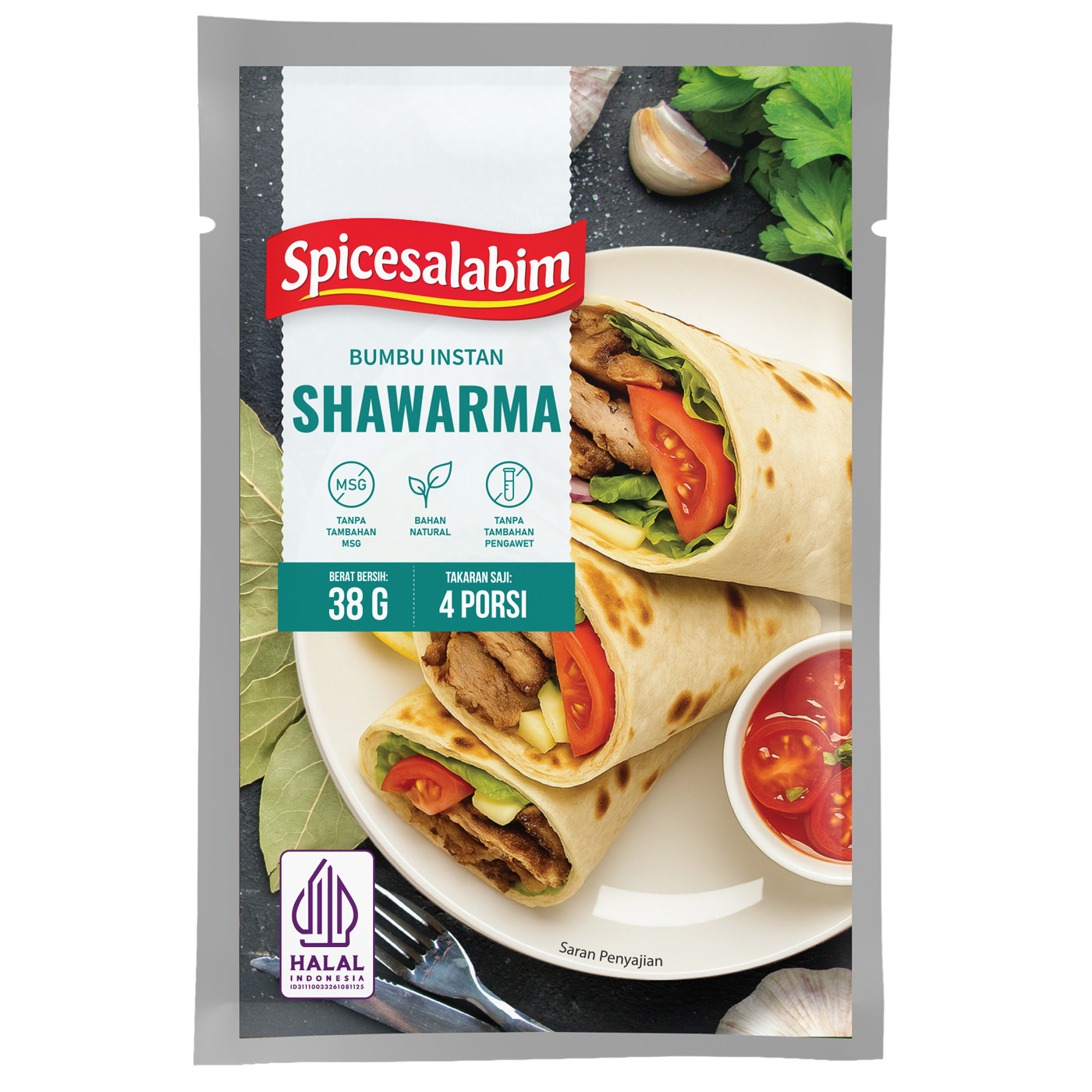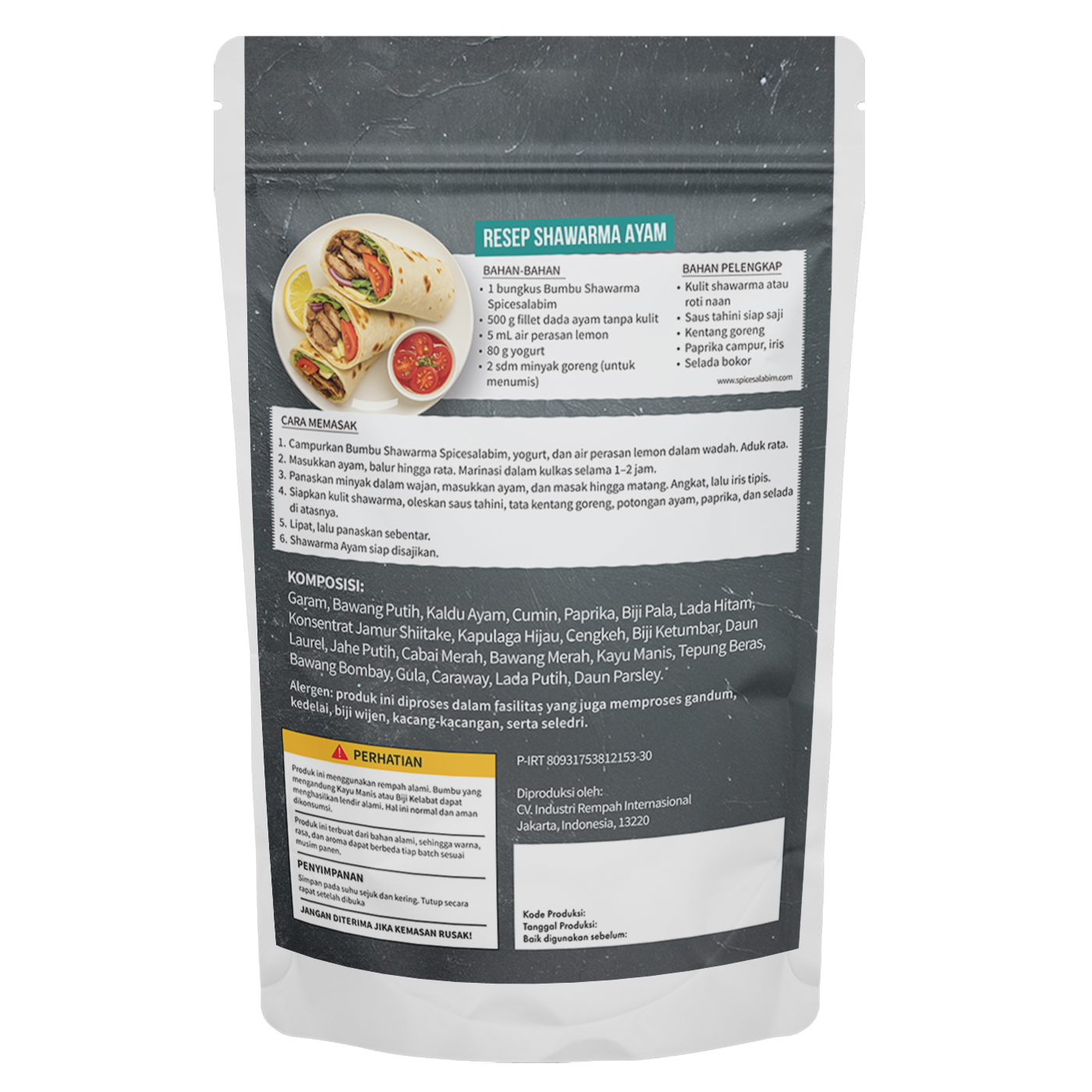 – Komposisi Bumbu Shawarma Spicesalabim – Garam, Bawang Putih, Kaldu Ayam, Cumin, Paprika, Biji Pala, Lada Hitam, Konsentrat Jamur Shiitake, Kapulaga Hijau, Cengkeh, Biji Ketumbar, Daun Laurel, Jahe Putih, Cabai Merah, Bawang Merah, Kayu Manis, Tepung Beras, Bawang Bombay, Gula, Caraway, Lada Putih, Daun Parsley