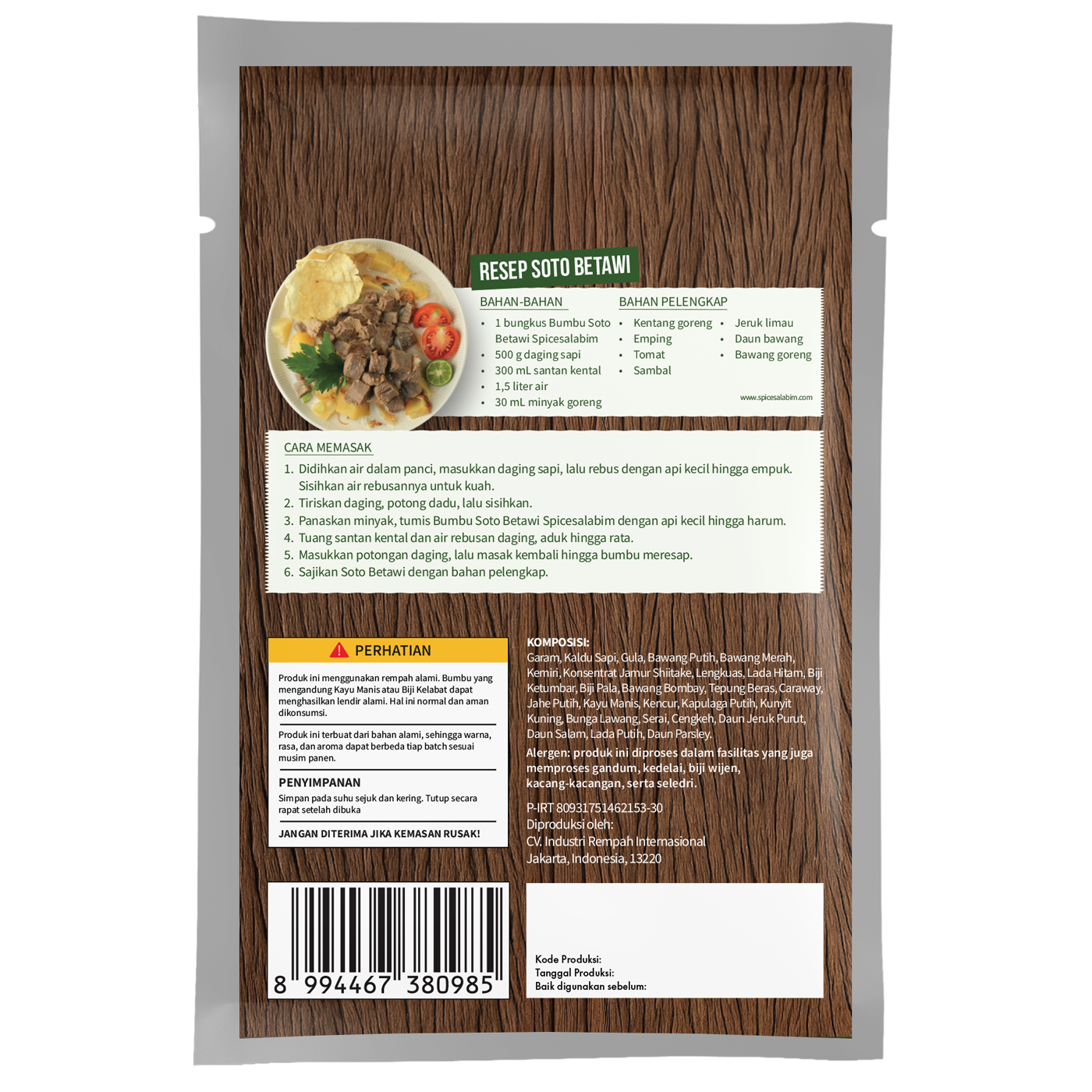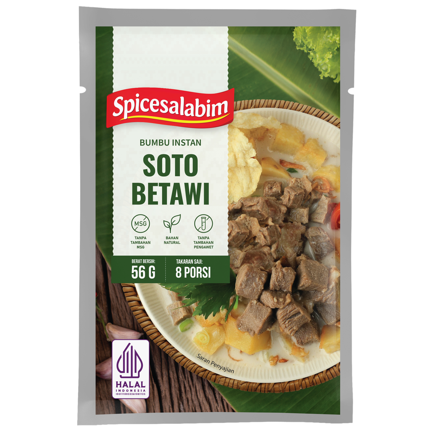 – Komposisi Bumbu Soto Betawi Spicesalabim – Garam, Kaldu Sapi, Gula, Bawang Putih, Bawang Merah, Kemiri, Konsentrat Jamur Shiitake, Lengkuas, Lada Hitam, Biji Ketumbar, Biji Pala, Bawang Bombay, Tepung Beras, Caraway, Jahe Putih, Kayu Manis, Kencur, Kapulaga Putih, Kunyit Kuning, Bunga Lawang, Serai, Cengkeh, Daun Jeruk Purut, Daun Salam, Lada Putih, Daun Parsley