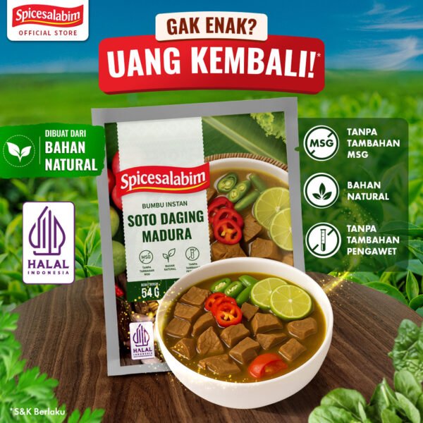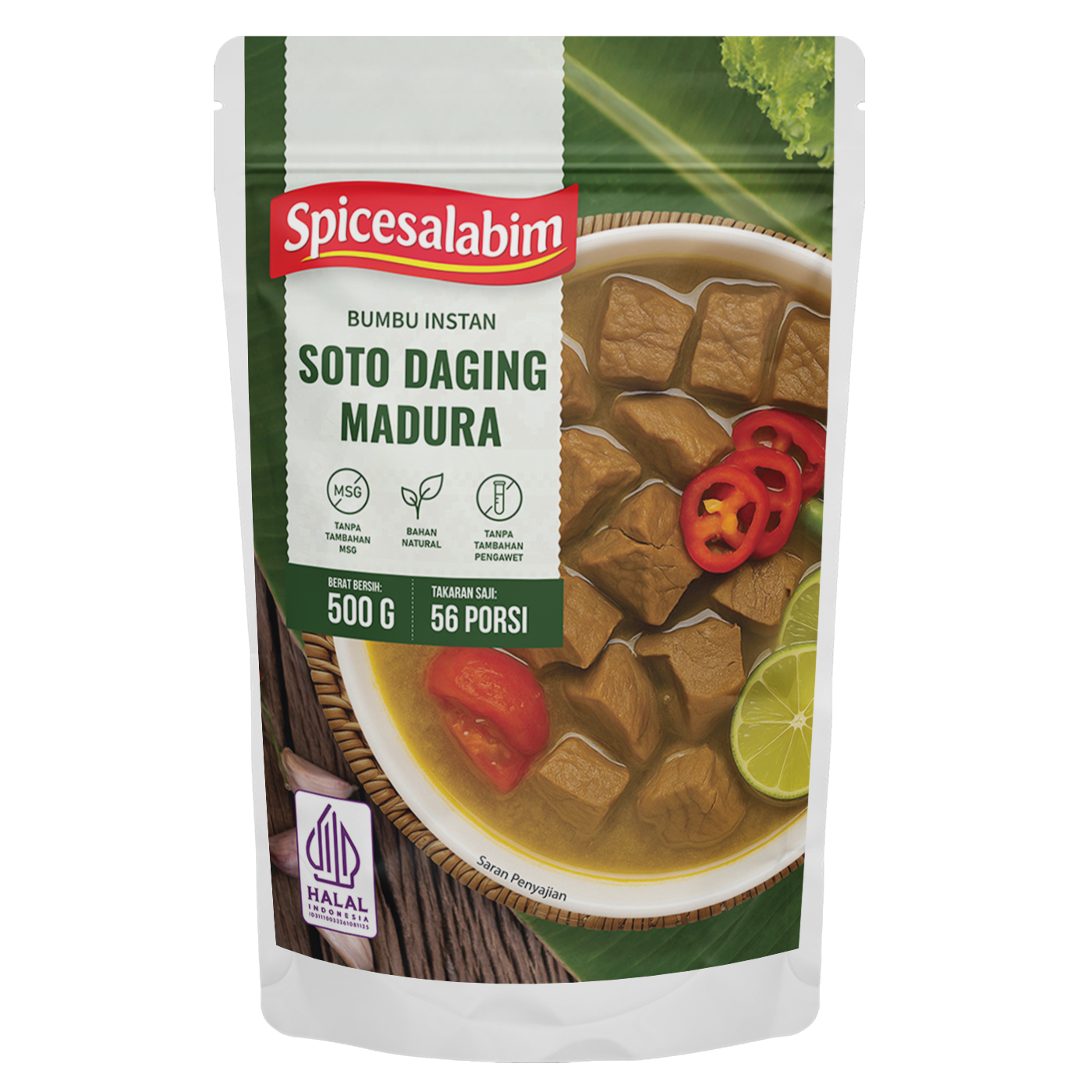 Bumbu Soto Daging Madura Spicesalabim, bumbu instan yang diracik khusus buat kamu yang mau masak praktis dengan rempah yang natural. Terbuat dari rempah asli, tanpa tambahan MSG, tanpa pengawet, dan tanpa bahan berbahaya. Cukup satu bumbu untuk bikin masakan gurih, enak, dan sehat.