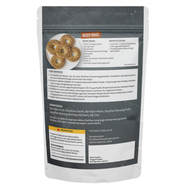 Spicesalabim Bumbu Taburan Bagel adalah bumbu tabur instan siap pakai yang dirancang untuk menghadirkan rasa khas everything bagel di rumah Anda. Bumbu ini cocok untuk taburan roti, salad, kentang, dan aneka camilan. Menggabungkan rempah pilihan, garam, dan bumbu pelengkap yang ditakar untuk sekali pakai, cukup satu sachet yang praktis tanpa perlu menyiapkan bumbu tambahan.